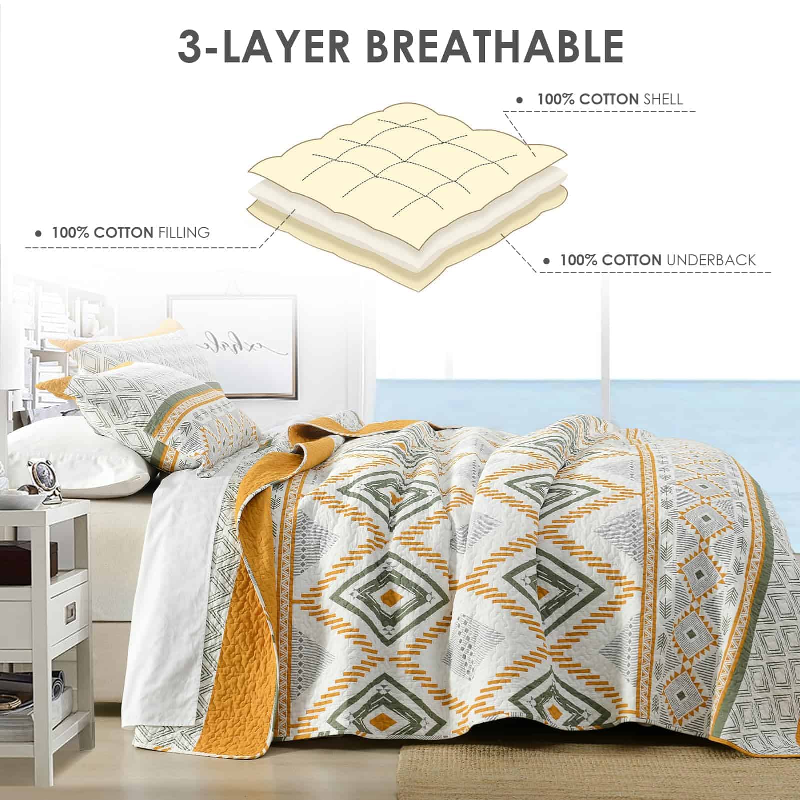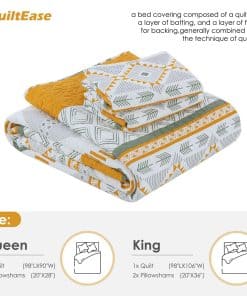 4. CONFORT PARA TODAS LAS ESTACIONES – El juego de ropa de cama acolchado QuiltEase es 100% algodón, bien cosido con un toque súper suave. Puedes usarlo perfectamente con un edredón para mantenerte caliente en la temporada fría o como cubrecama acolchado en verano o en una habitación con aire acondicionado. Este juego de cama de colcha transpirable será un gran regalo para las personas que constantemente sufren de sudor durante el sueño.