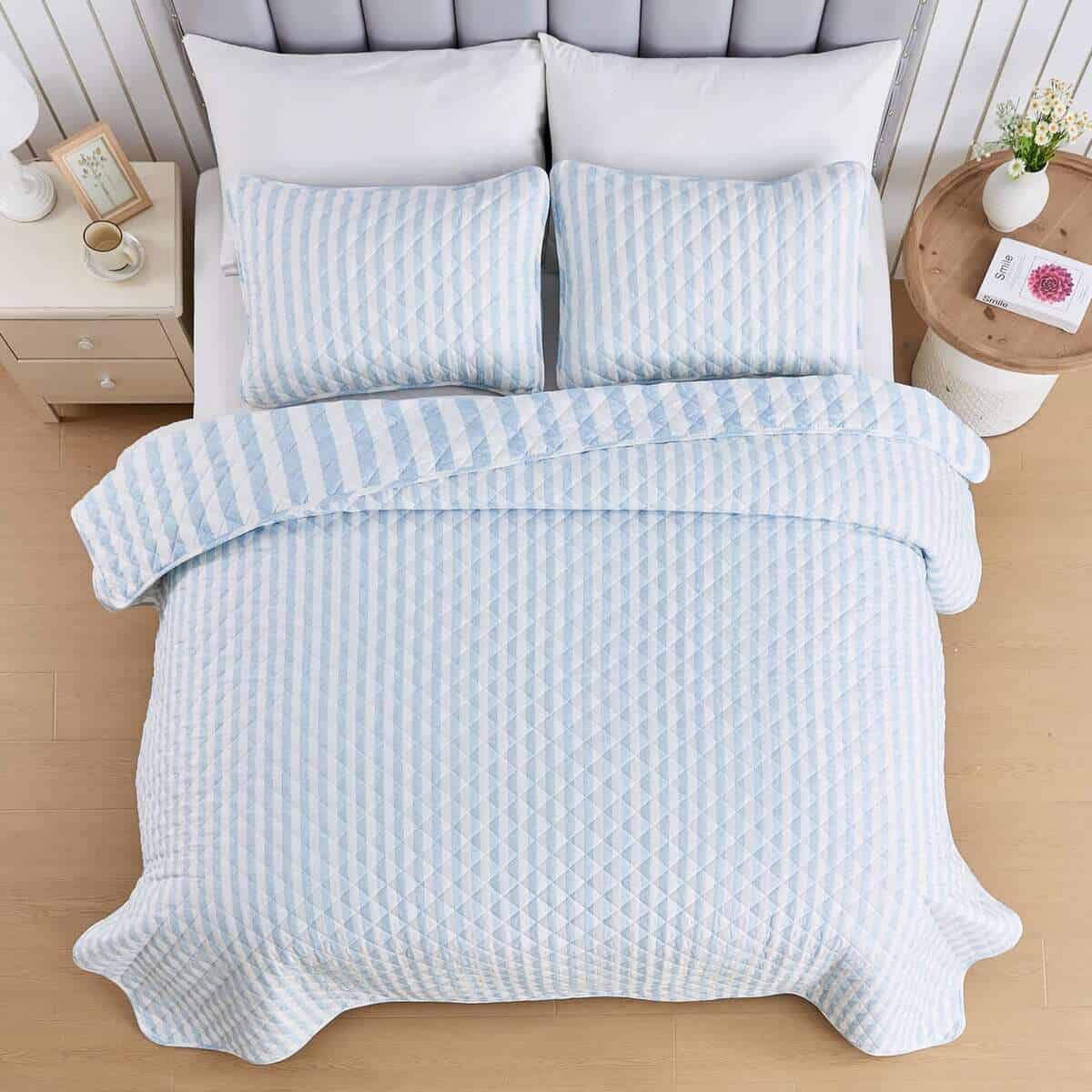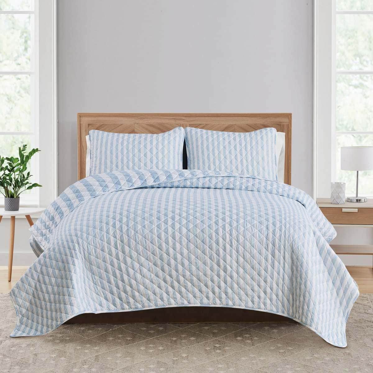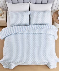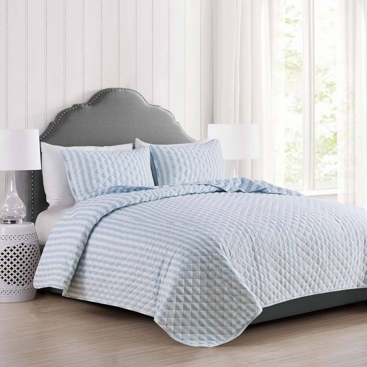 Agrega comodidad casual con un toque moderno a tu hogar con este hermoso Juego de Colcha Reversible de 3 Piezas de la Colección Avery de Market & Place. Confeccionado con un exterior de microfibra suave y transpirable y relleno de poliéster, este juego de colcha te mantiene acogedor y cómodo durante todo el año. Su diseño clásico de rayas azules y blancas con un simple patrón de rayas en el lado reversible es el complemento perfecto para colocar encima de tu cama. Este juego de colcha es lavable a máquina para facilitar el cuidado y un uso duradero. Cada juego de colcha viene con una colcha y dos fundas de almohada (una funda de almohada para el tamaño Twin). Elige entre tres tamaños: Twin: 1 Colcha (90″ x 66″), 1 Funda de Almohada Estándar (20″ x 26″), Queen: 1 Colcha (90″ x 90″), 2 Fundas de Almohada Estándar (20″ x 26″), King: 1 Colcha (90″ x 108″), 2 Fundas de Almohada King (20″ x 36″)