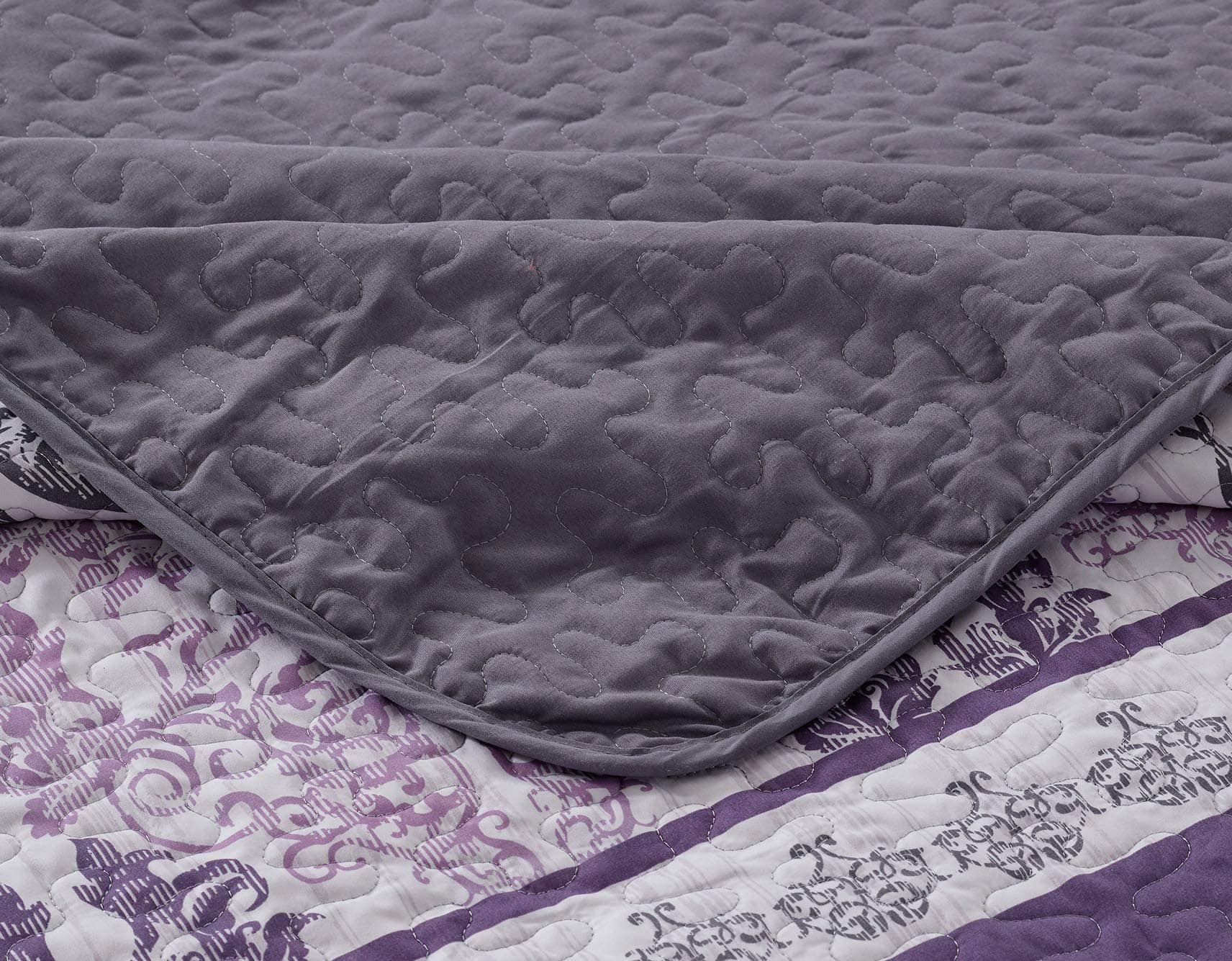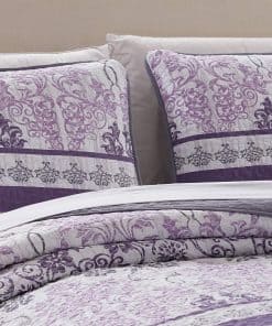 Juego de Colcha Reversible Acolchada de 3 Piezas en tonos Lavanda, Morado, Blanco y Gris de Luxury Home Collection. Este juego incluye una colcha de gran tamaño 100″x 95″ y dos fundas de almohada 20″x 26″. Fabricado con 100% microfibra para mayor suavidad y durabilidad. Transforma tu habitación con este hermoso estampado floral que aporta un toque de elegancia y confort. Fácil de lavar a máquina para un mantenimiento sencillo y conveniente.