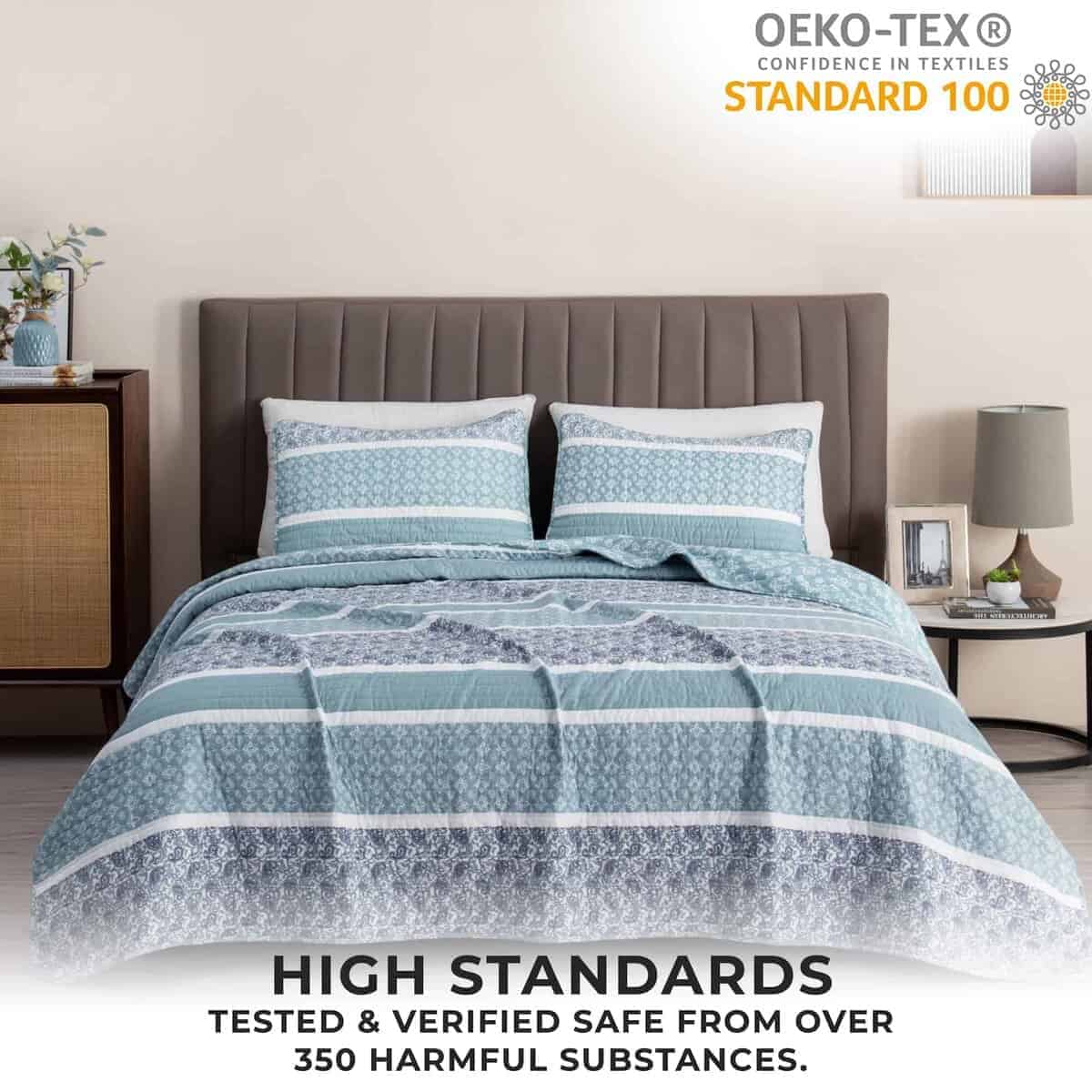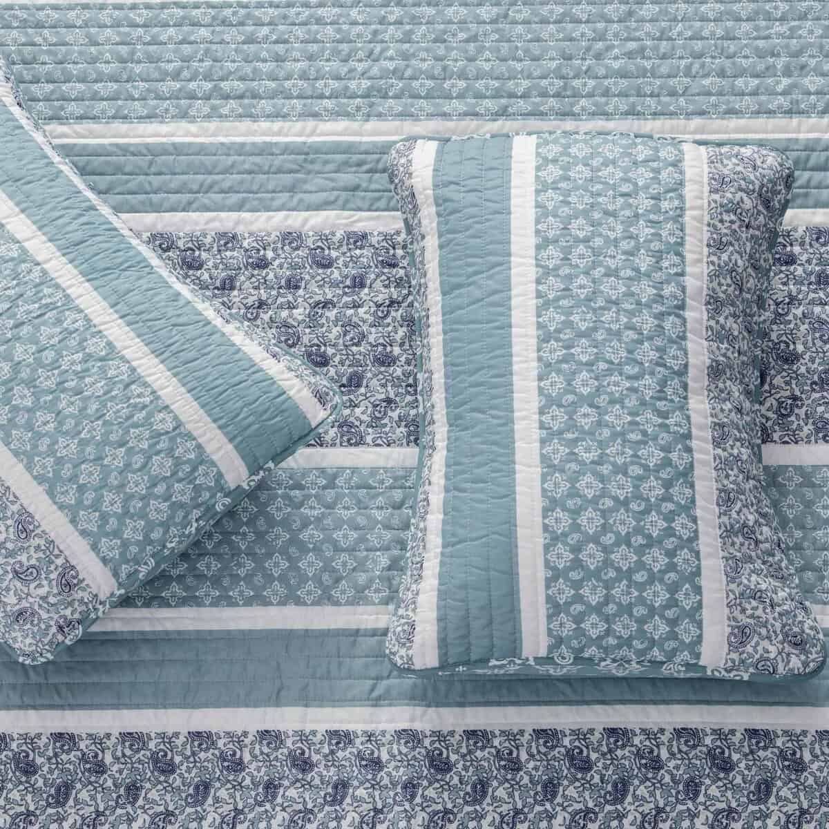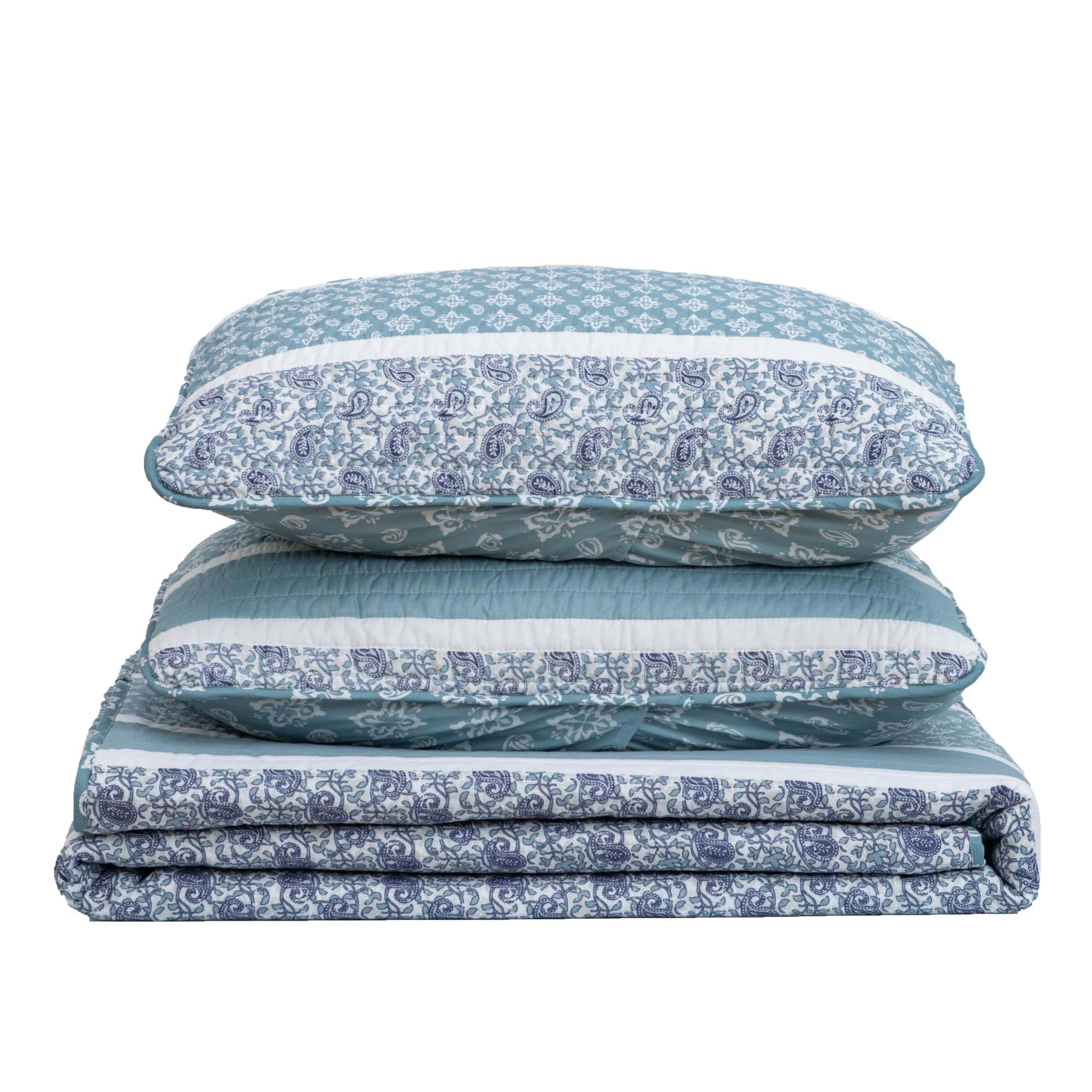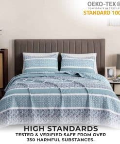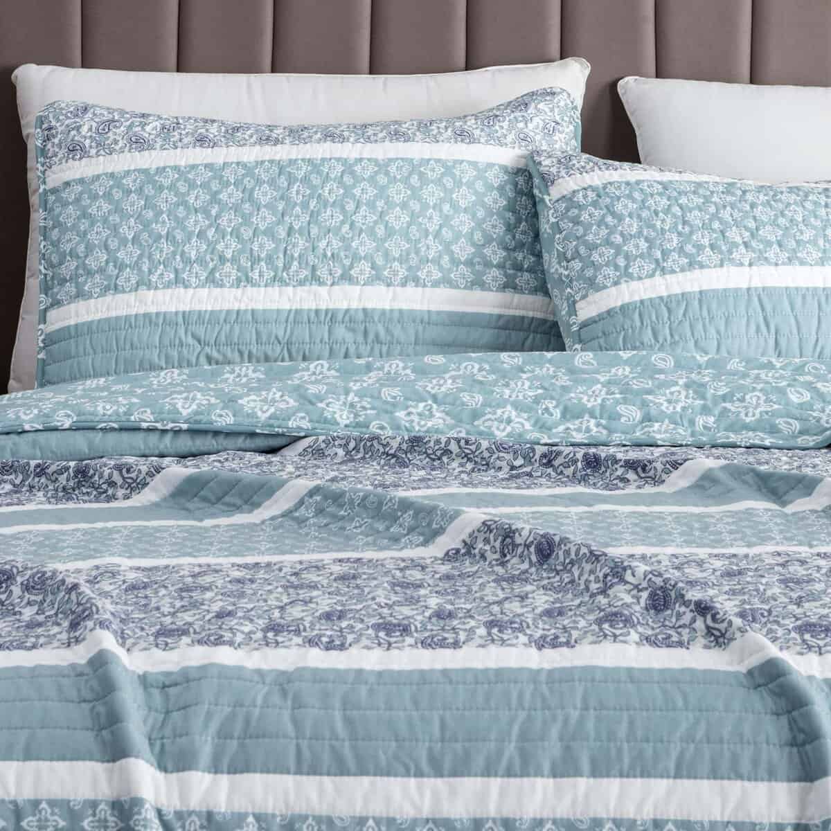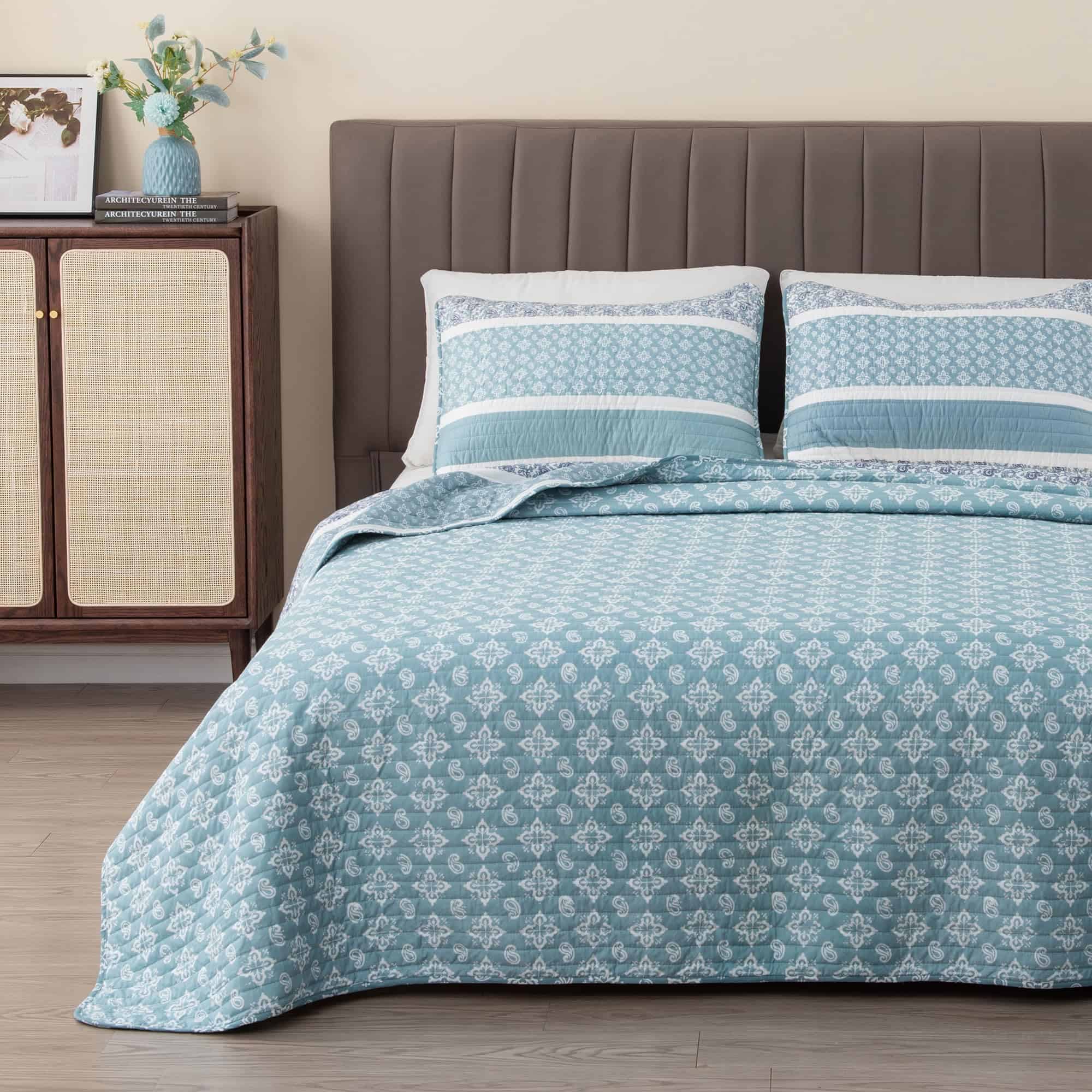 1. ¿Qué incluye este set de ropa de cama? 1 colcha king y 2 fundas a juego acolchadas. Esta colcha king es de 108″ x 90″ y viene con 2 fundas king. Esta colcha extra suave y duradera presenta una construcción gruesa, pero ligera que es perfecta para superponer. Este juego de colchas para todas las estaciones presenta un diseño de puntada único. 2. Suave, Ligero y Cómodo: Esta colcha de alta calidad y acolchada presenta un material de microfibra súper suave que lo mantendrá abrigado y cómodo durante todo el año. Esta colcha para cama está diseñada para uso durante todas las estaciones, con su relleno de poliéster 100% de alta calidad de 220 GSM y la funda de poliéster de 100GSM. Esta colcha no solo es acogedora y duradera, presenta un hermoso diseño para complementar cualquier decoración. 3. Duradero y Fácil de Cuidar: No tenga miedo de lavar estos juegos de colchas. Estos sets son lavables a máquina. Simplemente lave con agua tibia y seque en ciclo suave. Incluso puede planchar tibio si es necesario para lograr esa sensación de ropa de cama de hotel. Este material duradero y de alta calidad está diseñado para un uso y disfrute duraderos. 4. Orientado al Cliente: La satisfacción del cliente es de suma importancia para nosotros. Estamos seguros de que te encantarán nuestros sets de colchas y otros productos de ropa de cama, pero si no estás satisfecho, nuestro equipo de servicio al cliente trabajará contigo para solucionarlo! Encuentra tu combinación de ropa de cama perfecta en una de nuestras colecciones.
