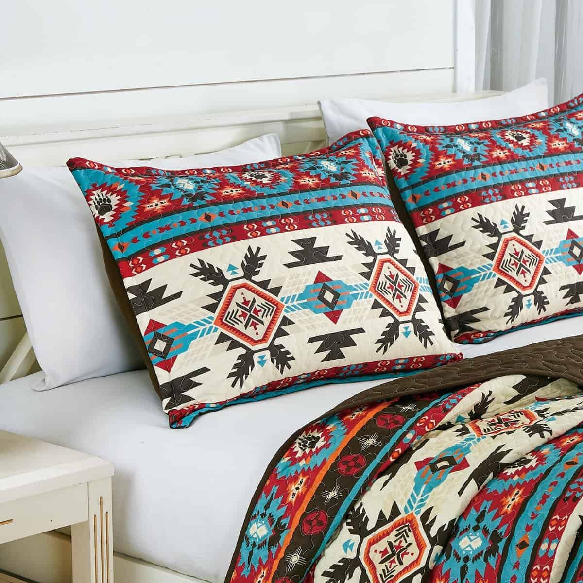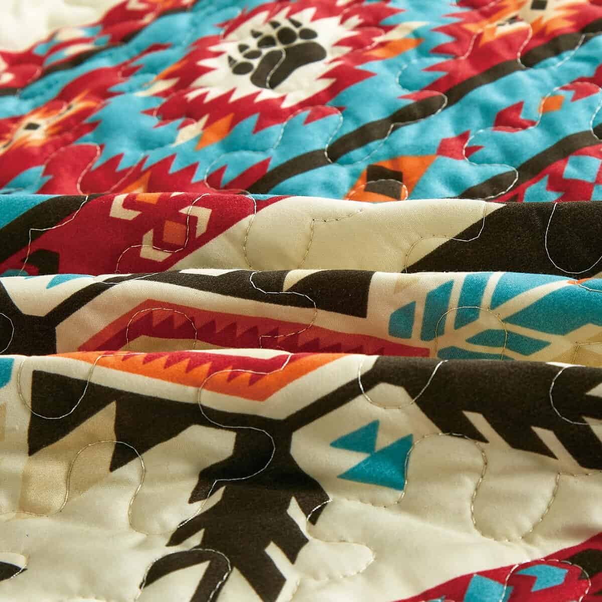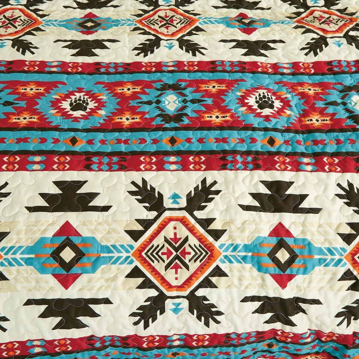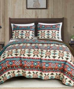 Transforma tu dormitorio en un acogedor refugio con nuestro Juego de Colcha del Suroeste. Este impresionante juego presenta un patrón audaz y vibrante inspirado en diseños tradicionales del suroeste, agregando un toque de encanto rústico y calidez a cualquier espacio. Los intrincados motivos geométricos en tonos terrosos de rojo, turquesa, marrón y crema evocan el espíritu de la naturaleza y brindan un punto focal visualmente llamativo para tu habitación. Mejorando aún más el ambiente del suroeste están sus coordinados colores vibrantes y llamativos que se complementan entre sí. Estilo de colcha ligero pero sin faltarle calor, brindando comodidad durante todo el año. Una pieza decorativa de ropa de cama ideal para decoraciones de tema occidental. Hecho con 100% microfibra, la colcha acolchada es resistente a la decoloración y a las arrugas. Transforma tu dormitorio en un acogedor refugio de relajación y estilo con este elegante juego de colcha estampada.