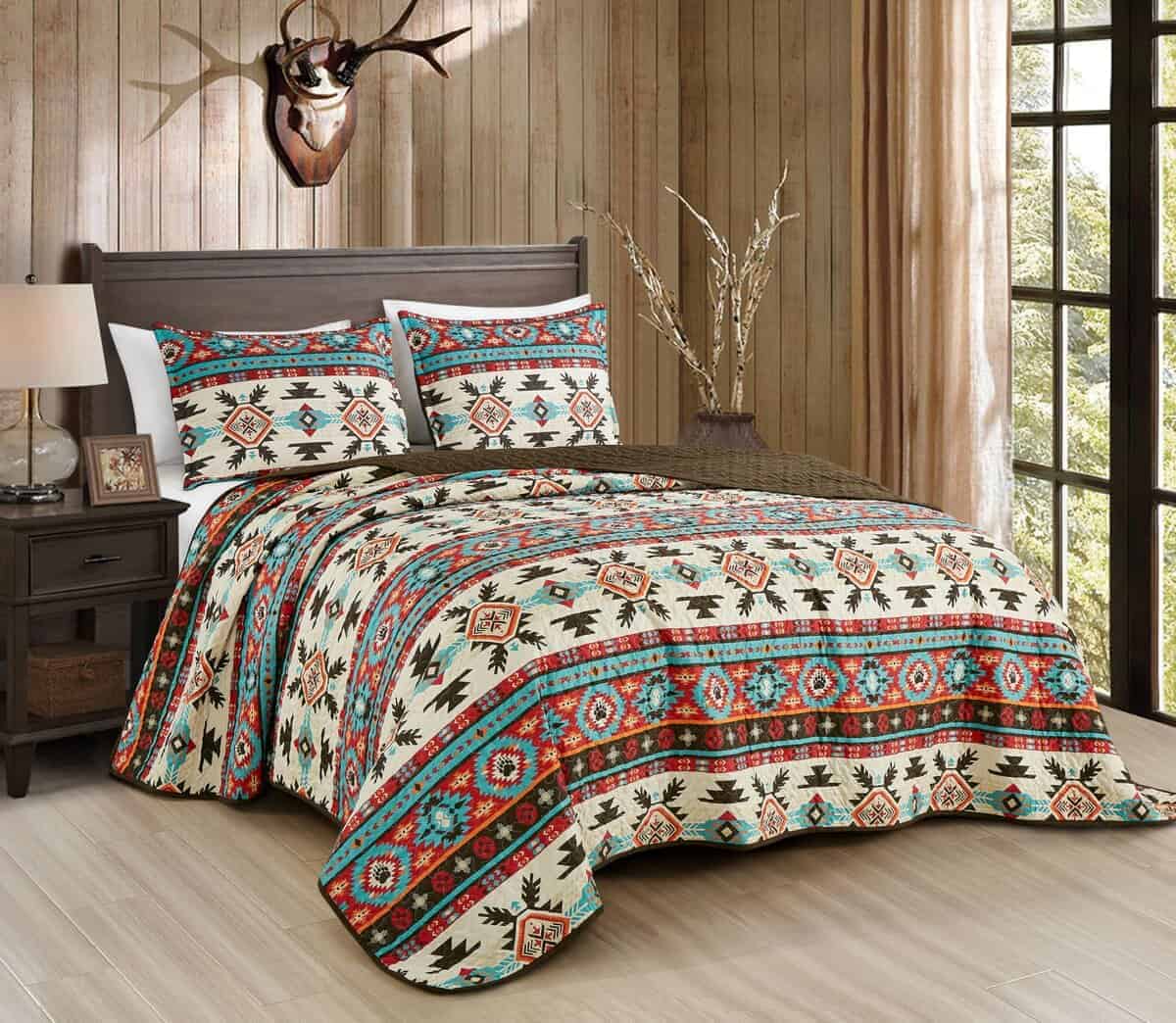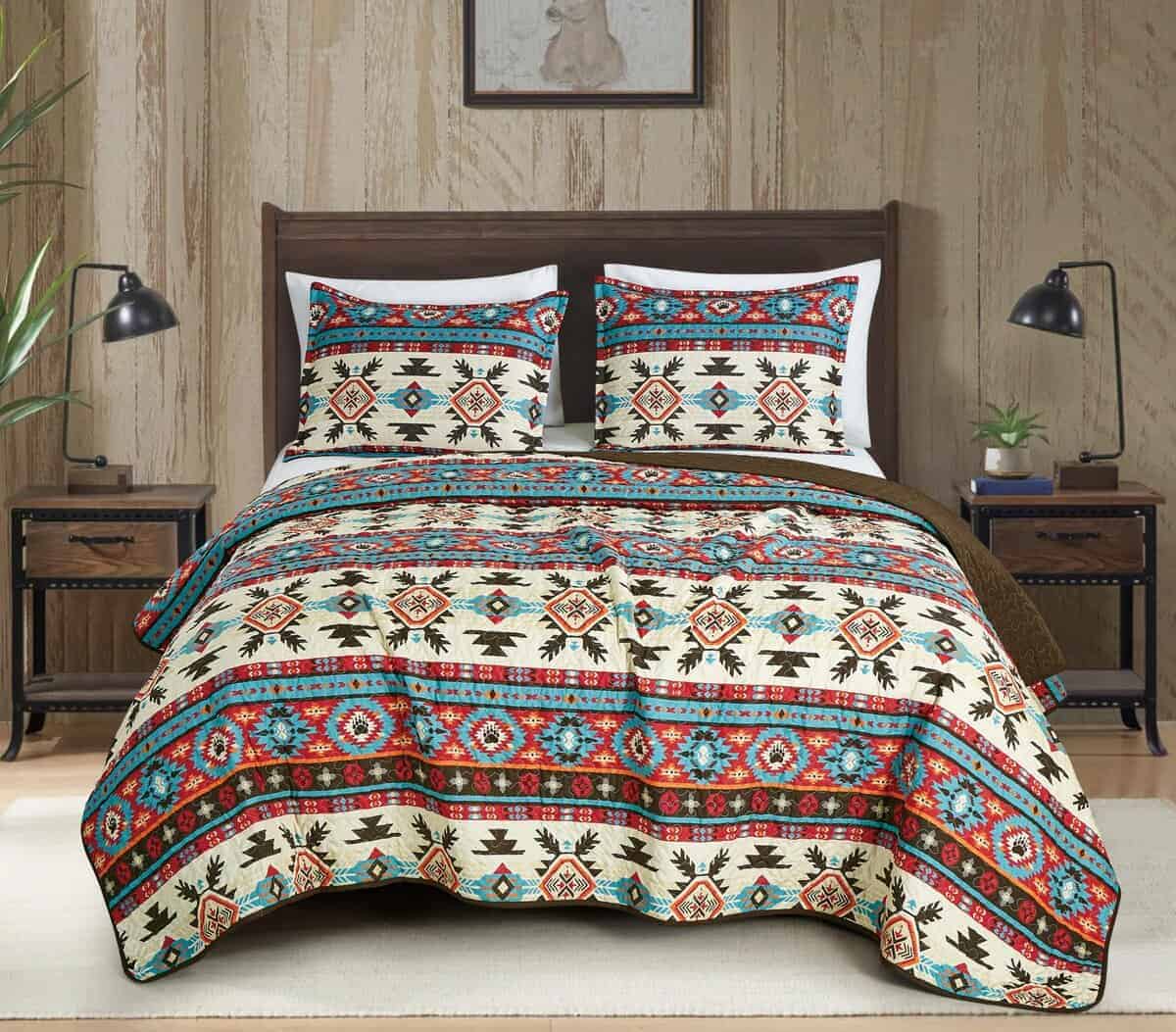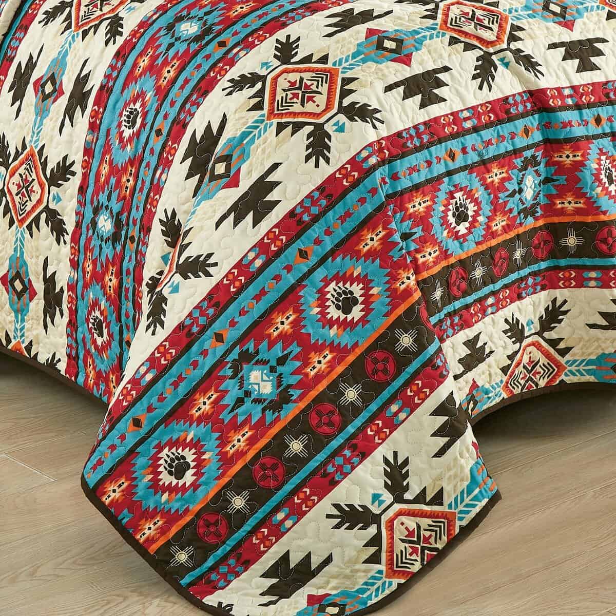 Transforma tu dormitorio en un acogedor refugio con nuestro Juego de Colcha del Suroeste. Este impresionante juego presenta un patrón audaz y vibrante inspirado en diseños tradicionales del suroeste, agregando un toque de encanto rústico y calidez a cualquier espacio. Los intrincados motivos geométricos en tonos terrosos de rojo, turquesa, marrón y crema evocan el espíritu de la naturaleza y brindan un punto focal visualmente llamativo para tu habitación. Mejorando aún más el ambiente del suroeste están sus coordinados colores vibrantes y llamativos que se complementan entre sí. Estilo de colcha ligero pero sin faltarle calor, brindando comodidad durante todo el año. Una pieza decorativa de ropa de cama ideal para decoraciones de tema occidental. Hecho con 100% microfibra, la colcha acolchada es resistente a la decoloración y a las arrugas. Transforma tu dormitorio en un acogedor refugio de relajación y estilo con este elegante juego de colcha estampada.