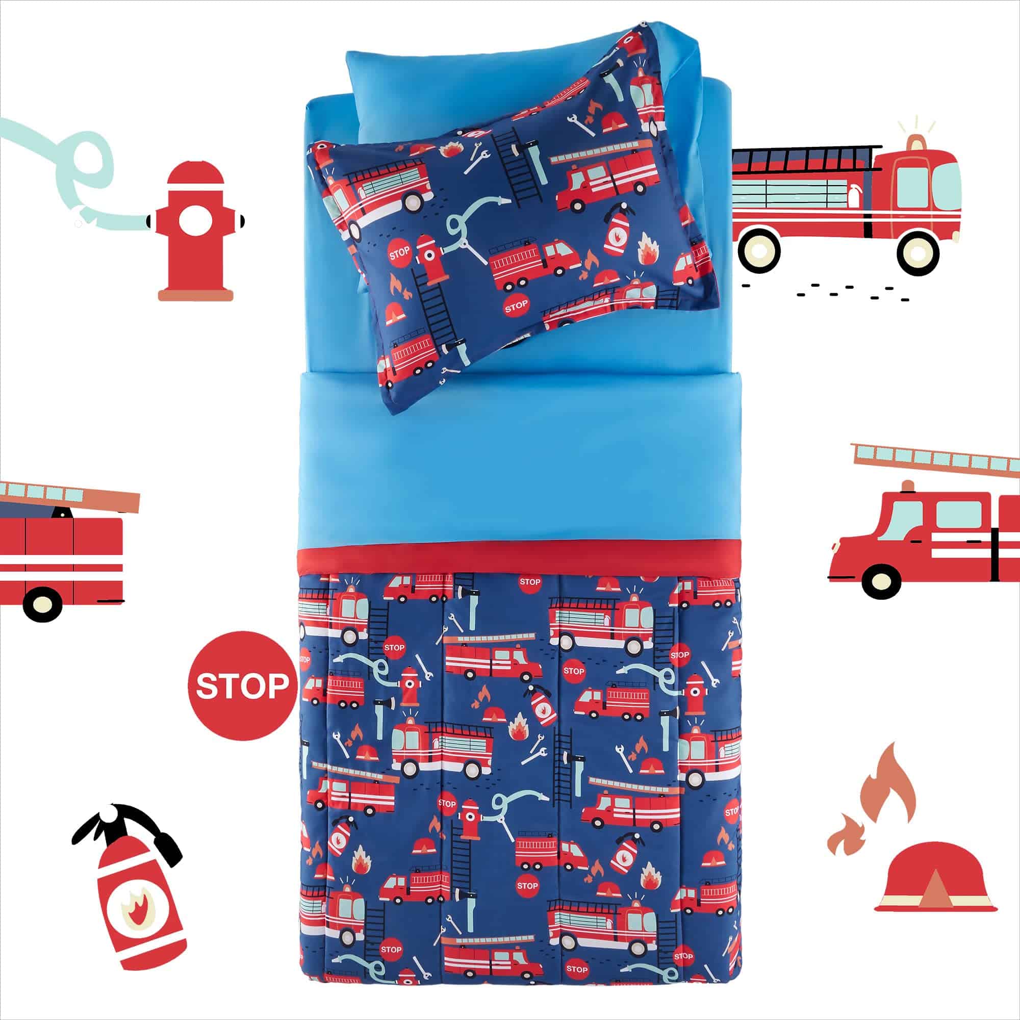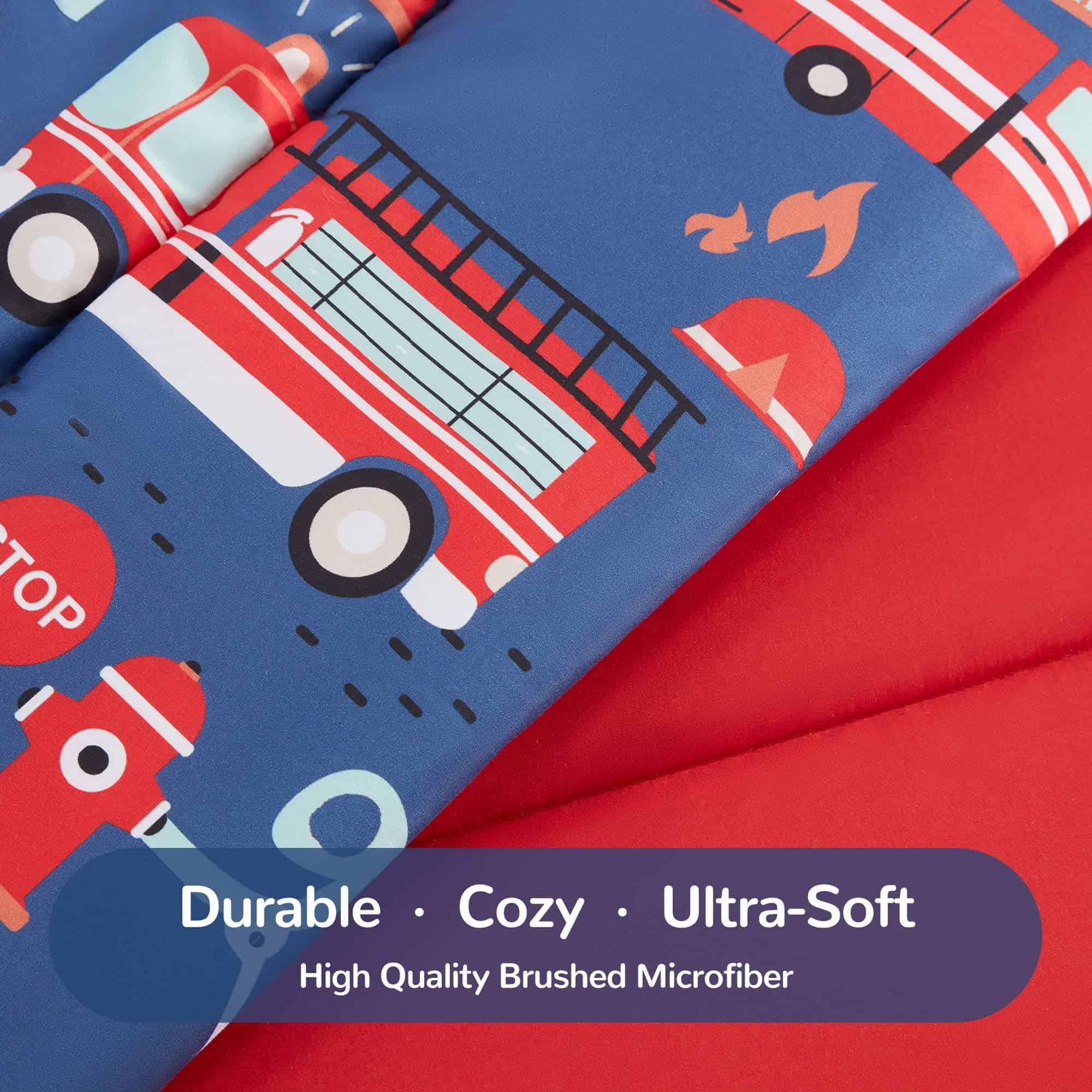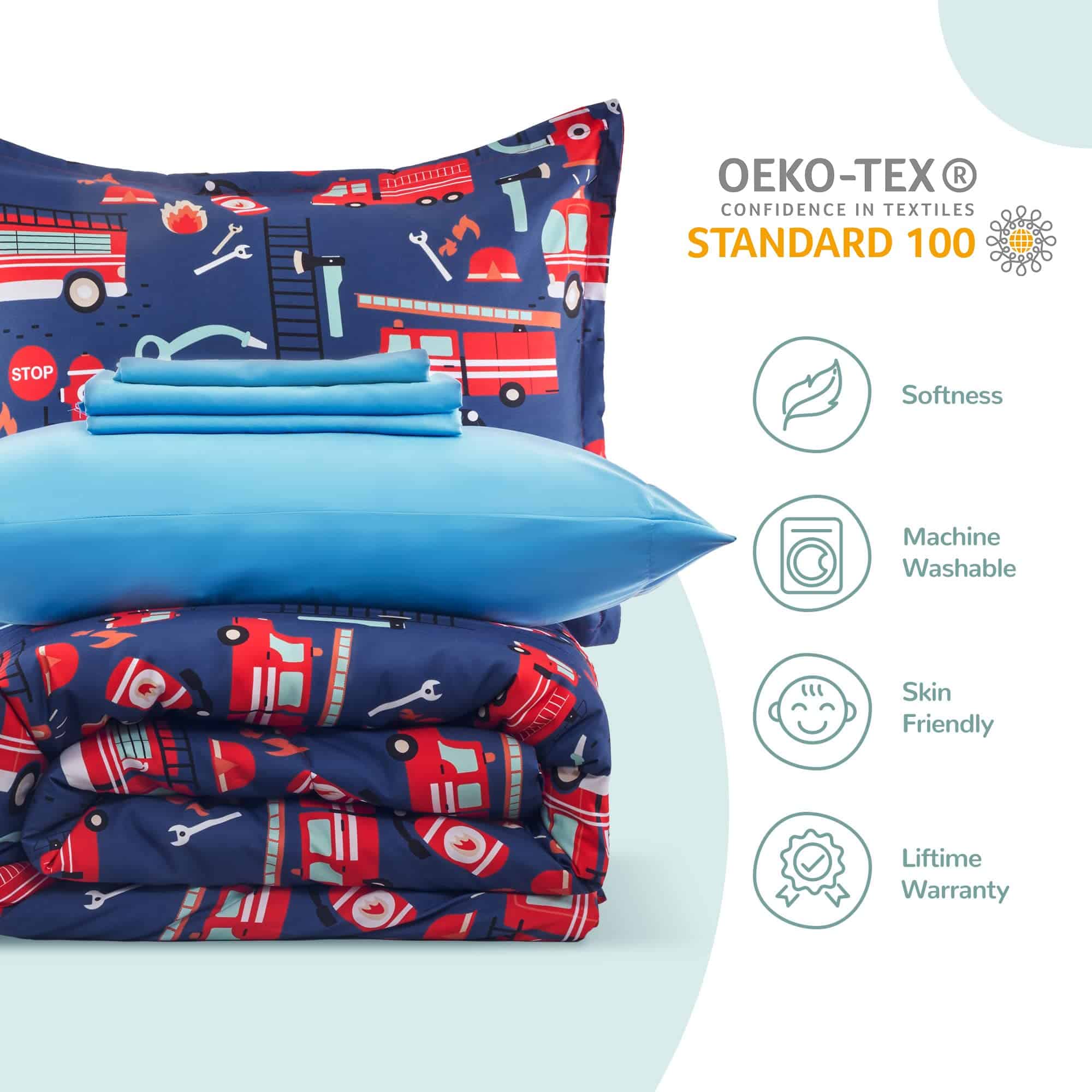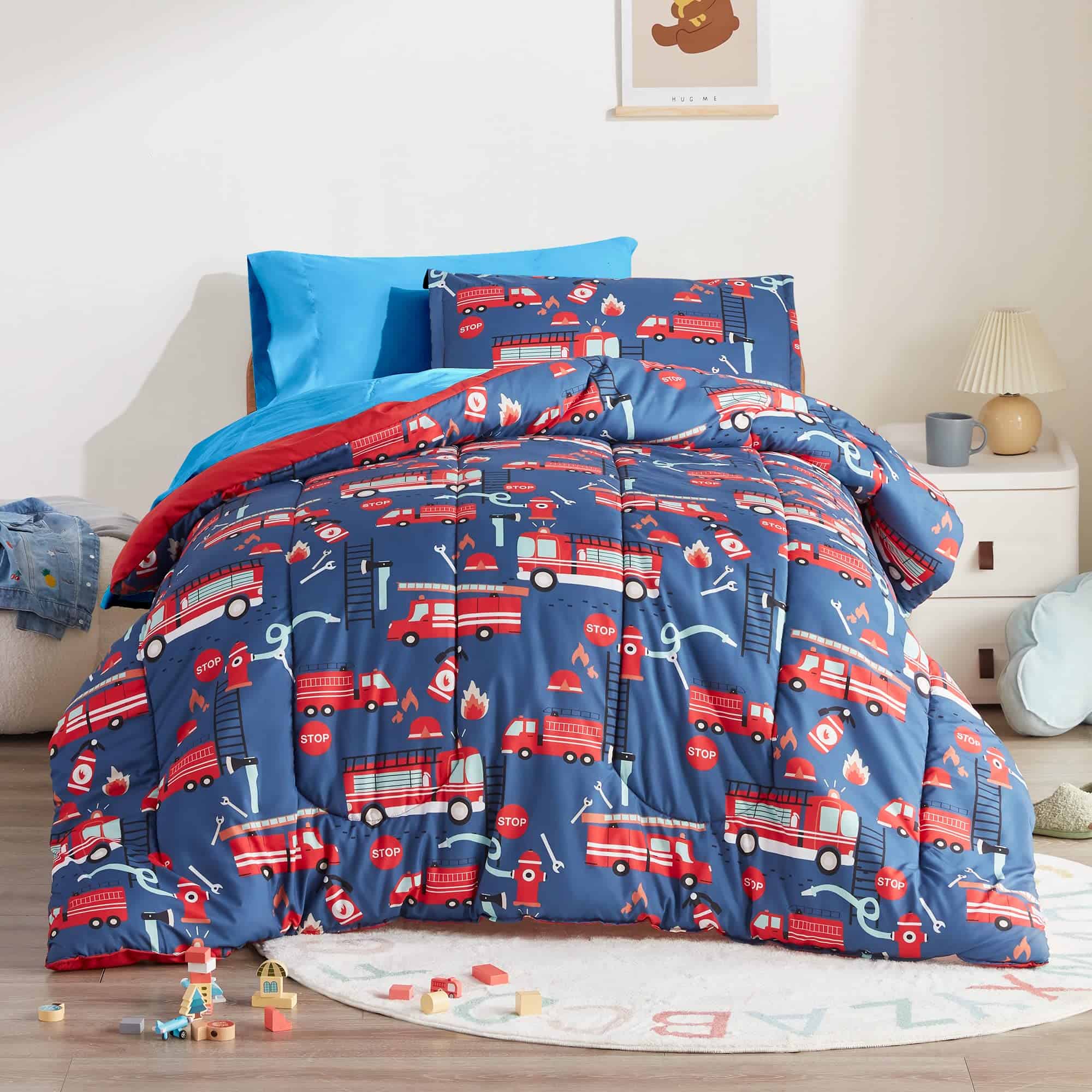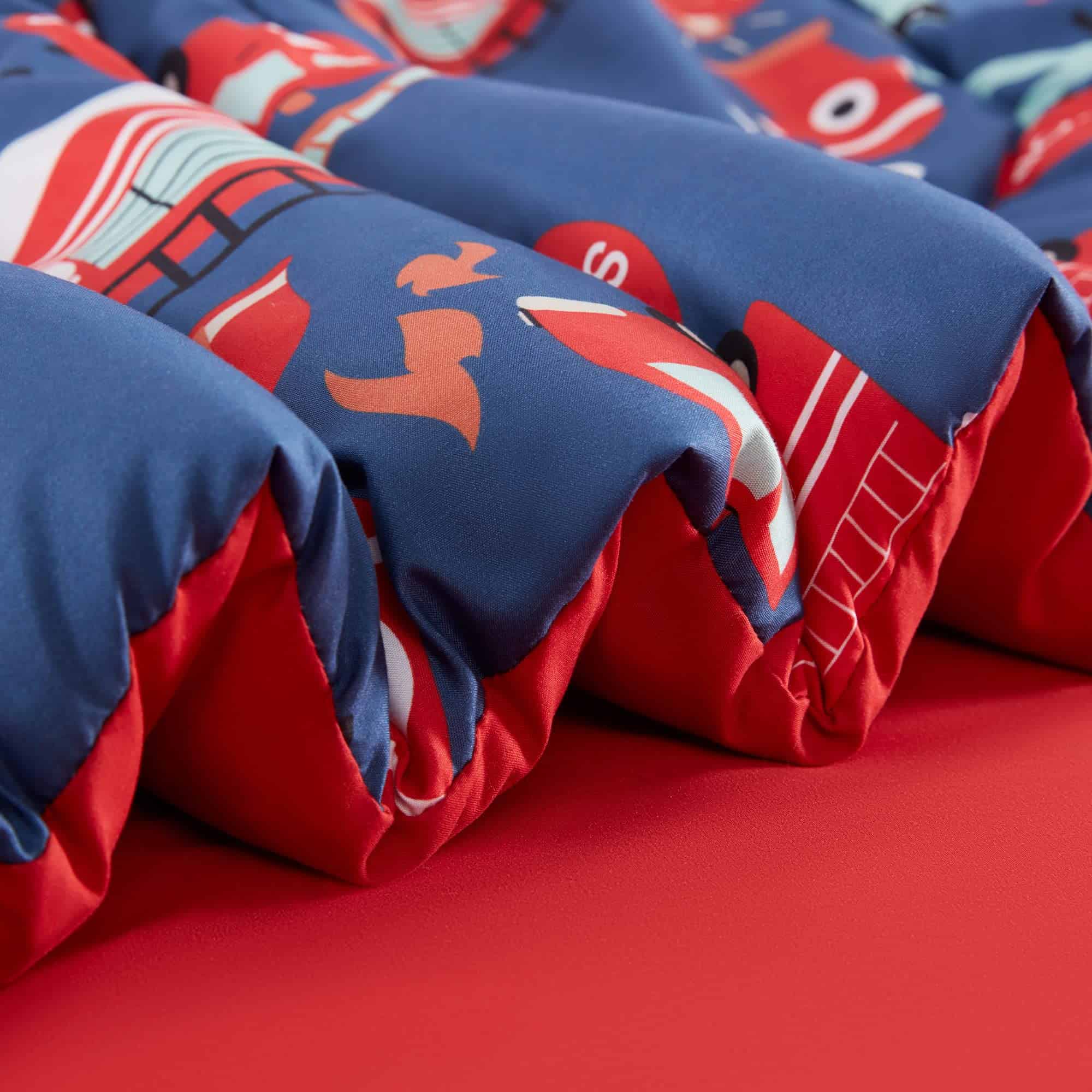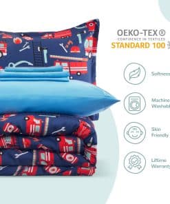 Usamos un fondo azul marino, además de varios elementos de lucha contra incendios. Atrayendo a tus hijos con sus diseños únicos e inspirando su curiosidad y amor. El diseño es tan lindo y divertido que tus pequeños se enamorarán de esta colcha a primera vista. Combinan perfectamente con la mayoría de decoraciones interiores para crear un mundo cálido, luminoso y esperanzador para tus hijos. La tela de la colcha es de microfibra cepillada gruesa, se siente súper suave y cómoda. El relleno es de 200 g/m2 de fibra resistente mezclada con fibra de enfriamiento INVISTA, súper transpirable y esponjosa como dormir en una nube. Ligero, silencioso y sin olor. El diseño de acolchado clásico lo mantiene ajustado al cuerpo. El elegante ribete no solo se ve hermoso, sino que también previene eficazmente el quiebre de los bordes. La costura precisa y duradera evita que los rellenos se apelmacen incluso después de muchos lavados. Proceso de teñido e impresión respetuoso con la piel, excelente solidez del color. Lavar a máquina en frío, no usar lejía, secar en secadora a baja temperatura. El juego de 7 piezas incluye una colcha de 90×90 pulgadas, una sábana ajustable de 60x80x14 pulgadas, una sábana plana de 90×102 pulgadas, dos fundas de almohada de 20×26 pulgadas y dos fundas de almohada de 20×30 pulgadas. SLEEP ZONE tiene más de 40 años de experiencia en el diseño y fabricación de ropa de cama de alta calidad. Nuestros productos están certificados según el estándar Oeko-Tex 100 para estar libres de sustancias químicas nocivas. Puedes comprar con confianza bajo nuestra excelente calidad de producto y servicio al cliente. Si tienes alguna consulta o problema, no dudes en contactarnos, te responderemos en 24 horas.