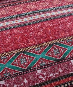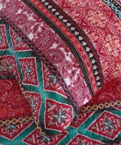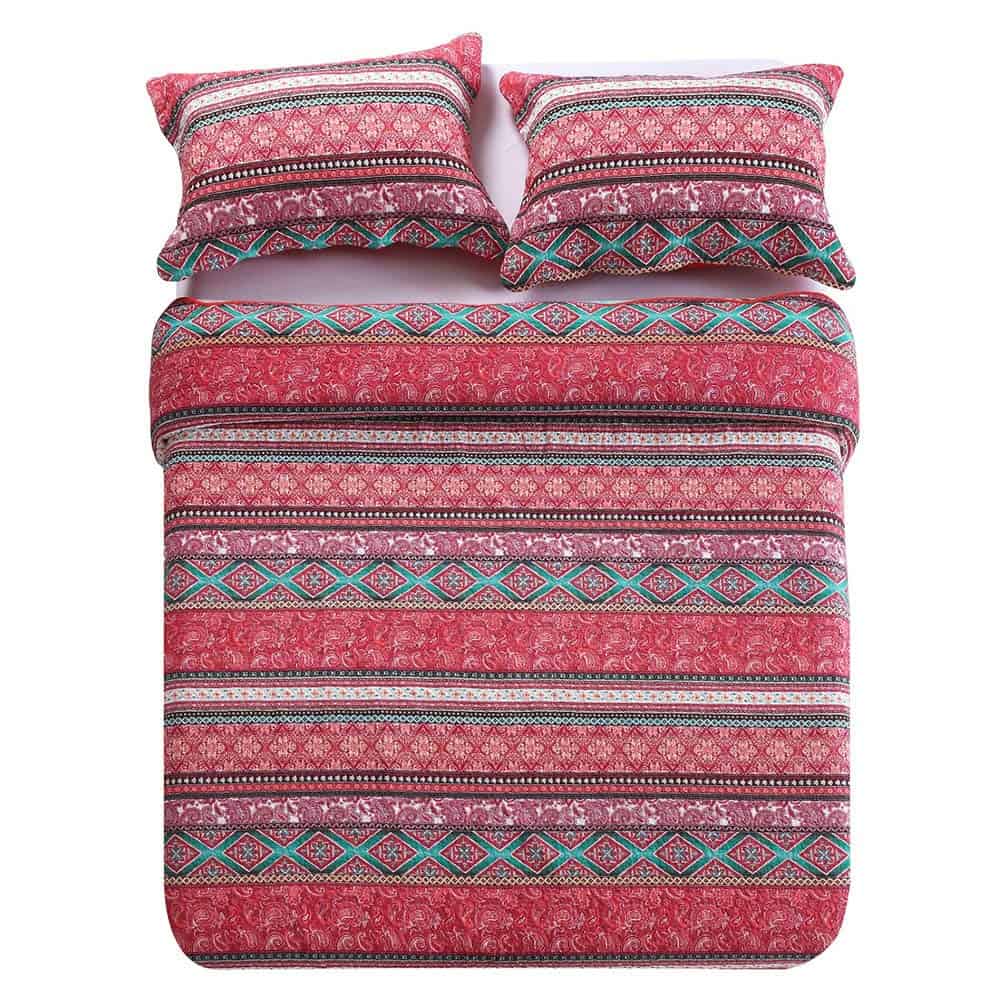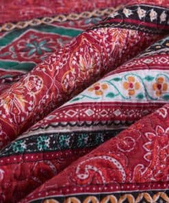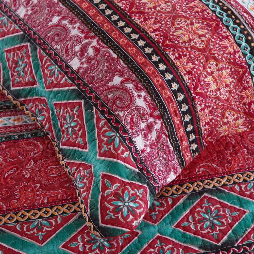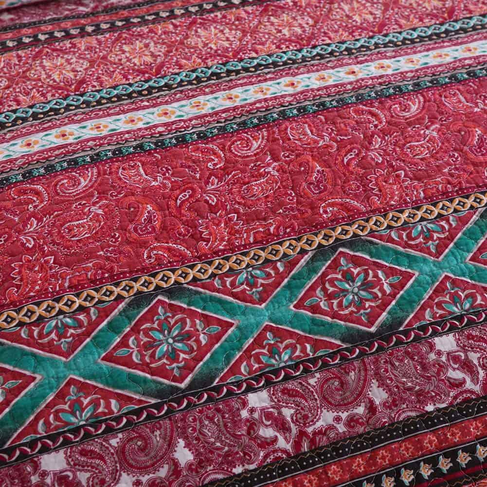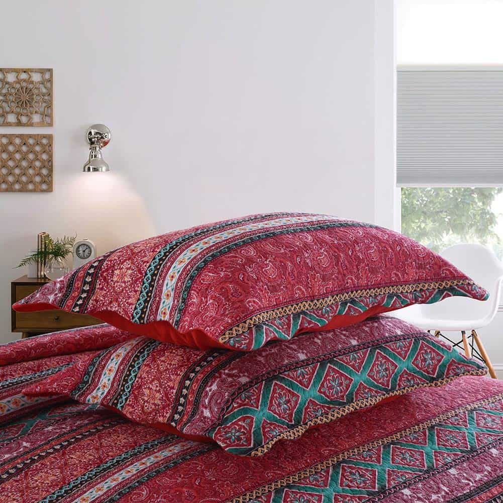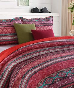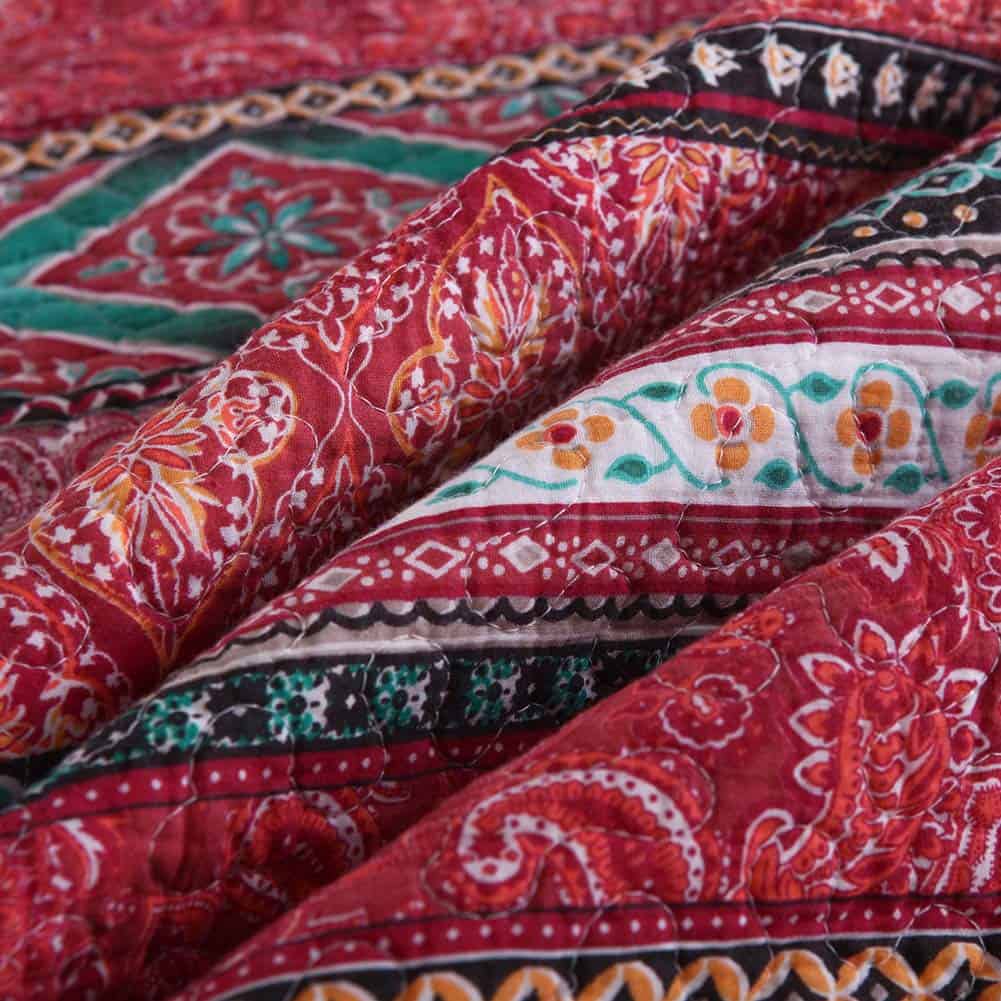 La artesanía experta se destaca en la costura doble en caja cerrada del edredón acolchado, que mantiene el relleno uniforme y evita que se mueva después de lavarlo. El diseño único a rayas bohemias en el frente de la colcha se complementa con un color rojo sólido en el lado reversible, lo que permite cambiar la decoración de tu cama con facilidad.