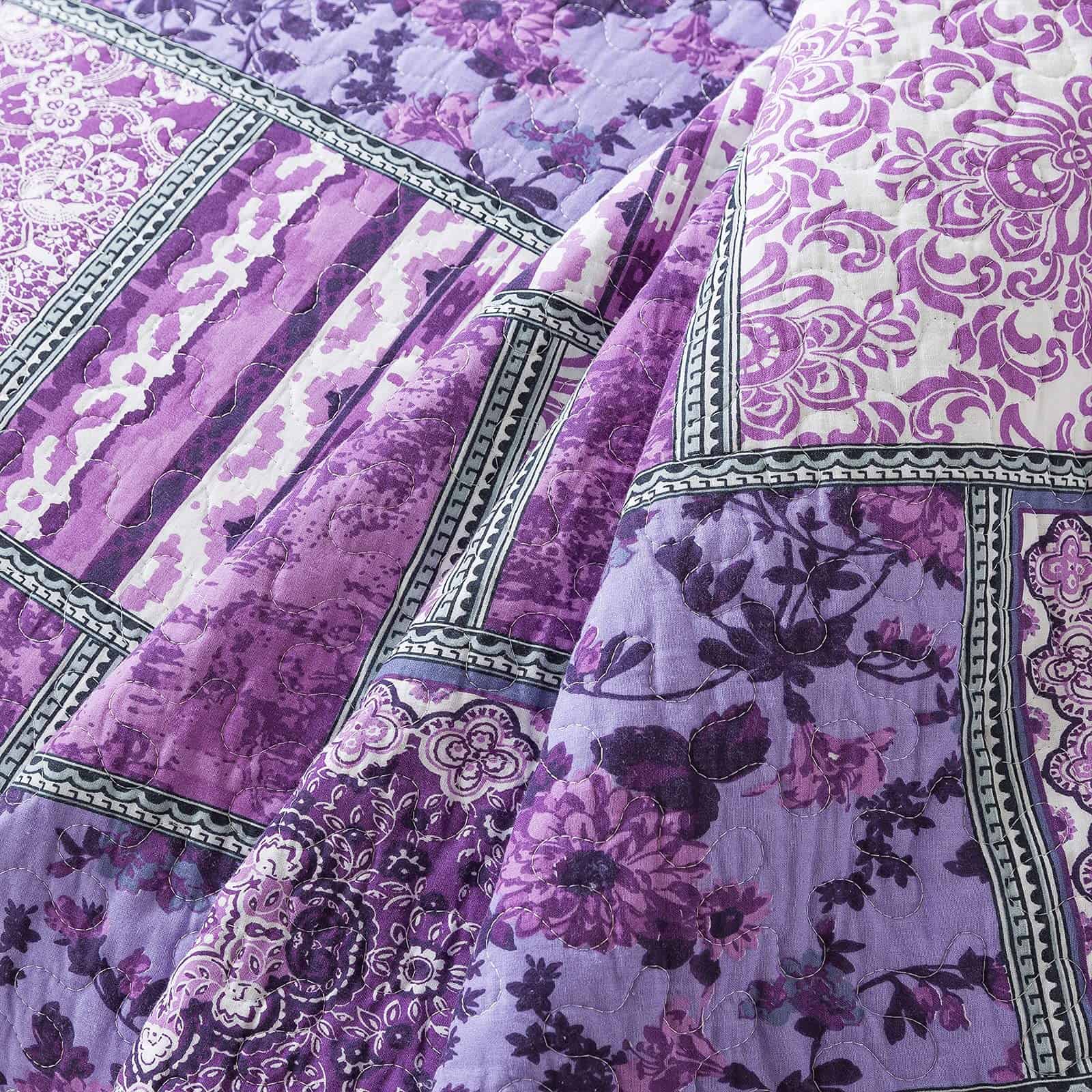 El juego de colcha y edredón reversible de algodón NEWLAKE presenta un hermoso patrón clásico bohemio en color morado. El set King Size incluye un edredón de 96 x 108 pulgadas y dos fundas de almohada de 20 x 36 pulgadas. Las instrucciones de cuidado recomendadas son lavar a máquina por separado en agua fría y secar a baja temperatura. La artesanía experta garantiza que el acolchado de la colcha con doble costura cerrada mantenga el relleno uniforme, incluso después de lavarlo. La decoración del juego de ropa de cama cuenta con un patrón de estilo bohemio en el frente de toda la colcha y un morado oscuro puro en el lado reversible para completar el look del edredón.