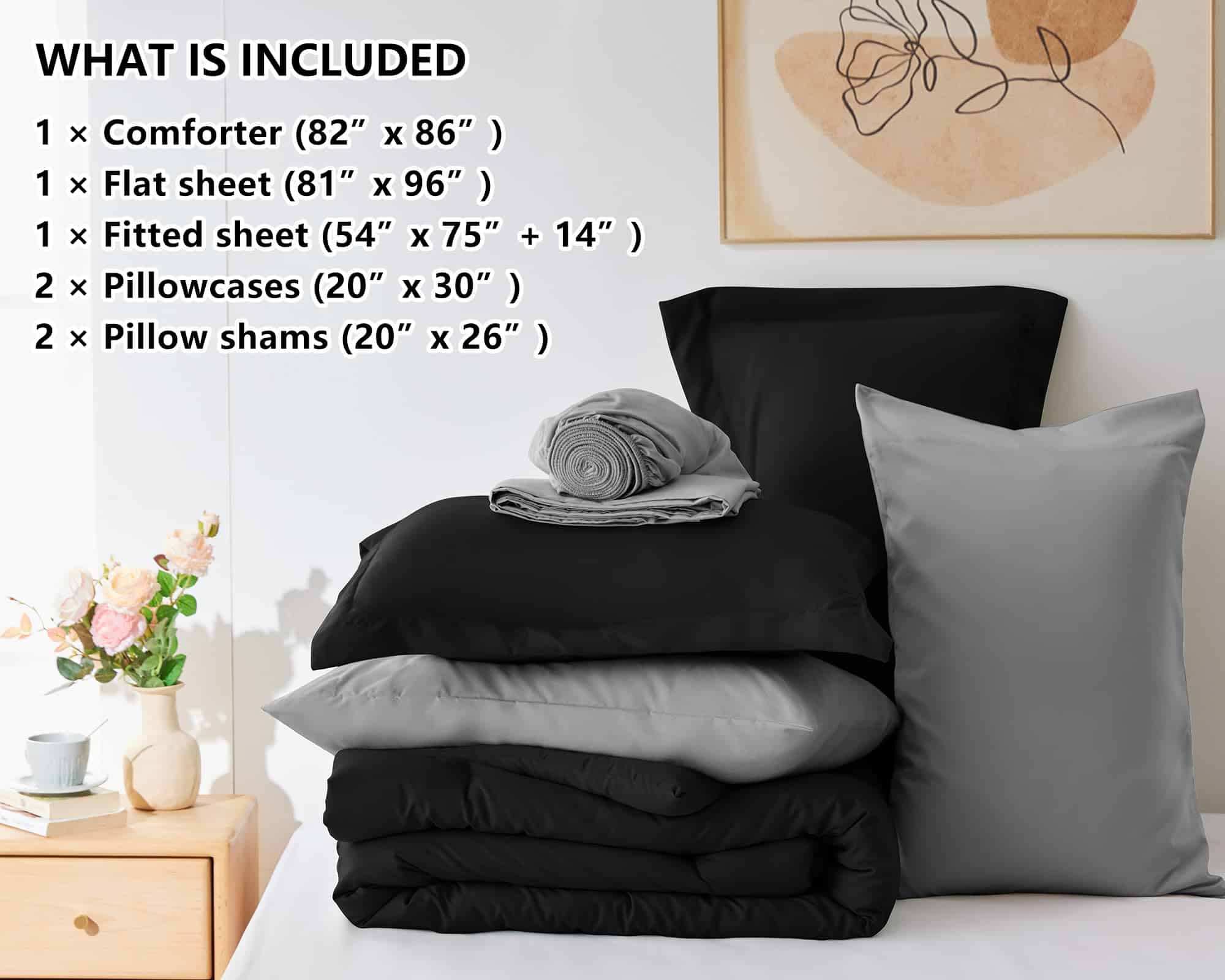 5. Set de ropa de cama inclusivo: Este juego de cama en una bolsa tamaño completo incluye todo lo que necesitas para una cama acogedora: 1 edredón (82″ x 86″), 1 Sábana Ajustable (54″ x 75″ + 14″), 1 Sábana Plana (81″ x 96″)