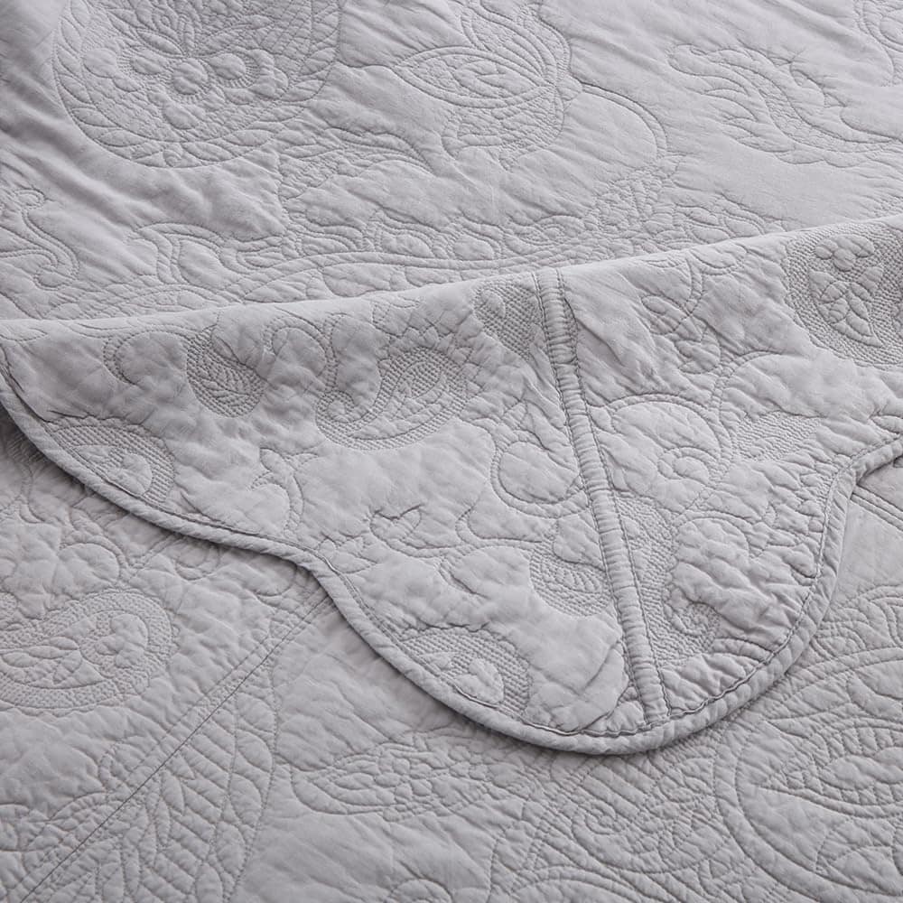 Juego de Colchas de Algodón Wistown, Juego de Cama de Auténtico Patchwork con Diseño Floral Paisley de Lujo, 3 Piezas Reversible Ligero para Todas las Estaciones, Gris, Tamaño Queen: Este juego de colchas de algodón de Wistown está hecho de patchwork de algodón 100% real, lo que lo hace duradero y ligero para un uso prolongado. Presenta un diseño floral paisley de lujo y vintage con un borde ondulado especial en tonos de gris. Perfecto para agregar un toque de elegancia a tu dormitorio, habitación infantil o habitación de invitados. Este juego de cama es un regalo perfecto para tus seres queridos. Además, es ideal para todas las estaciones, ya que proporciona calidez adicional durante el invierno y es lo suficientemente ligero para usar en las noches de verano. El proceso de costura intensa garantiza que esta colcha de patchwork sea duradera y resistente. El juego de colchas tamaño queen incluye una colcha reversible queen y dos almohadas a juego, lo que lo convierte en la opción perfecta para camas tamaño queen. Lava este juego de colchas a máquina por separado en agua fría para mantenerlo fresco y limpio. No se arruga ni encoge, incluso después de varios lavados. Simplemente sécalo a baja temperatura en la secadora y evita usar lejía para mantener la calidad de la tela.