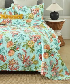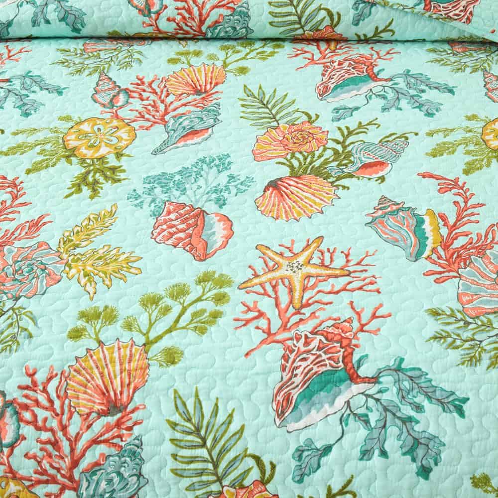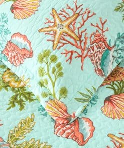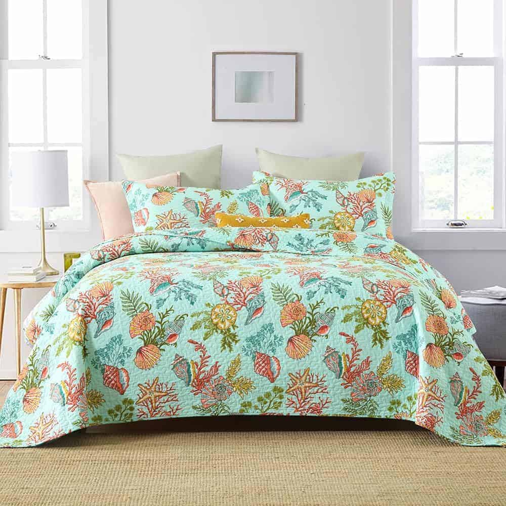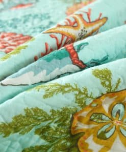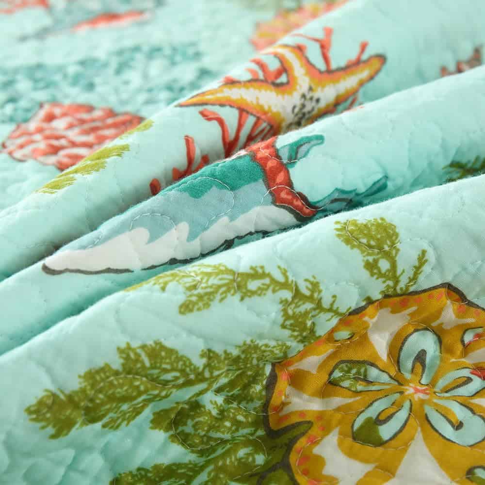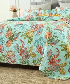 Diseño costero del mar: dibujo impreso de estrellas de mar, conchas y algas marinas en la tela trasera verde marino traen un espacio fresco y de cuento de hadas a tu habitación, te sentirás como si estuvieras durmiendo en el increíble océano. Colcha costera para todas las estaciones: lo suficientemente ligera para ser utilizada como manta, colcha, cubrecama, cubierta de sofá. Adecuada para todas las estaciones, el material de algodón mantendrá el cuerpo caliente en invierno, el diseño costero marino te traerá un ligero frescor en verano. Colcha tamaño King: 1 colcha tamaño King (96 por 108 pulgadas), 2 fundas de almohada (20 por 36 pulgadas). Lavable a máquina: Lavar por separado en agua fría. Secar en secadora a baja temperatura.