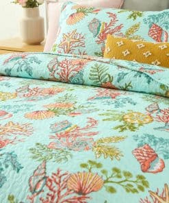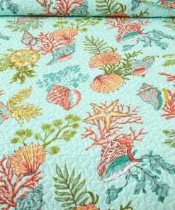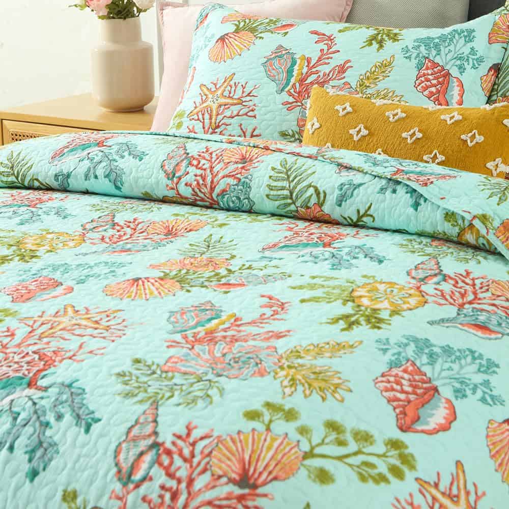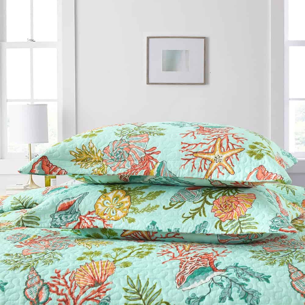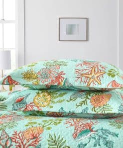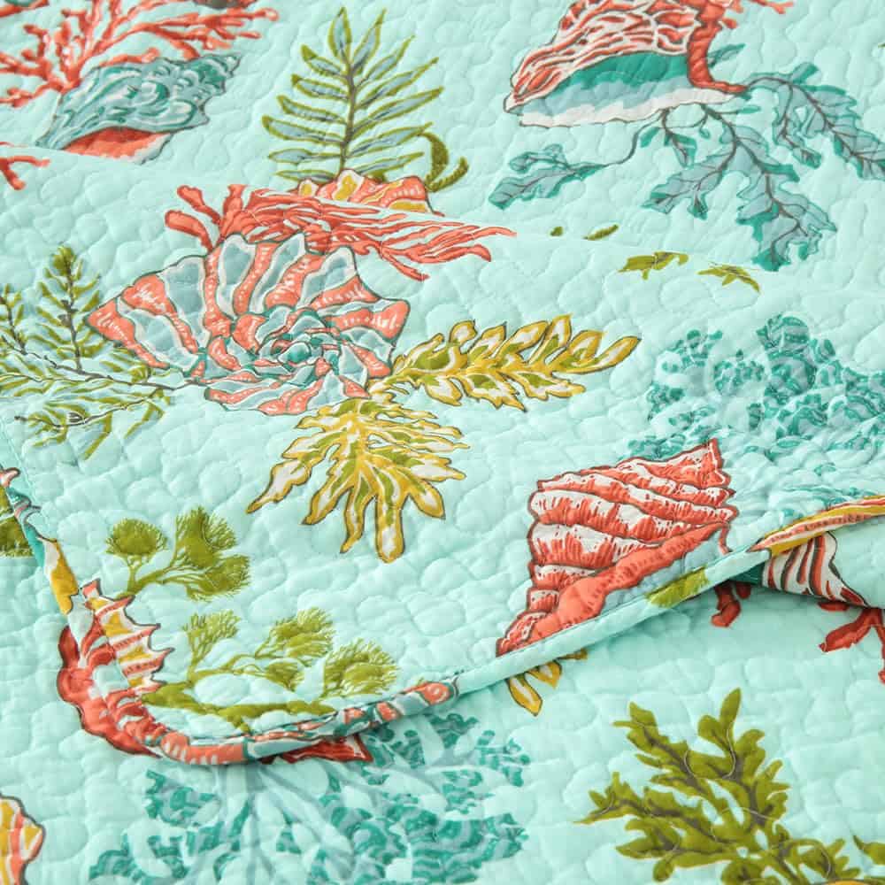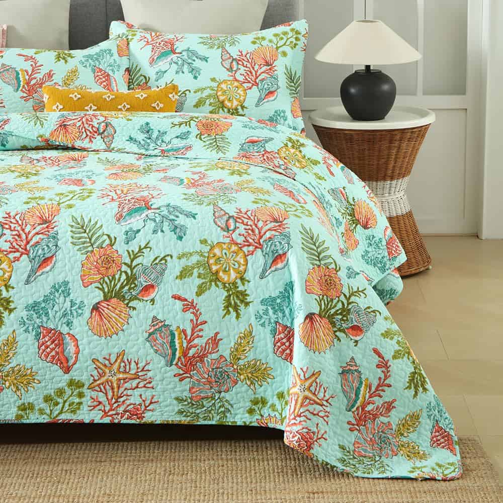 Diseño costero del mar: dibujo impreso de estrellas de mar, conchas y algas marinas en la tela trasera verde marino traen un espacio fresco y de cuento de hadas a tu habitación, te sentirás como si estuvieras durmiendo en el increíble océano. Colcha costera para todas las estaciones: lo suficientemente ligera para ser utilizada como manta, colcha, cubrecama, cubierta de sofá. Adecuada para todas las estaciones, el material de algodón mantendrá el cuerpo caliente en invierno, el diseño costero marino te traerá un ligero frescor en verano. Colcha tamaño King: 1 colcha tamaño King (96 por 108 pulgadas), 2 fundas de almohada (20 por 36 pulgadas). Lavable a máquina: Lavar por separado en agua fría. Secar en secadora a baja temperatura.