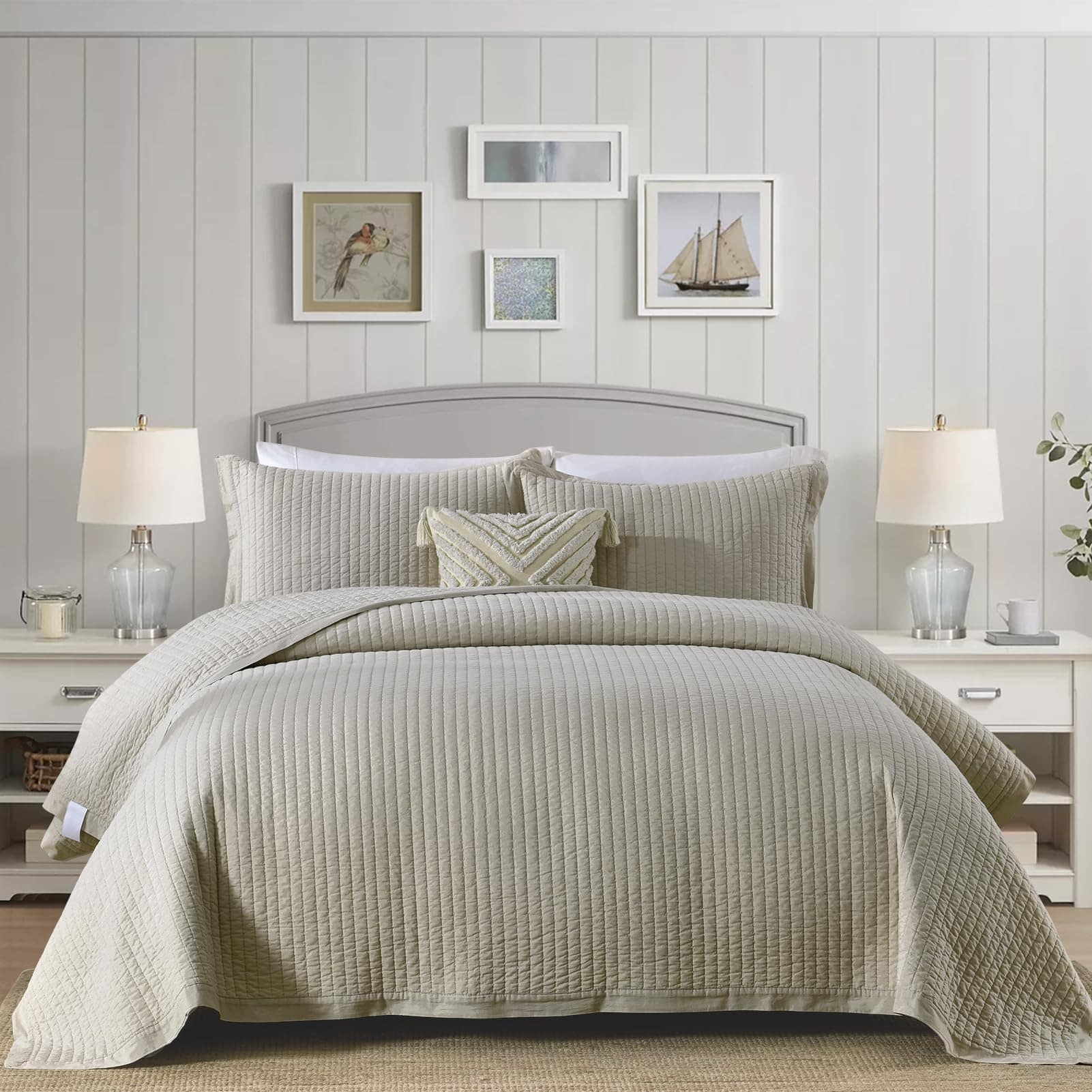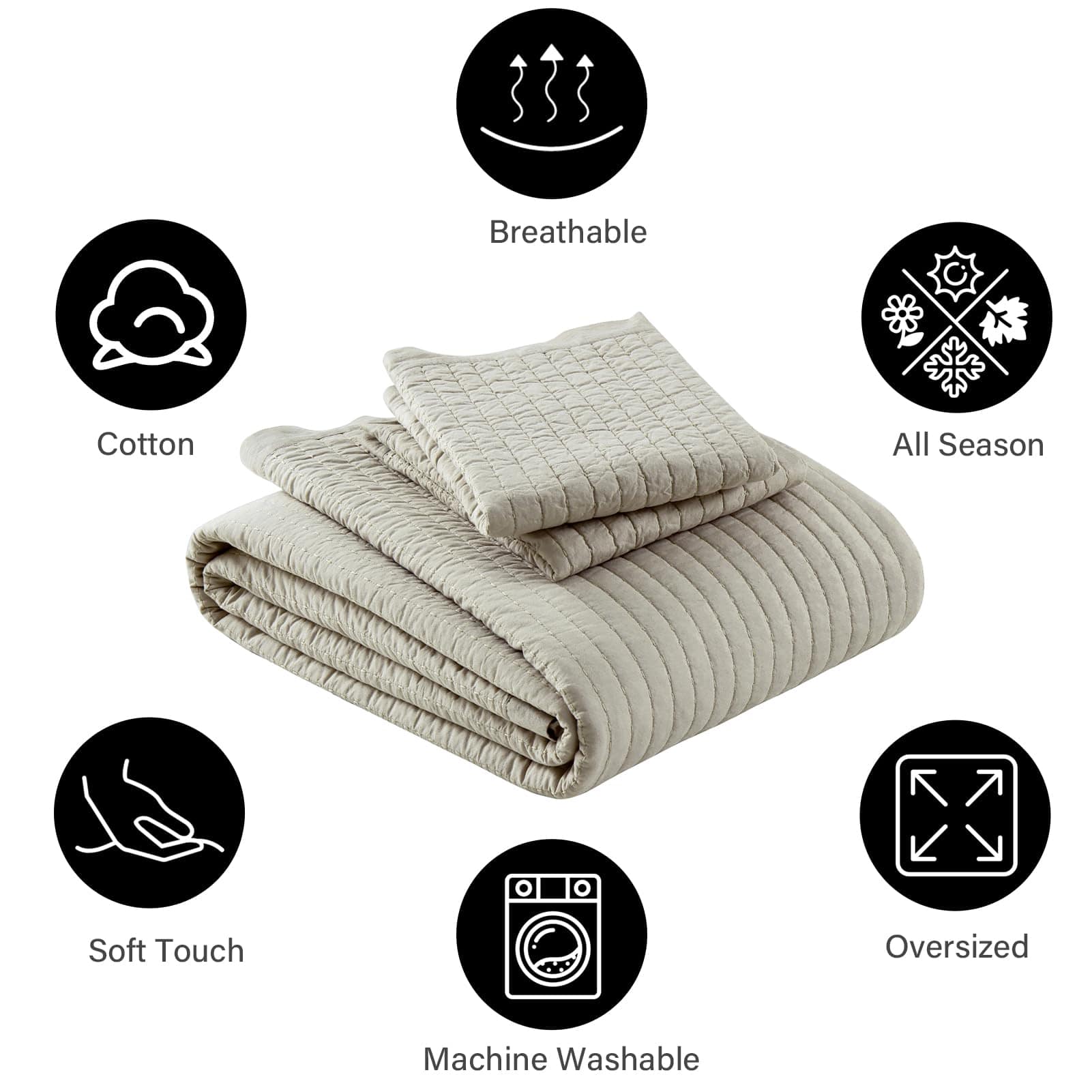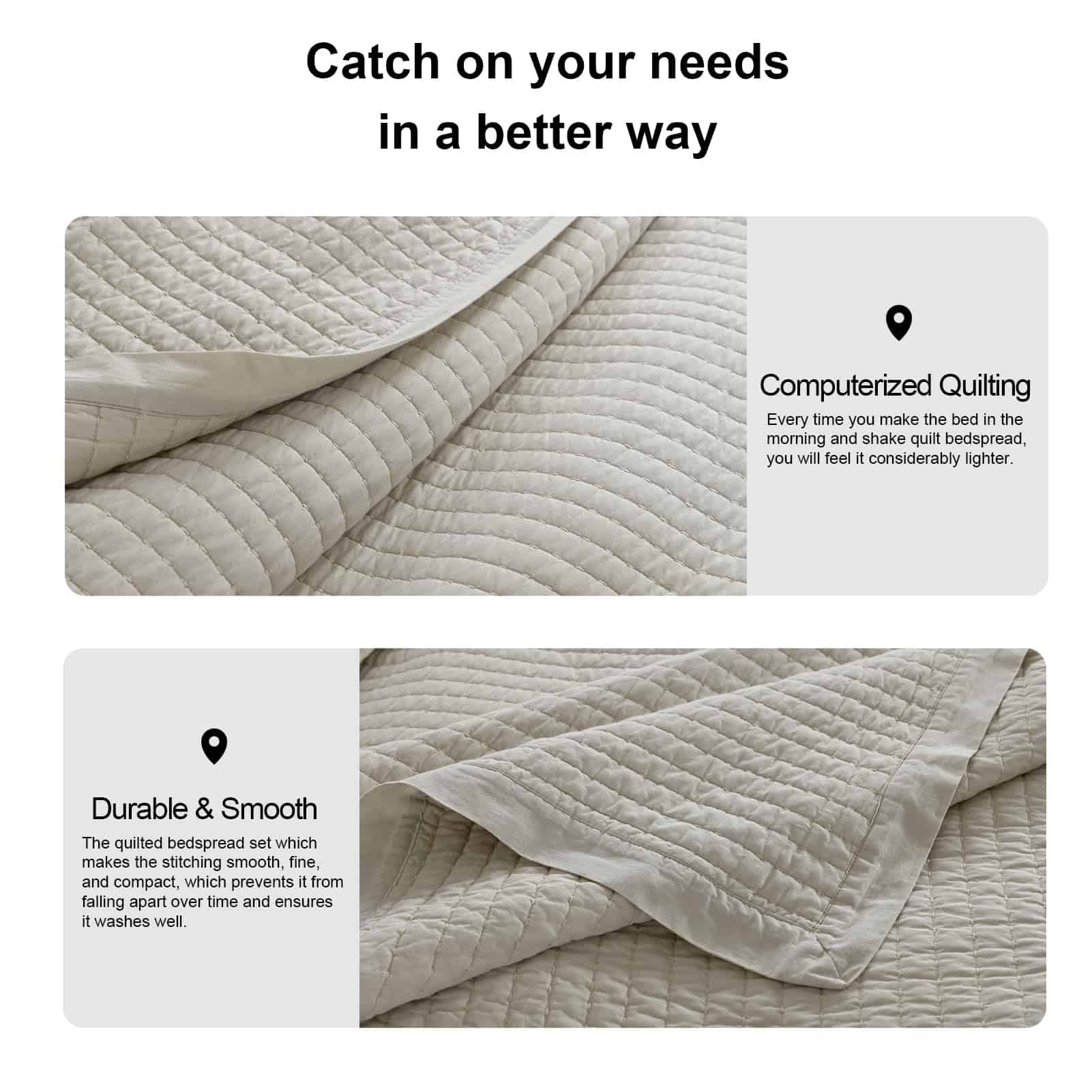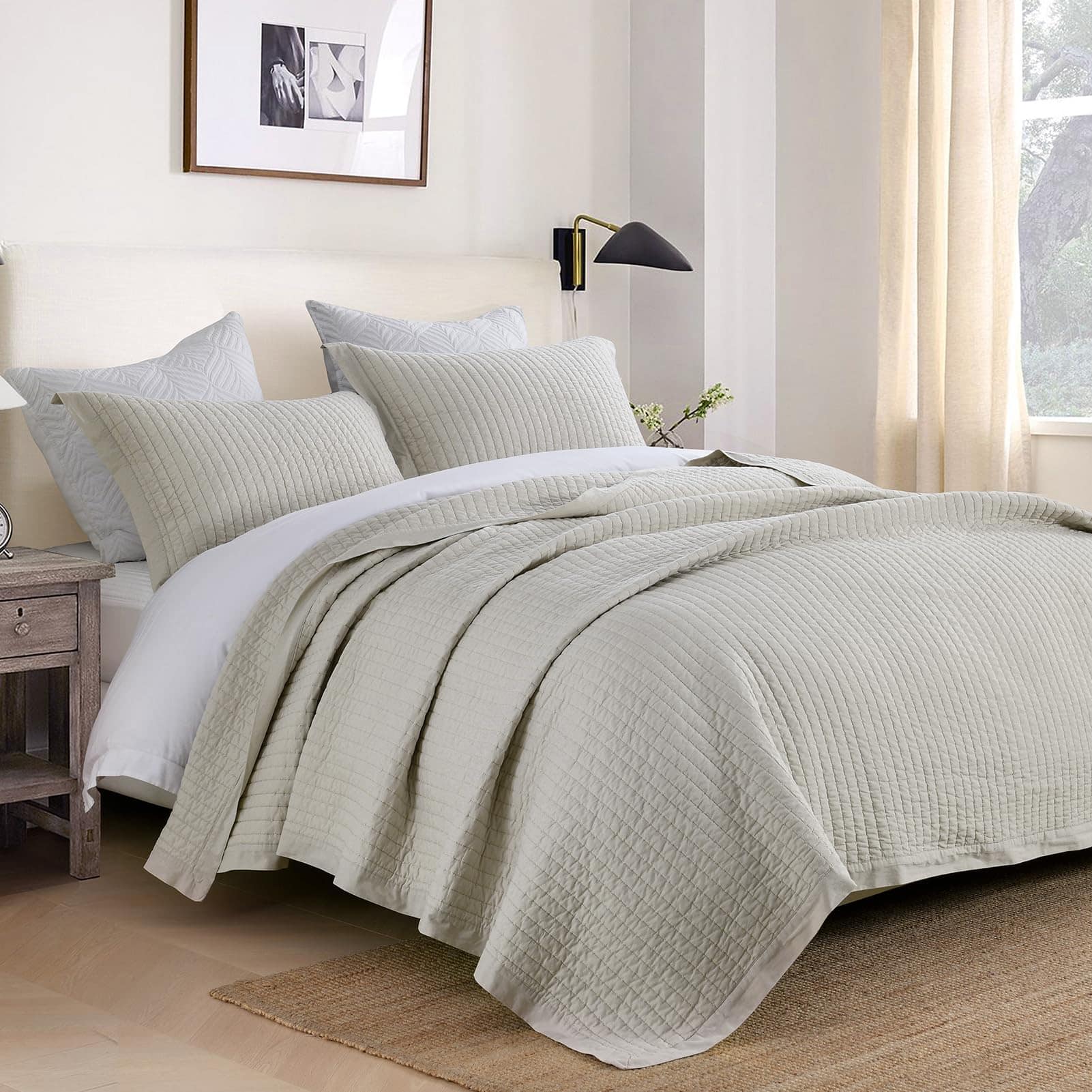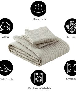 Juego de Colchas Queen Size PANGUSHAN, 100% Algodón. Este juego de colchas de algodón natural 100% es más saludable y transpirable que las opciones sintéticas. Su suavidad y durabilidad lo convierten en una excelente elección para su cama. La colcha es minimalista, elegante, cómoda y versátil, perfecta para cualquier decoración de habitación. Puede usarse en el dormitorio, sala de estar, habitación principal, habitación de invitados, estudio, airbnb, dormitorios y RVs. También es ligera y portátil para su uso en interiores y acampadas al aire libre. Este juego de colchas es adecuado para todas las estaciones: primavera, verano, otoño e invierno. Si tiende a sudar más por la noche, la colcha puede usarse sola en clima frío o junto con una manta o edredón. El juego de colchas para Queen incluye una colcha de 90 x 98 pulgadas y 2 fundas de almohada de 20 x 28 pulgadas. El material duradero y las costuras firmes garantizan un uso a largo plazo, mientras que el diseño ligero facilita su transporte, cuidado y lavado. ¡Una excelente opción para su hogar o como regalo!