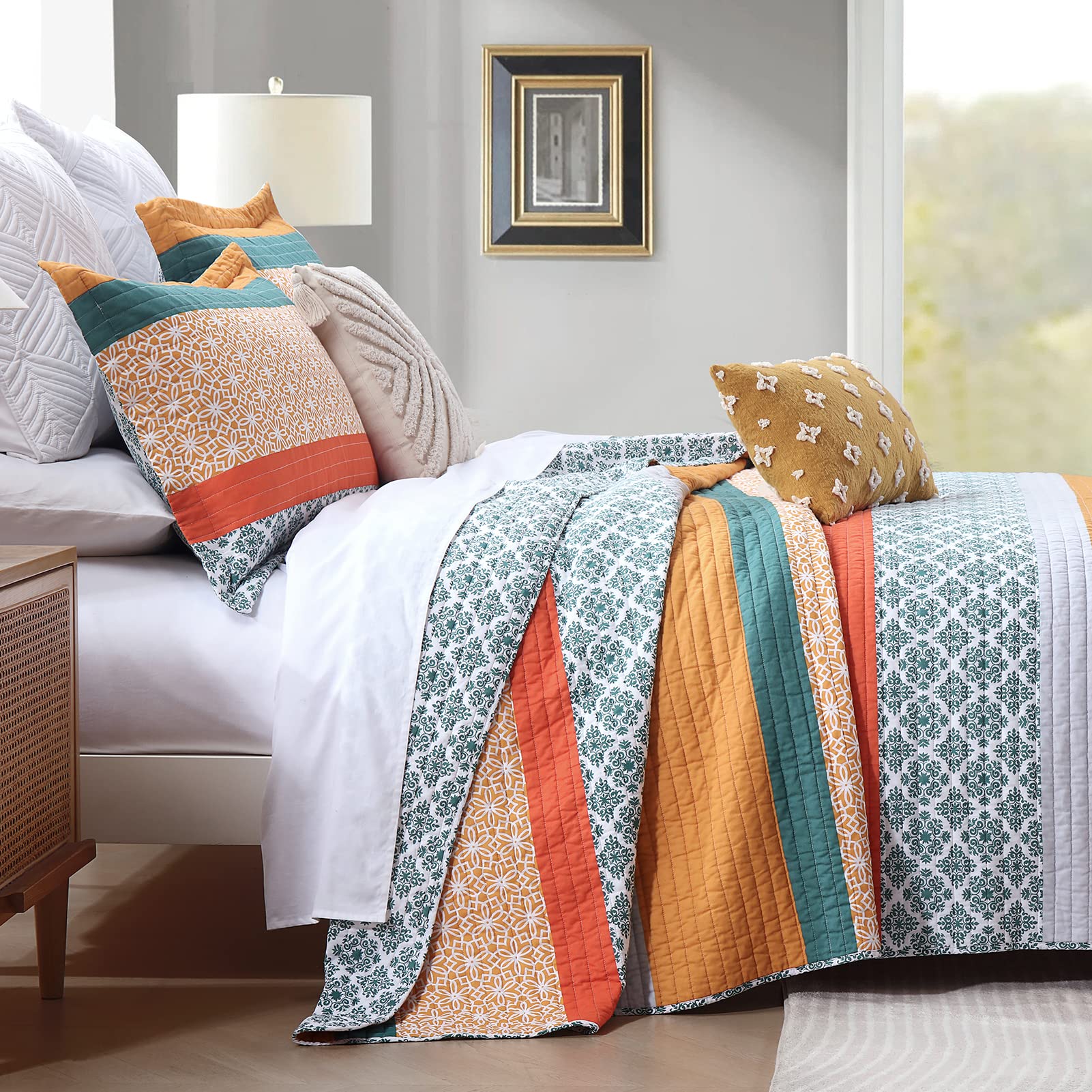1. Algodón Natural 100% – La tela y el relleno están hechos de algodón natural 100%, es más suave y saludable, más transpirable y amigable con la piel. También es una buena opción para personas con constitución alérgica o que tienden a sudar más al dormir. 2. Ampliamente Aplicable y Decorativo – Este juego de colchas clásico en tonos verde/naranja, diseñado con patrones florales y rayados, hace que tu habitación sea acogedora. Este juego de colchas decorativas también puede combinar fácilmente con la decoración de tu habitación, sala de estar, habitación principal, habitación de invitados, estudio, dormitorio y RVs. 3. Uso Todo el Año – Las costuras limpias y apretadas garantizan un uso a largo plazo. El diseño de tres capas y el relleno de algodón 100% en el interior hacen que este juego de colchas sea ligero pero cálido, adecuado para la primavera, verano, otoño e invierno y se puede usar como juego de colchas, juego de cubrecamas, colcha y juego de edredón. Se puede usar solo o con una manta o edredón. 4. Juego de Colchas King de 3 Piezas Incluye – 1 Colcha: 98″ x 106″; 2 Fundas de almohada: 20″ x 36″. 5. Instrucciones de Cuidado – Lavar a máquina por separado en agua fría, secar en ciclo suave, no usar lejía. La colcha seguirá manteniendo el calor y su forma original después del lavado. Si tienes mascotas, la colcha lavable también es una buena opción.