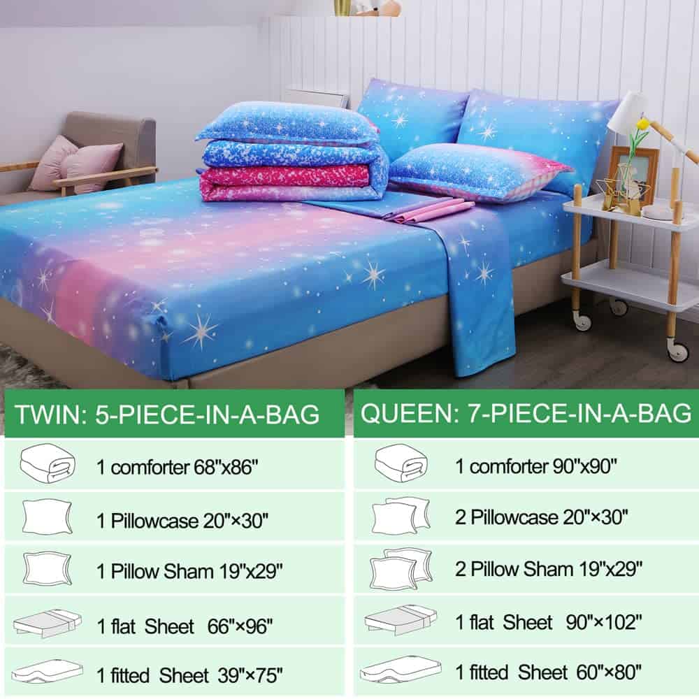 4. Tamaño: Comforter Tamaño Queen 90″x90″(228x228cm), Funda de Almohada 20″x29″(50x75cm). Sábana Plana 90″x102″(228x259cm), Sábana Ajustable 60″x80″(152x203cm), Funda de Almohada 20″x30″(50x76cm).