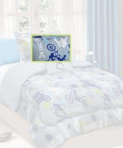 El juego de comforter X-TremeSports es perfecto para el skater, ciclista de montaña o snowboarder en tu casa. Las figuras deportivas en silueta hacen un patrón divertido en un lado del comforter, mientras que el reverso es un color sólido relajante. El comforter individual viene con una funda de almohada a juego para un juego completo de cama en un solo paquete fácil. Completando el set está una almohada de acento con un skater para completar el look. La construcción de poliéster es duradera y lavable a máquina. El comforter mide 76″ x 86″. Esta ropa de cama añade un toque de pizazz a cualquier dormitorio de niño o adolescente.