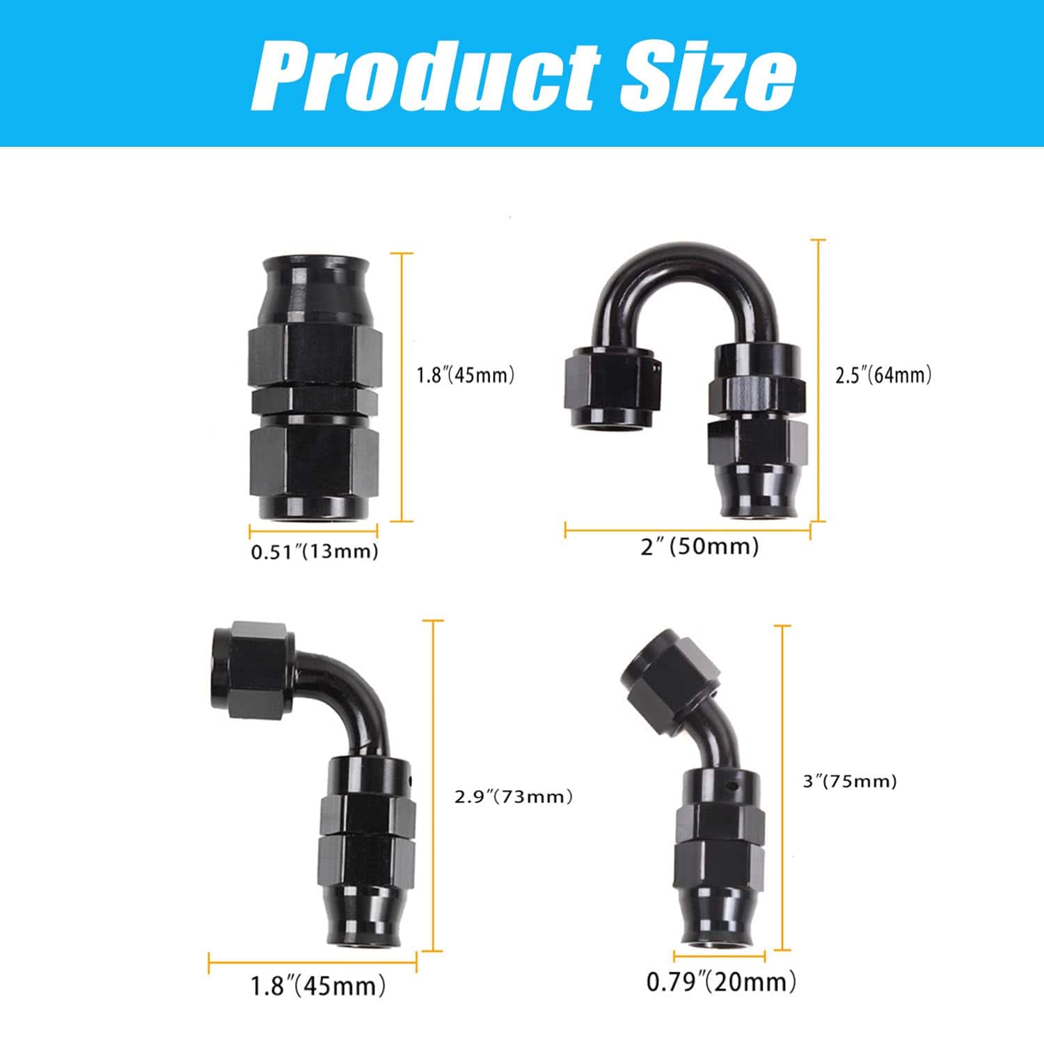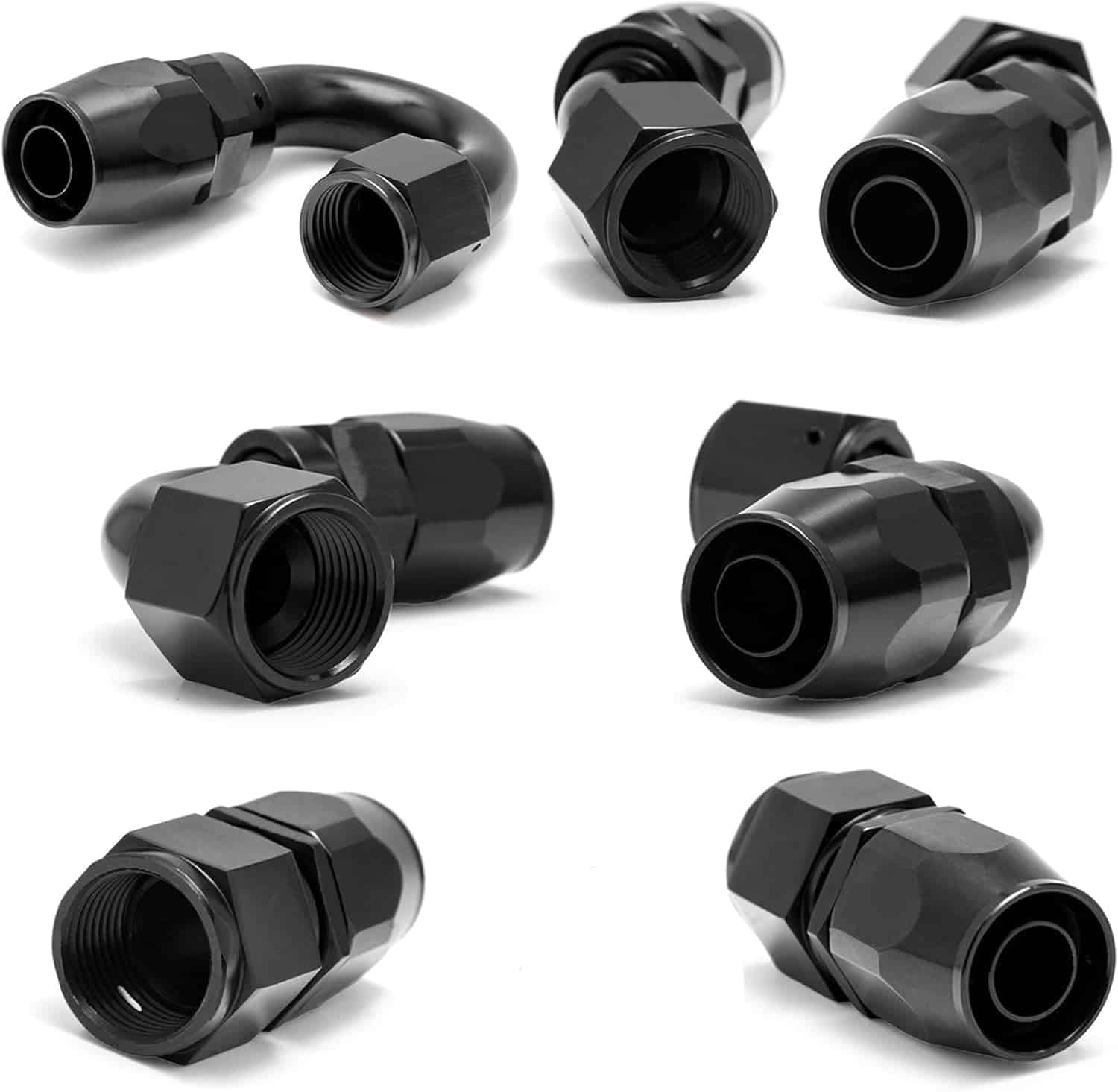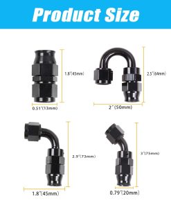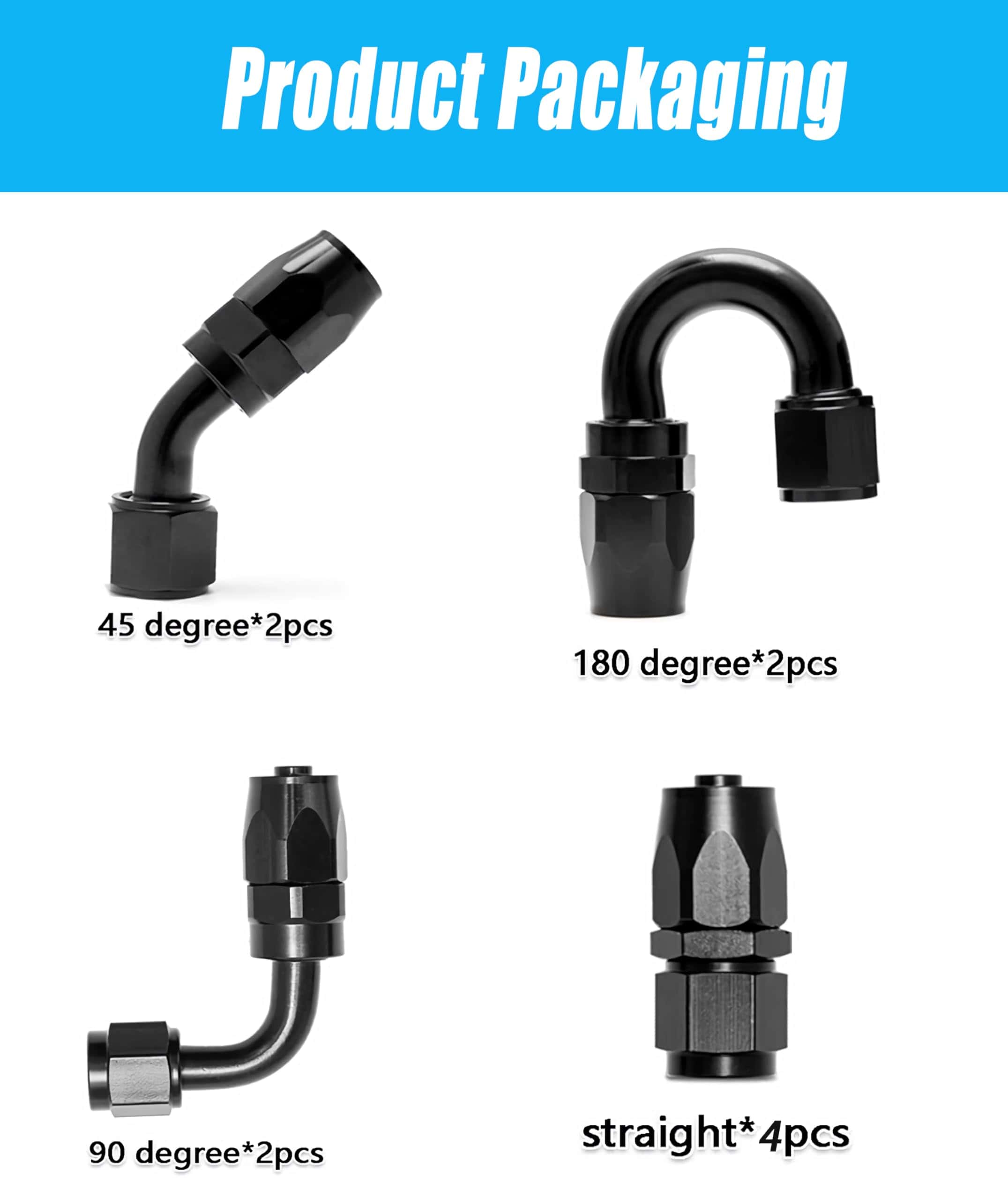4. PAQUETE INCLUYE: 4 unidades de Conector Recto 6AN + 2 unidades de Conector 45 Grados 6AN + 2 unidades de Conector 90 Grados 6AN + 2 unidades de Conector 180 Grados 6AN.