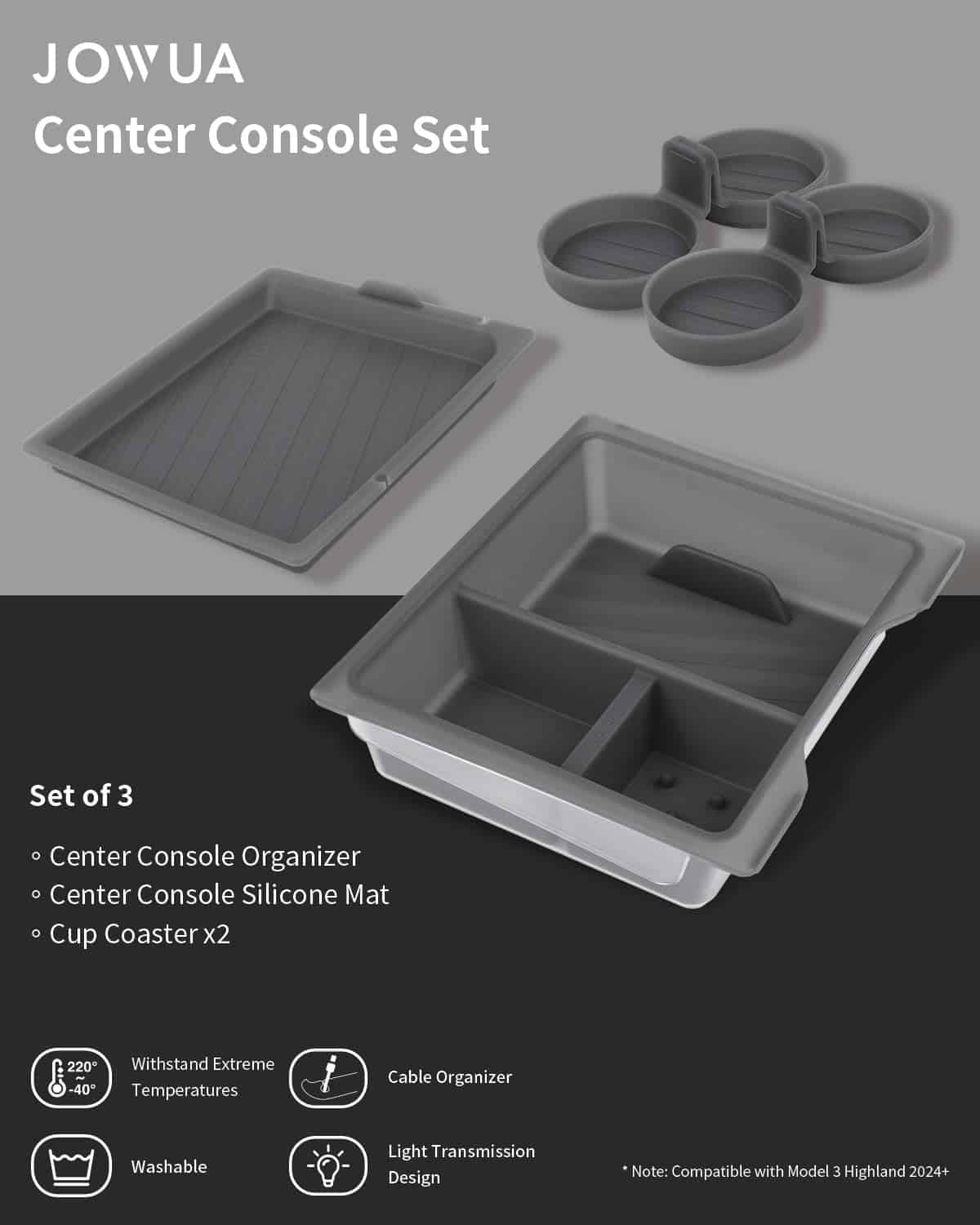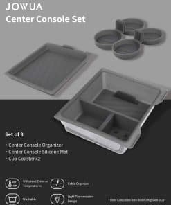 Este Juego de Consola Central de JOWUA está diseñado específicamente para Tesla Reengineered Model 3 Highland 2024+, e incluye una variedad de elementos para ayudarlo a organizar y mejorar su consola central. El organizador de consola central está hecho de materiales de alta calidad y está diseñado para ayudarlo a mantener su consola central ordenada y limpia. Cuenta con múltiples compartimentos y bolsillos para guardar diversos elementos, como su teléfono, llaves, billetera y otros objetos pequeños. La silicona y el estuche inferior tienen un diseño transparente, que mejora la transmisión de luz integrando el LED original desde la cabina de la consola central. Los posavasos están hechos de silicona antideslizante y están diseñados para adaptarse a los portavasos delanteros y traseros de la consola central. El material de silicona flexible y lavable le permite limpiar fácilmente. El tapete de silicona de consola central está hecho de silicona de alta calidad y está diseñado para evitar que los cables de carga se enreden. En general, este Juego de Consola Central de JOWUA es una excelente adición para cualquier propietario de Tesla Model 3 Highland 2024+ que desee mantener su consola central organizada y ordenada.