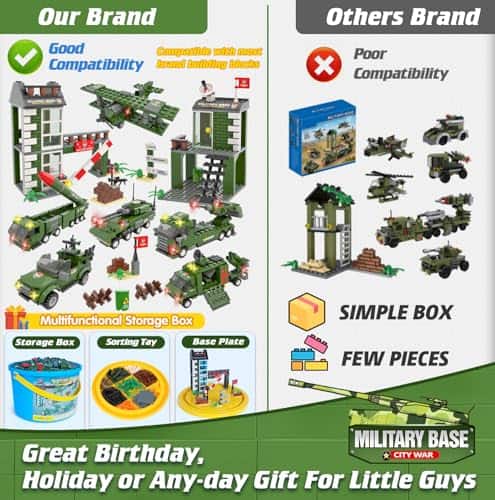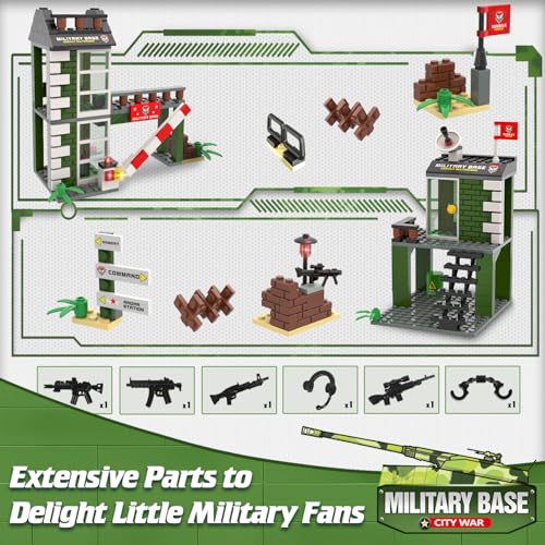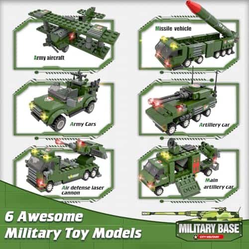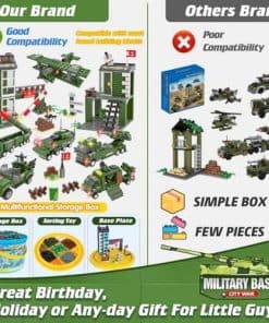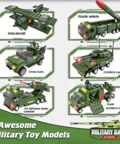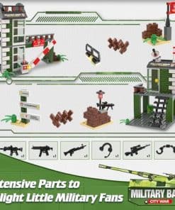¡Lleva la emoción de la batalla militar a casa con el juego de construcción de base militar WishaLife City War! Este set de juguete de ejército incluye 1162 piezas de ladrillos que permiten a los niños construir más de 20 tipos diferentes de equipamiento militar, desde vehículos de misiles hasta puestos avanzados y búnkeres de batalla. El diseño realista de los modelos de vehículos militares hará que la imaginación de los niños se dispare mientras crean sus propias aventuras de batalla. Además, el set viene con una guía instructiva fácil de seguir, pegatinas decorativas y piezas de armas de juguete para hacer que los modelos sean aún más emocionantes. La caja de almacenamiento portátil incluida hace que sea fácil para los niños y sus padres guardar todas las piezas y transportarlas a donde quiera que vayan. ¡Deja que tus pequeños se conviertan en héroes de batalla con el juego de construcción de base militar WishaLife City War!