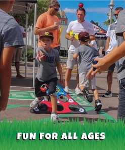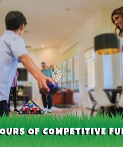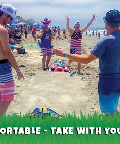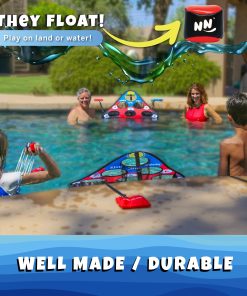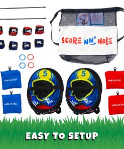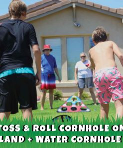 ¡El juego de Cornhole Toss, Roll, Land o Water de fácil configuración hace que este sea el juego de cornhole más versátil de todos! ¡Es un juego de patio trasero que combina lo mejor de todos los mundos! Perfecto para que todas las edades jueguen juntas. Fácil de instalar, bien hecho, portátil y vale la pena por las horas de competencias divertidas en familia. Los jugadores se turnan para lanzar o rodar las pelotas hacky. Edades 6 años en adelante. 1-4 jugadores. INCLUYE: 2 objetivos SCORE NN’ HOLE, 4 pelotas hacky rojas y 4 azules, 2 bolsas de peso azules y 2 rojas, 2 anillos de puntuación rojos y 2 azules, y una bolsa de transporte.