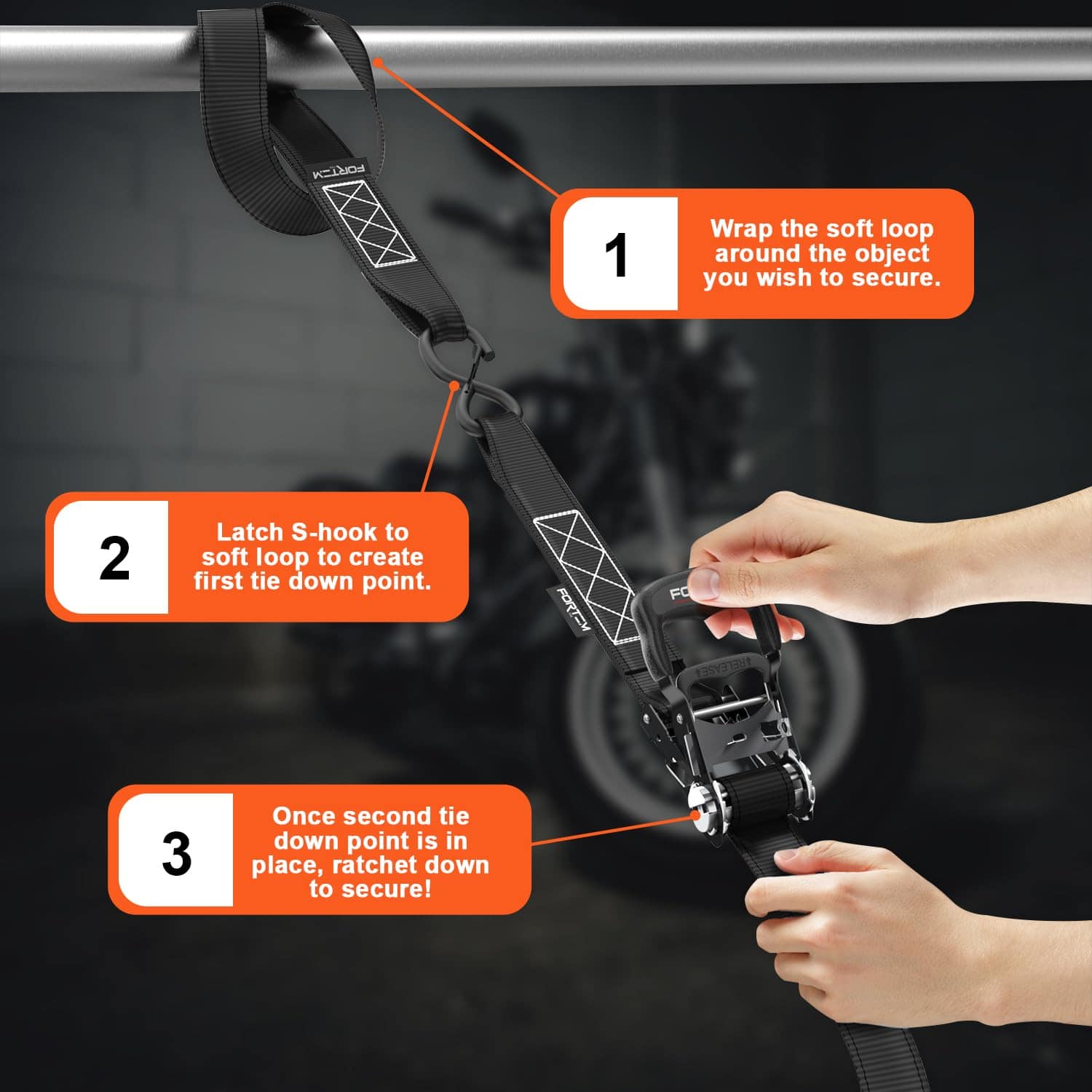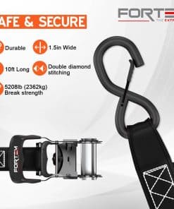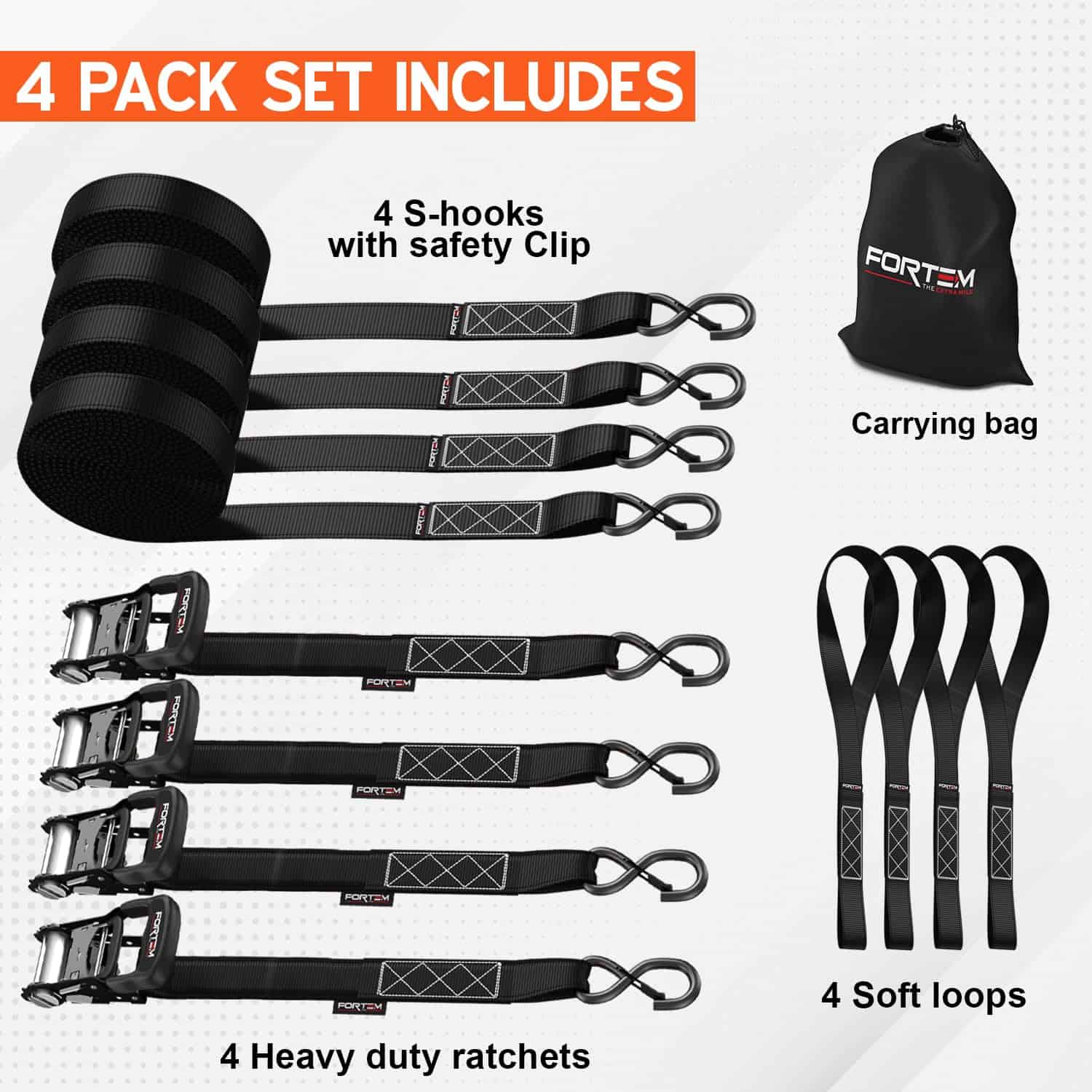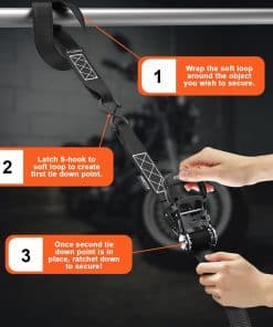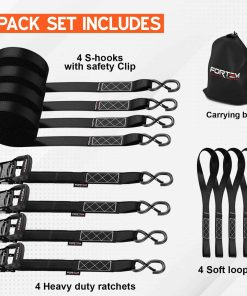 ¿Cansado de usar correas de amarre de nailon baratas que se aflojan después de algunos usos y buscas una alternativa resistente y duradera ¡Entonces estás en el lugar adecuado! Nuestras correas son muy superiores y mucho más seguras que otros métodos de amarre de carga y equipo pesado, incluido el cordel. Estas correas de 15 pies y 1.5 pulgadas tienen una capacidad de carga de 2250 libras y una resistencia a la rotura de 4500 libras, por lo que las reseñas no mienten cuando dicen que estas son algunas de las correas de amarre más fuertes del mercado. Usa nuestras correas para asegurar de manera segura carga pequeña o grande o equipo durante el transporte, ya sea en automóvil, SUV, camioneta pickup o remolque utilitario. Nuestras correas son perfectas para sujetar kayaks, canoas, motocicletas, bicicletas de montaña, motos acuáticas y más. También son resistentes a la intemperie y resistentes. Como nuestras correas de amarre son tan fáciles de usar, colocarlas es pan comido. Úsalas hoy para proteger tus bienes, ya sea que te mudes a una nueva casa, vayas a hacer canotaje o camping, o simplemente tengas que transportar un árbol de Navidad. También sirven como excelentes correas para equipaje ¡La red de poliéster de alta visibilidad naranja es impenetrable a abrasiones y apenas absorbe agua y no se estira (a diferencia del nailon) Los ganchos de acero inoxidable no dañarán ni rayarán tu carga Totalmente retráctiles y más confiables que las correas de amarre y las correas de trinquete de leva Ideales para asegurar cargas anchas Viene en un paquete de 4 muy asequible y práctico 4 Hebillas de Trinquete de Metal 4 Correas de Gancho 4 Lazos Suaves 1 Estuche de Transporte Estuche de Transporte (aprox.): L 10.3″ x A 8.3″ x H 2.4″ (26.1 cm x 21.1 cm x 6.1 cm) Material: Poliéster de Alta Calidad, Ganchos de Acero Inoxidable, Ganchos de Núcleo de Acero Plástico recubierto de rayos UV Las correas de trinquete (y lazo suave) tienen material: poliéster de alta calidad Longitud de las 4 correas de trinquete – 15 pies Ancho de las 4 correas de trinquete y 4 lazos suaves – 1.5 pulgadas Límite de carga: 2250 libras máximo Resistencia a la rotura: 4500 libras Color de la correa: Naranja