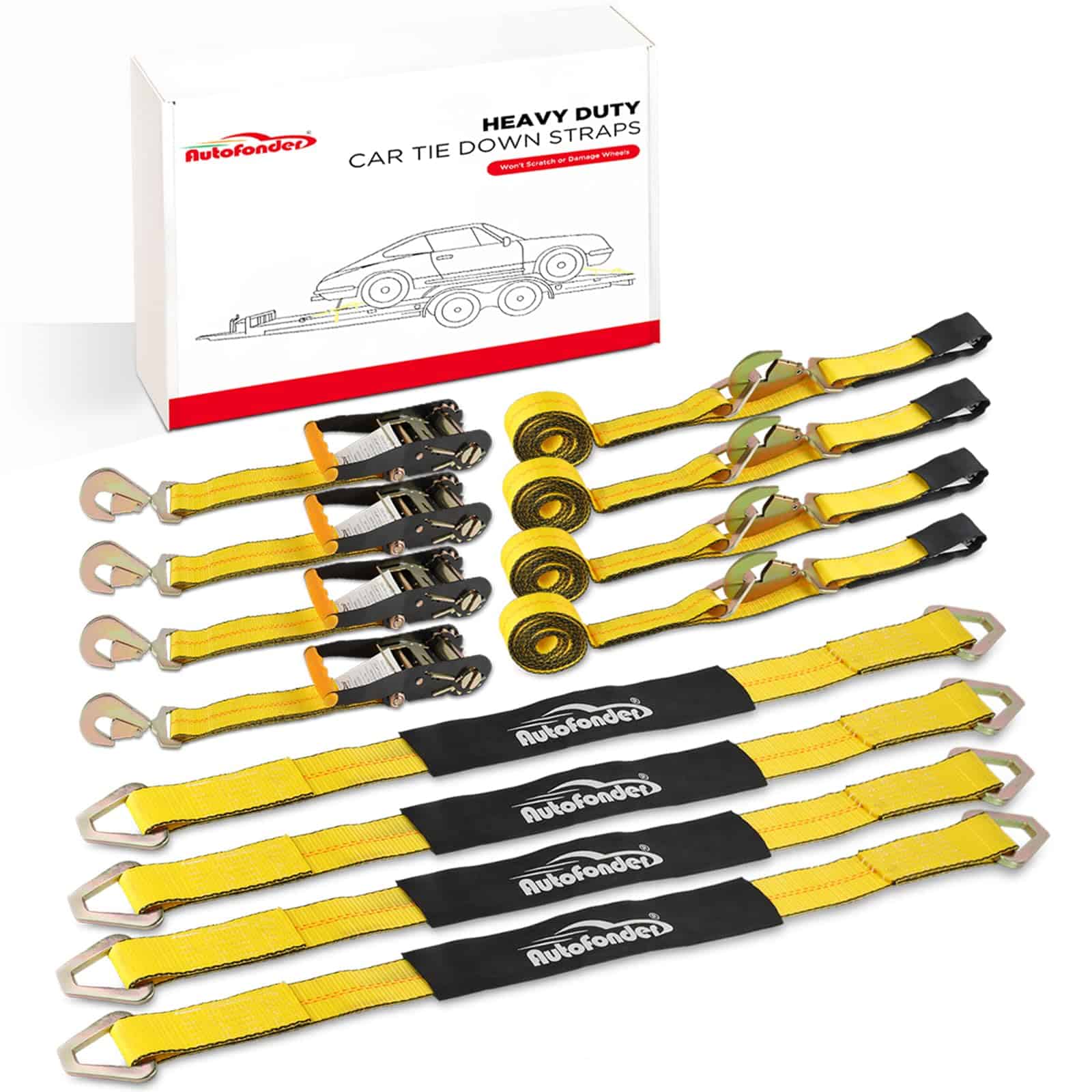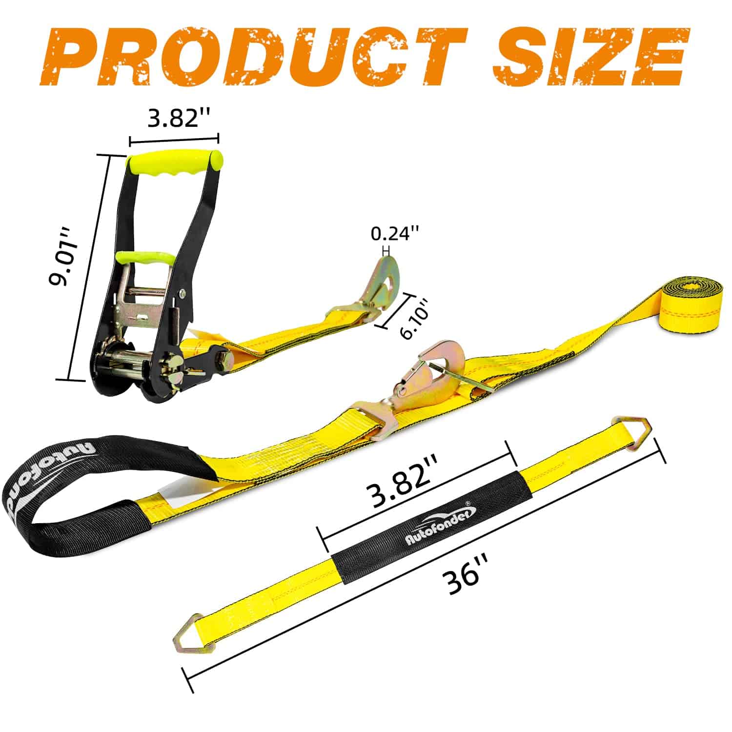 1. APLICABLE A LA MAYORÍA DE LOS NEUMÁTICOS: Las correas de amarre para automóviles se utilizan para pasar por las llantas del vehículo transportado, pueden usar correas de neumáticos para un remolque de coche, eje o bastidor, las correas con trinquete contienen 4 trinquetes con gancho de presión, 4 correas de neumáticos de 2 «x10�, 4 correas de eje de 2» x36, perfectas para correas de trinquete de coche, amarre de remolque, correas de camión, SUV, correas de amarre de motocicletas a cualquier remolque o plataforma plana.