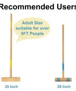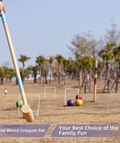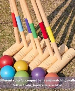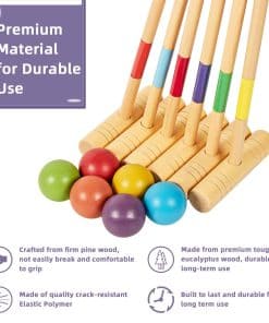 Los materiales premium utilizados en la fabricación de este set, como la madera de pino para los mangos de los mallets y el eucalipto para las cabezas, garantizan durabilidad y resistencia a largo plazo. Las bolas de croquet están hechas de Polímero Elástico para asegurar un juego suave y preciso.