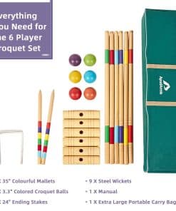 Además, la facilidad de instalación y aprendizaje hace que este set sea perfecto para que toda la familia disfrute de una tarde jugando al croquet en el jardín. Con la bolsa de transporte incluida, podrás llevar todos los componentes del set a donde quieras, permitiéndote disfrutar de la diversión del croquet en cualquier lugar.