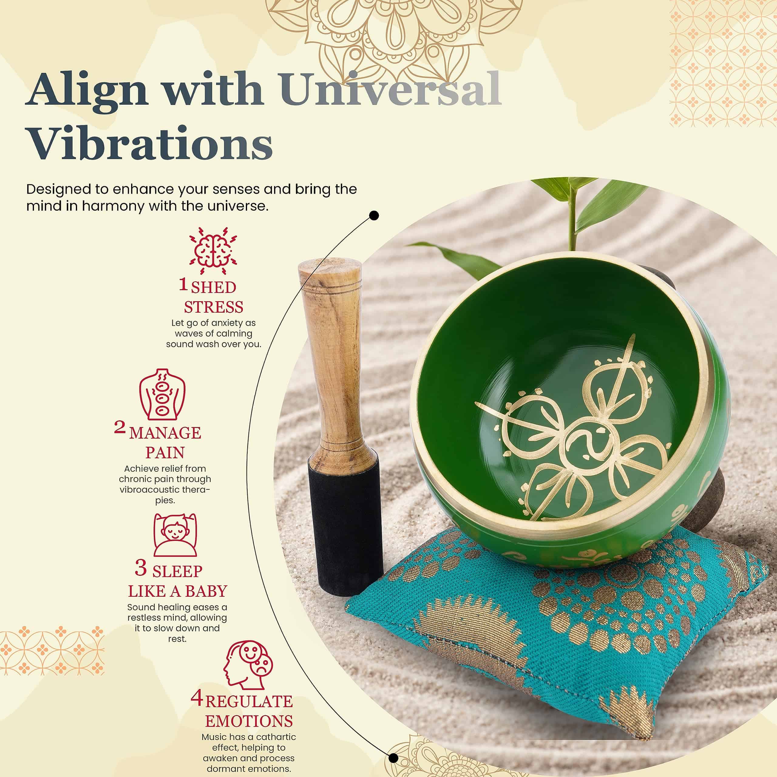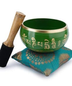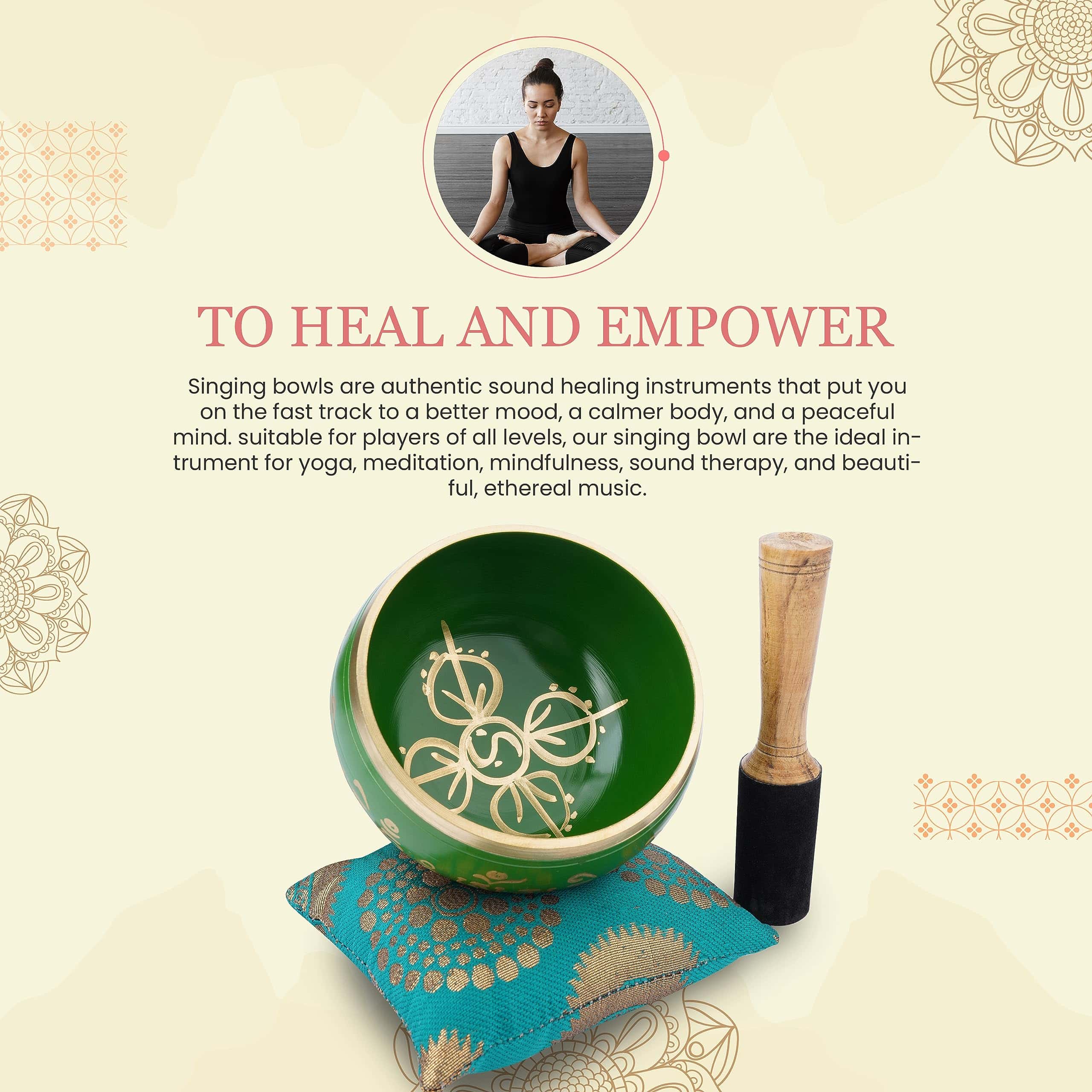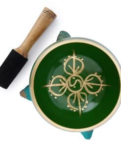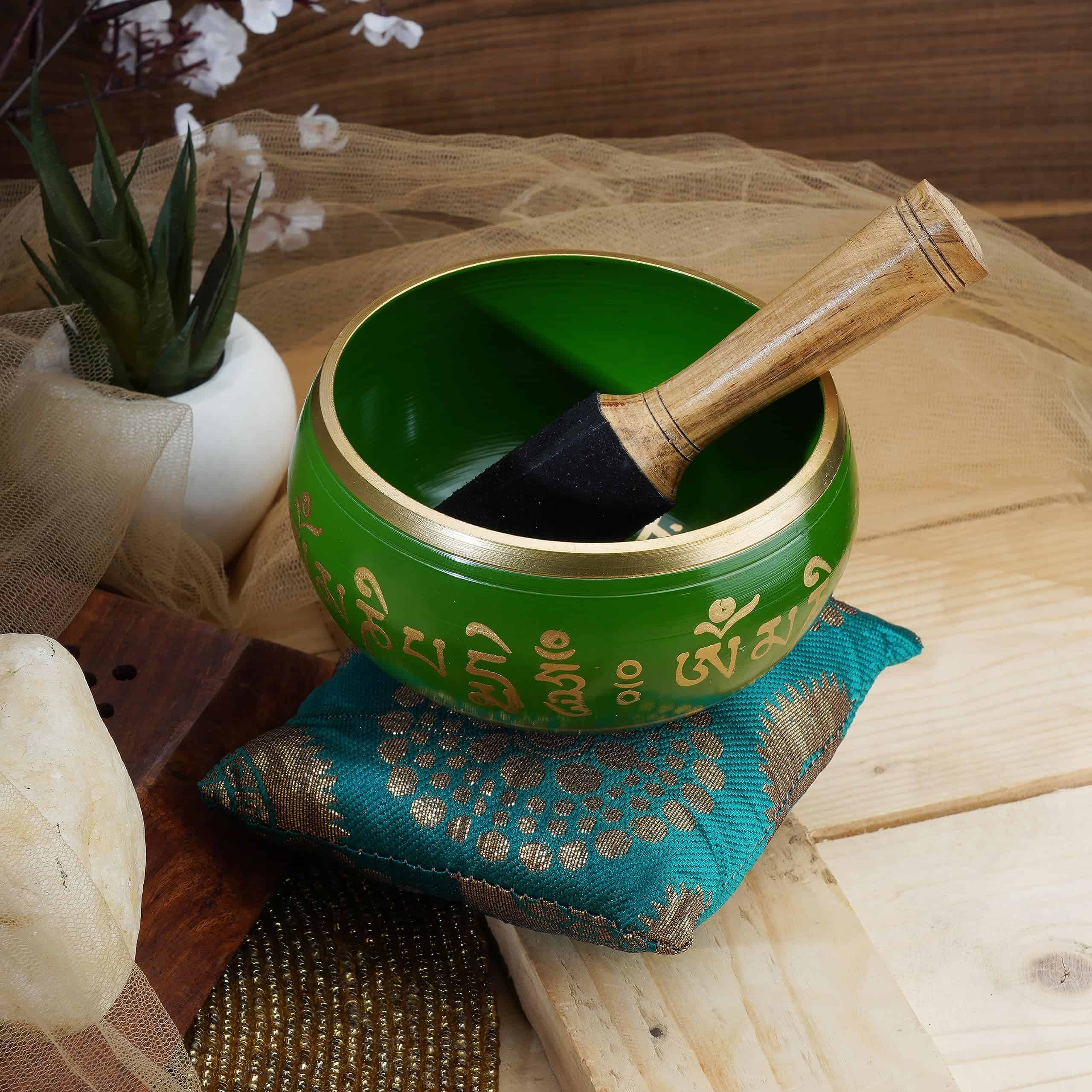 Cuenco Tibetano Budista Ajuny – Flecha Yin/Yang – OM Verde – Sonido de Meditación Campana – 4 Pulgadas para Alivio del Estrés, Relajación Profunda y Energía Positiva Terapia Musical – Palo y Cojín Incluido