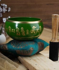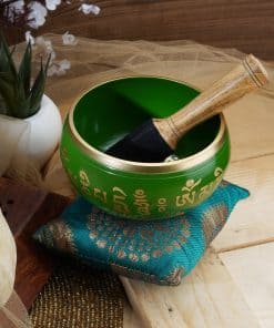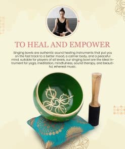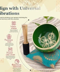 Características: Diseño Exquisito: El impresionante diseño inspirado en la flecha Yin/Yang – Verde y color cautivador añaden belleza y serenidad a tu espacio de meditación. Tamaño Perfecto: Con un diámetro compacto de 4 pulgadas y una profundidad de 2.25 pulgadas, es fácil de sostener y portátil para usar en cualquier lugar. Set Completo: Incluye un palo golpeador para crear sonidos tipo campana y un hermoso cojín de brocado para un soporte cómodo. Creación de Tonos Pulsantes: Golpea el cuenco y circula el borde en movimiento horario para evocar vibraciones resonantes y un sonido relajante. Alivio del Estrés y Relajación Profunda: Alivia el estrés, la tensión e induce una relajación profunda para tu mente, cuerpo y espíritu.