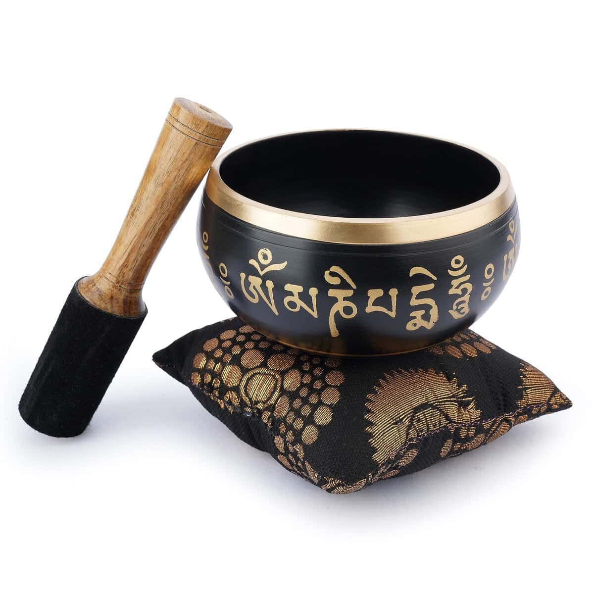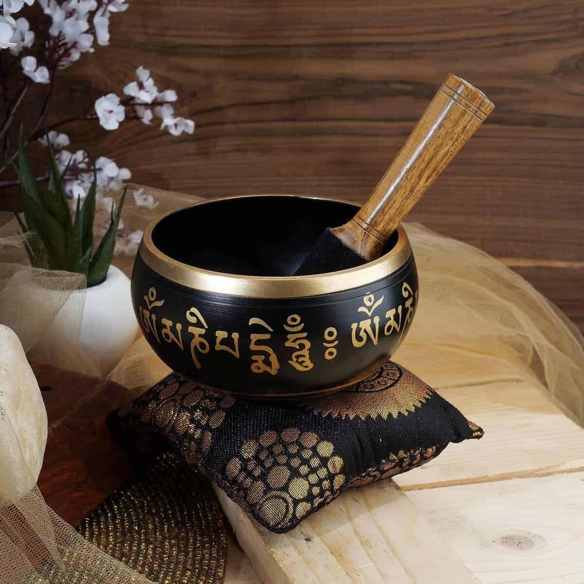 Cuenco Tibetano Budista Ajuny – Buda Sentado – Negro Campana OM de Meditación Sonido – 4 Pulgadas para Alivio del Estrés, Relajación Profunda y Energía Positiva Terapia Musical – Incluye Palo y Cojín