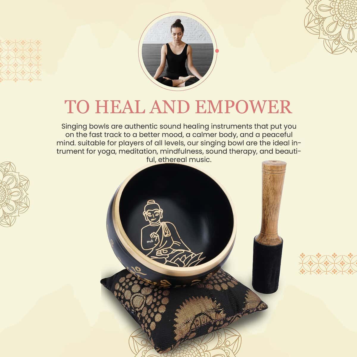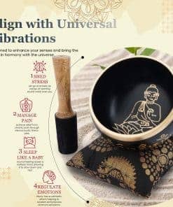 Características: Diseño Exquisito: El impresionante diseño inspirado en el Buda Sentado – Negro y el color cautivador agregan belleza y serenidad a tu espacio de meditación. Tamaño Perfecto: Con un diámetro compacto de 4 pulgadas y una profundidad de 2.25 pulgadas, es fácil de sostener y portátil para usar en cualquier lugar. Set Completo: Incluye un palo golpeador para crear sonidos tipo campana y un hermoso cojín de brocado para soporte cómodo. Creación de Tono Pulsante: Golpea el cuenco y circula el borde en un movimiento circular para evocar vibraciones resonantes y un sonido relajante. Alivio del Estrés y Relajación Profunda: Alivia el estrés, la tensión e induce una relajación profunda para tu mente, cuerpo y alma.