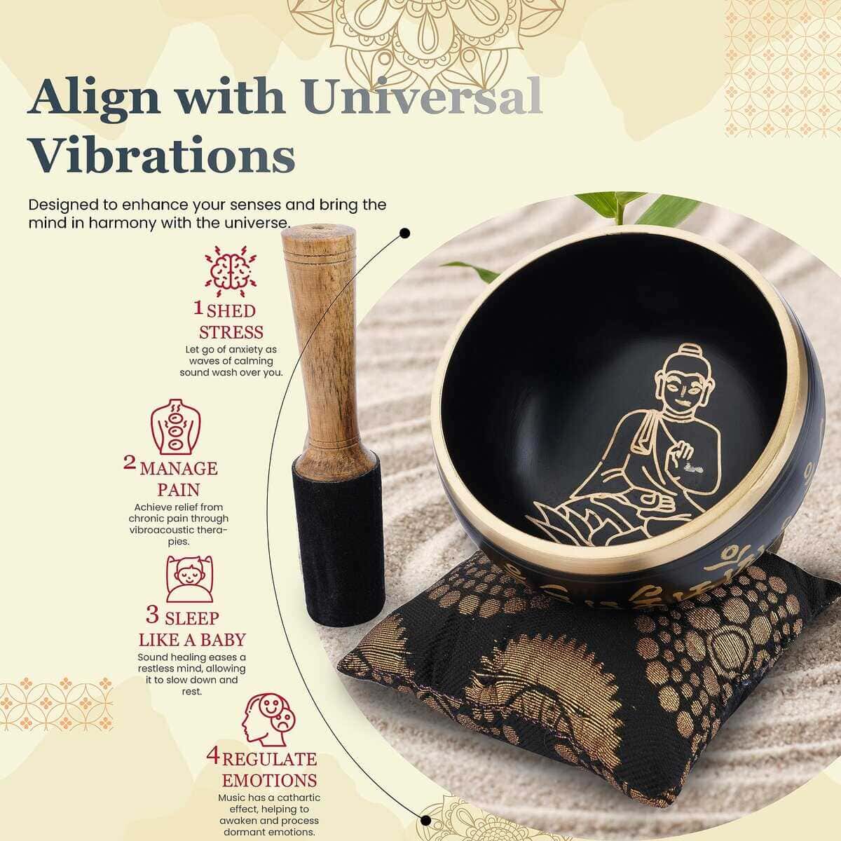 Sumérgete en una relajación profunda con este cuenco de meditación. Siguiendo las instrucciones simples, puedes crear hermosos sonidos resonantes que inducen un estado de tranquilidad y te ayudan a lograr una mente y cuerpo pacíficos.