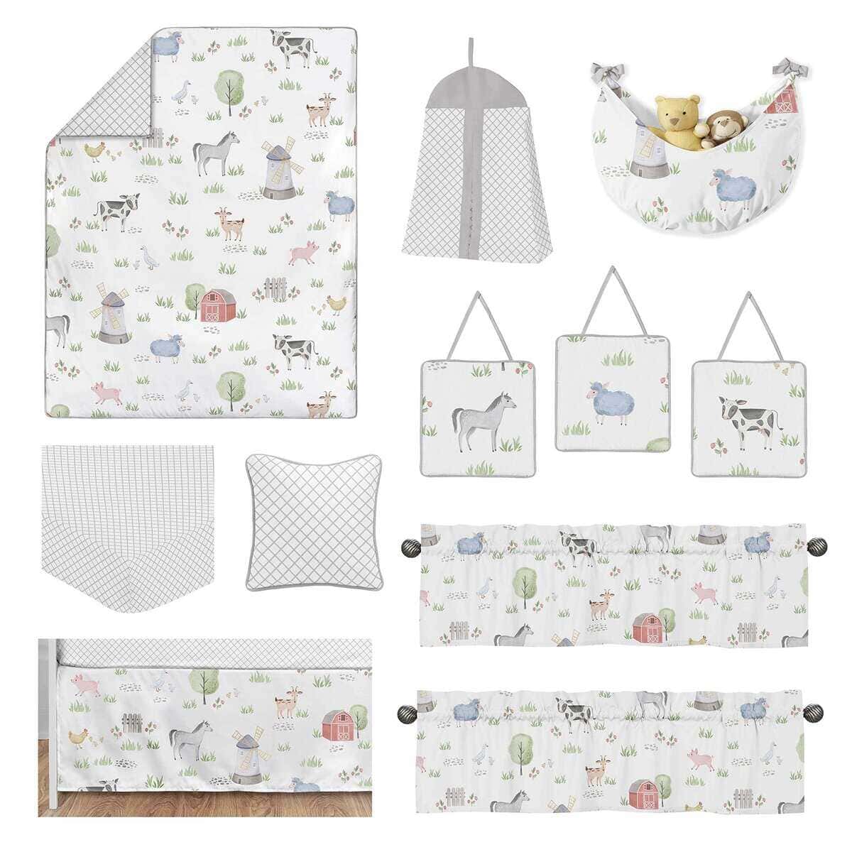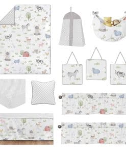 ¡Prepara la cuna de tu bebé con este hermoso juego de ropa de cuna de Sweet Jojo Designs! El set de 11 piezas incluye todo lo que necesitas para decorar la cuna de tu pequeño. La manta de cuna, falda, sábana ajustable, pañalera, bolsa de juguetes, almohada y set de 3 cuadros están decorados con un diseño de granja de acuarela que incluye cerdos, caballos, cabras, gansos, pollos y ovejas. Además, la suave microfibra cepillada garantiza comodidad para tu bebé y es fácil de lavar. Completa la decoración de la habitación con los accesorios a juego disponibles. ¡Haz de la hora de dormir un momento aún más especial con este encantador juego de cuna!