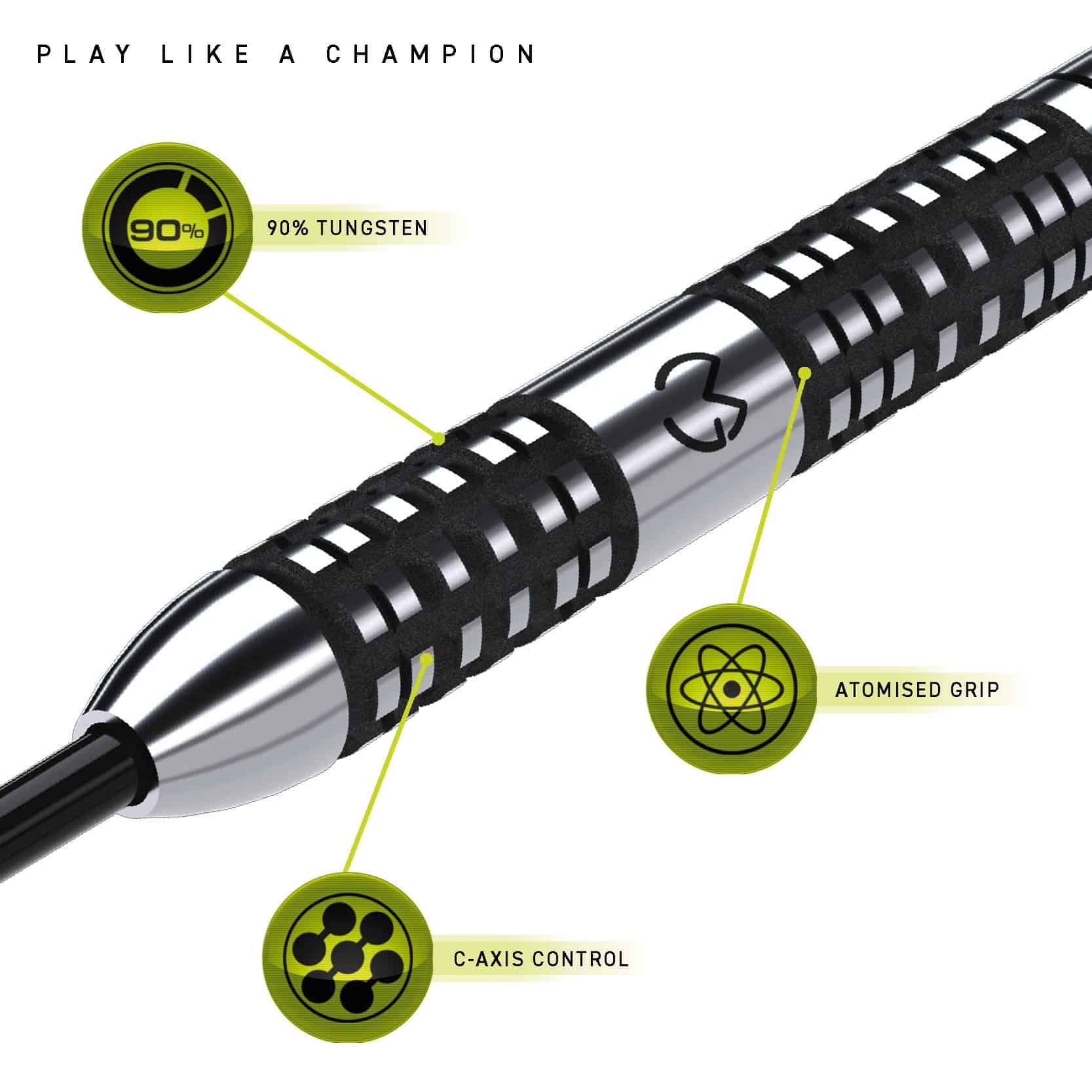 Set de 3 x 24g – Juego de dardos de punta de acero de tungsteno de alta calidad premium Winmau; Winmau Vecta ejes y Winmau Prism vuelos; Alto protector de punta MvG; Fiel a la atención maníaca de MvG al detalle, Winmau ha creado este diseño único de corte de triple eje diseñado para alinearse con los talentos del mayor icono del deporte; La combinación Absoluta de miles de horas de desarrollo de ingeniería y perfección del Número 1 Mundial. Trae tu mejor juego