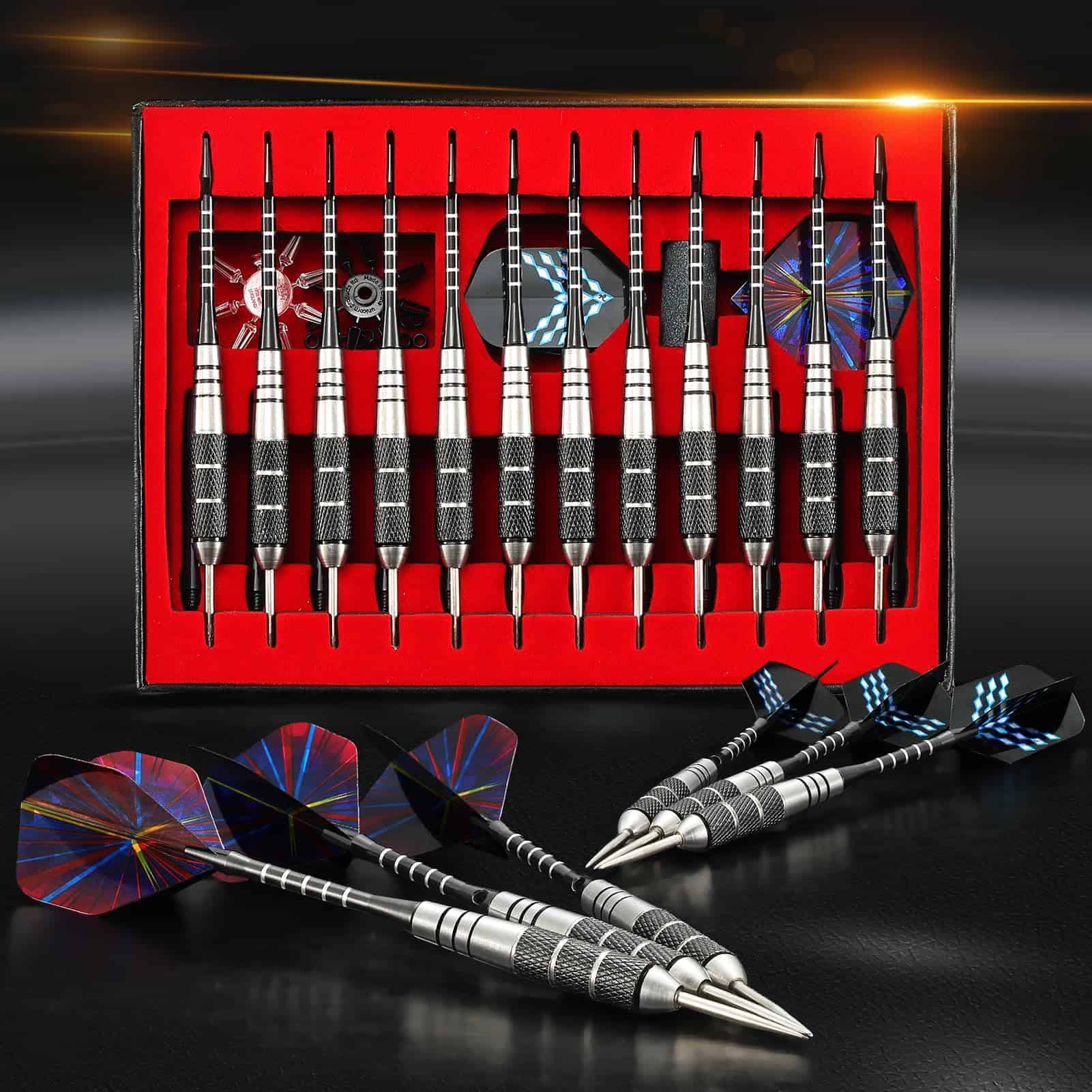 Los dardos de punta de metal están diseñados con barriles de hierro texturizados de alta calidad que proporcionan un excelente equilibrio y control mejorado al lanzar, y cada dardo de punta de acero pesa 22 gramos. Diferentes estilos de juegos de dardos, como calavera, color sólido, color láser, etc. Afile su precisión de movimiento y dirección. Cada pieza fue diseñada y fabricada para un equilibrio óptimo, agarre, peso y velocidad. Viene con anillos de goma para evitar que se aflojen durante el juego. El eje de aluminio es duradero y no es fácil de romper. Perfecto para todos los niveles de habilidad. Estos dardos para el tablero de dardos se seleccionan cuidadosamente entre diferentes vuelos y ejes para proporcionar una variedad de combinaciones. Este dardo para adultos es adecuado para aficionados o jugadores profesionales de todos los niveles de habilidad para disfrutar de un divertido juego de dardos o consejos competitivos de dardos con amigos. Elección de regalo ideal. Con una hermosa caja de regalo que los hace fáciles de transportar y almacenar, cada dardo tiene su lugar de almacenamiento designado. Nuestro juego de dardos de punta de acero se puede usar en muchas ocasiones, como reuniones familiares, fiestas, etc. Ideas de regalos para hombres. ¡No olvides obtener un juego adicional para un amigo! Excelentes regalos para hombres o papás en Acción de Gracias, Navidad y el Día del Padre.