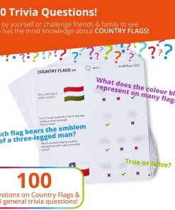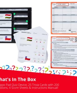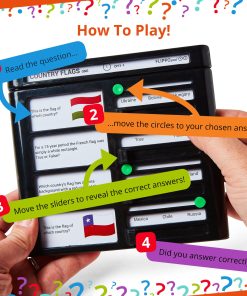 TRIVIA QUIZ GAME – Challenge your knowledge of Country Flags with the Flippo Pad Quiz Game! Not only is this game a fantastic source of entertainment, but it also serves as a valuable educational tool. The quiz game arrives complete with the Flippo Pad device and 25 trivia cards! The trivia pack has 100 fun and interesting questions all about Country Flags as well as 100 general knowledge questions – designed to help improve knowledge, memory, and intelligence. HOW TO PLAY – Simply slot the trivia cards into the device, read the question, and move the green circle over your chosen answer. Move the slider to reveal the correct answers and see if you answered correctly! Keep the game going by resetting the sliders and moving the played card to the back of the deck. There are 3 different game modes to try out! Includes a set of instructions & 4 score sheets! IDEAL FOR – Designed for children (aged 6+), teens, and adults alike, this is the perfect quiz for the whole family! The Flippo Pad Quiz Device provides hours of entertainment! Designed for both travel and enjoyment, Flippo pad is the perfect travel game that will make your road trips or plane journeys truly memorable. Experience hours of entertainment with this compact and portable game that easily fits in your pockets or bags. SUPER PRESENT IDEA – The Flippo Pad Quiz Game is a brilliant present for curious minds! Whether it’s for birthdays, holidays, vacations, or parties, this game promises hours of enjoyment for all the family! Play the Flippo Pad quiz game by yourself or challenge friends and family to see who has the most knowledge about Country Flags! OTHER TOPICS – The Flippo Pad Quiz Game device is compatible with all Flippo Pad trivia packs! We have a wide range of trivia card packs available, so you can explore and challenge yourself on a variety of different topics! Our other quiz card topics include: Bugs, Forest Animals, Geography, Space, Landmarks, Sea Creatures, Jungle Animals, and more! With many different packs to choose from, there is the endless opportunity to learn & have fun!