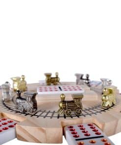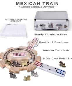 Dominó de Tren Mexicano Doble 12 con Puntos de Colores y Núcleo de Madera 8 Trenes Metálicos y Estuche de Aluminio, ideal para disfrutar de largas horas de diversión en familia o con amigos. Este set incluye un resistente estuche de aluminio con asa para facilitar el transporte y almacenamiento, dominós con colores brillantes en los puntos para una fácil identificación, núcleo de tren de madera de alta calidad con 8 marcadores de tren de metal fundido. ¡Todo listo para comenzar a jugar al emocionante juego de dominó Tren Mexicano!