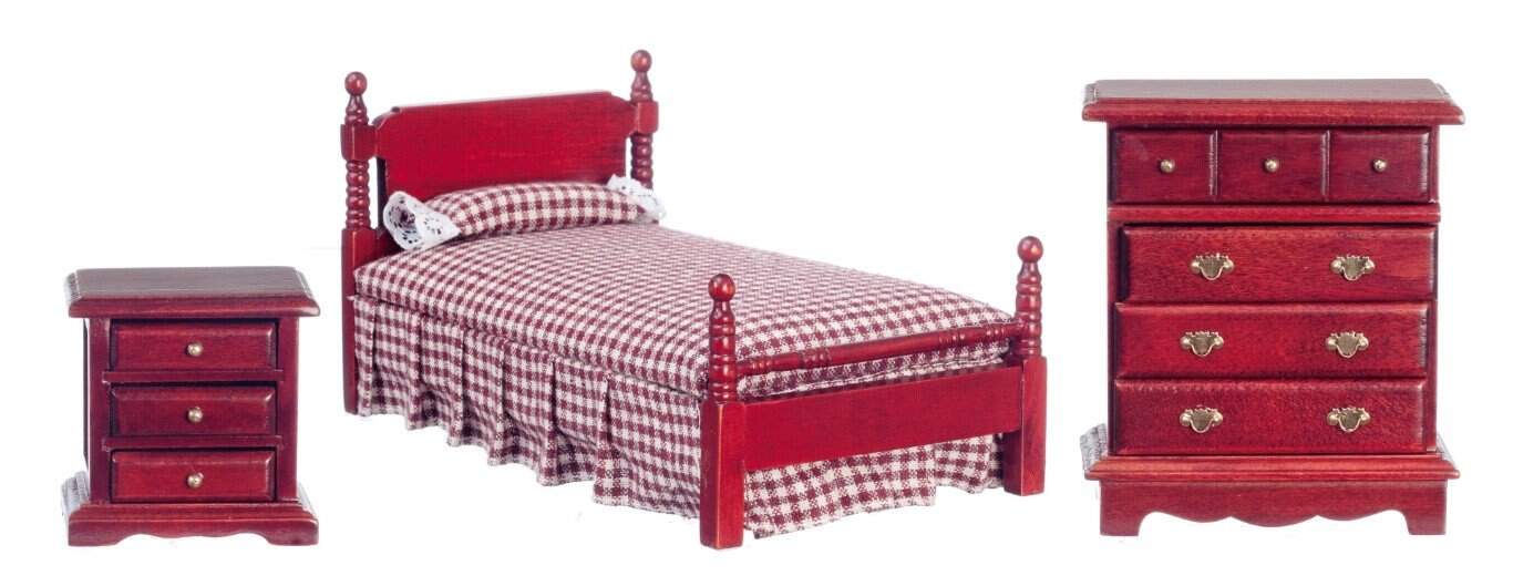 De la colección de miniaturas detalladas de Aztec Imports Town Square Miniatures. Este juego de dormitorio será una excelente adición a tu escena en miniatura. . . El set incluye cama individual con ropa de cama, tocador, mesita de noche y baúl. Los cajones son funcionales. . . Dimensiones: Cama – 3-1/2″L x 3-3/4″W x 3-3/4″H. Tocador, 3-7/8″H x 3-1/4″W x 1-1/2″D. Mesita de noche – 1-7/8″H x 2-13/16″W x 1-1/2″D. Baúl – 2″H x 3-1/4″W x 1-3/4″D. . . Escala 1:12. Este juego está diseñado para una casa de muñecas. . . Modelo detallado a escala para coleccionistas adultos. No apto para menores de 14 años.