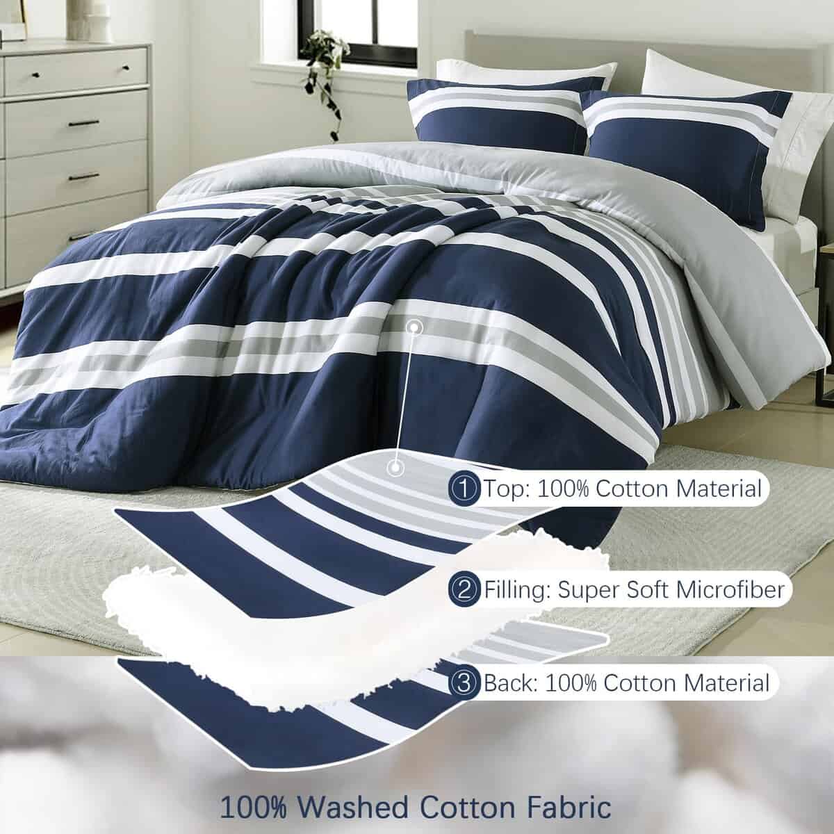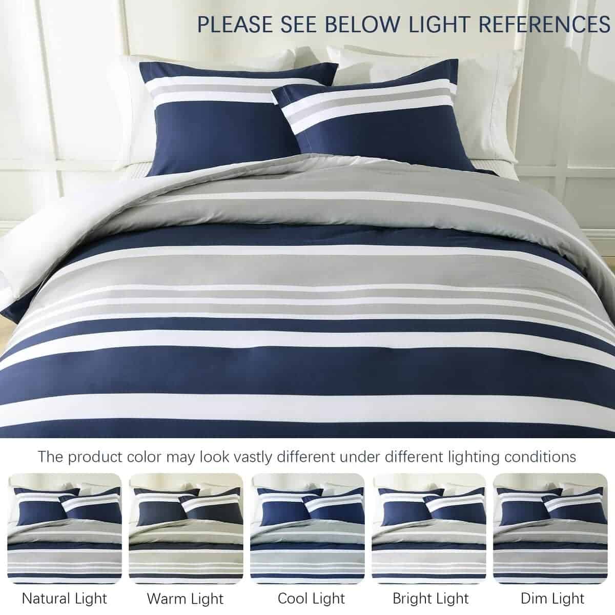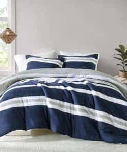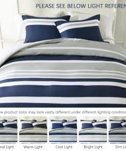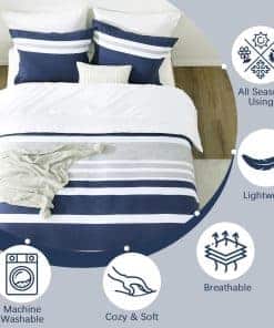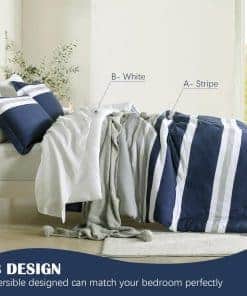3. Diseño moderno a rayas reversible Este juego de edredón presenta un diseño reversible, el frente es atemporal en gris y azul marino, y la parte trasera es en blanco simple, transmitiendo el minimalismo moderno y el casualismo cómodo. Simplemente dale la vuelta y obtendrás una experiencia diferente. Nuestros juegos de edredón son fáciles de combinar con diversos estilos de decoración del hogar, añadiendo comodidad simple y moda vibrante a tu dormitorio.