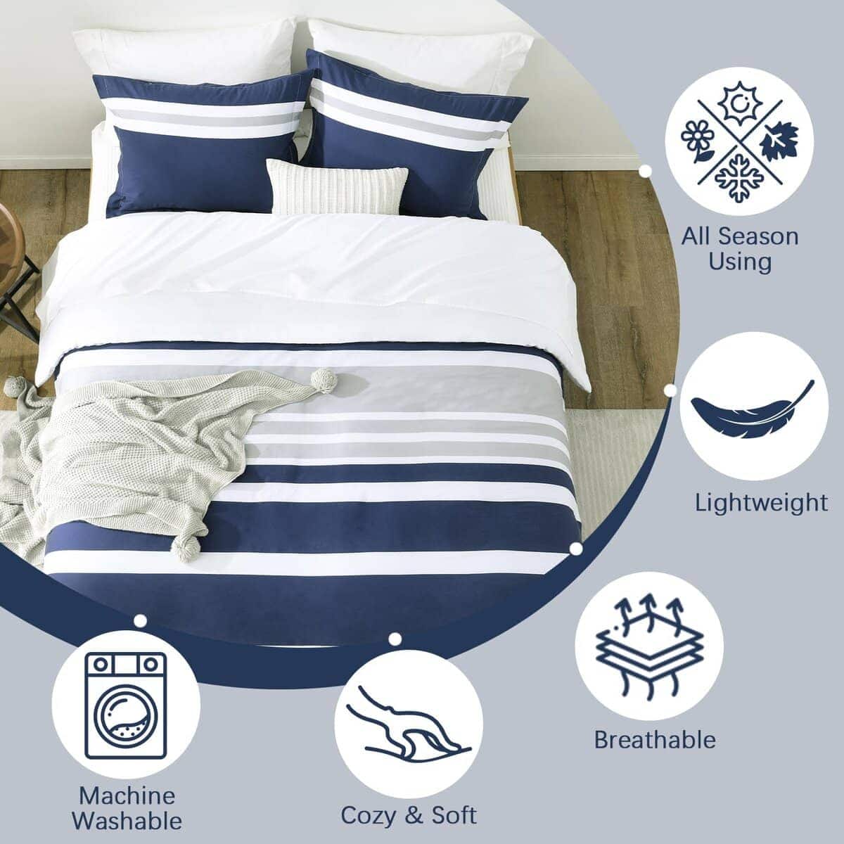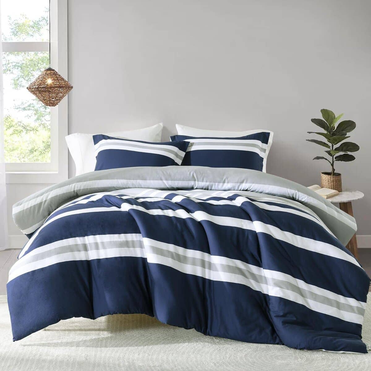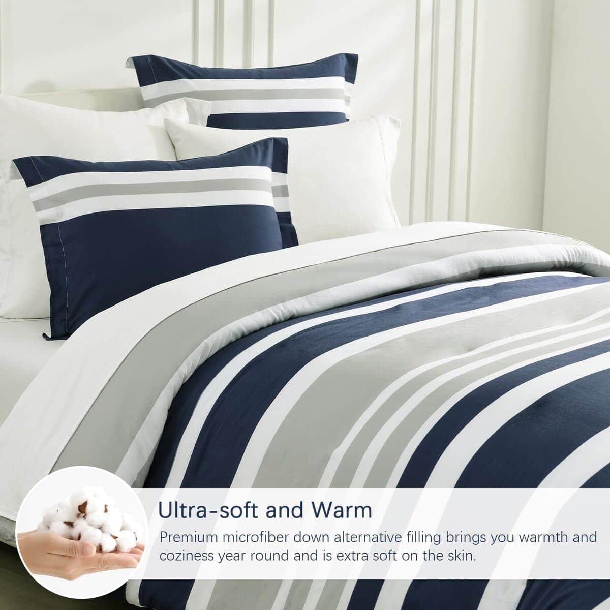 3. Diseño moderno a rayas reversible Este juego de edredón presenta un diseño reversible, el frente es atemporal en gris y azul marino, y la parte trasera es en blanco simple, transmitiendo el minimalismo moderno y el casualismo cómodo. Simplemente dale la vuelta y obtendrás una experiencia diferente. Nuestros juegos de edredón son fáciles de combinar con diversos estilos de decoración del hogar, añadiendo comodidad simple y moda vibrante a tu dormitorio.