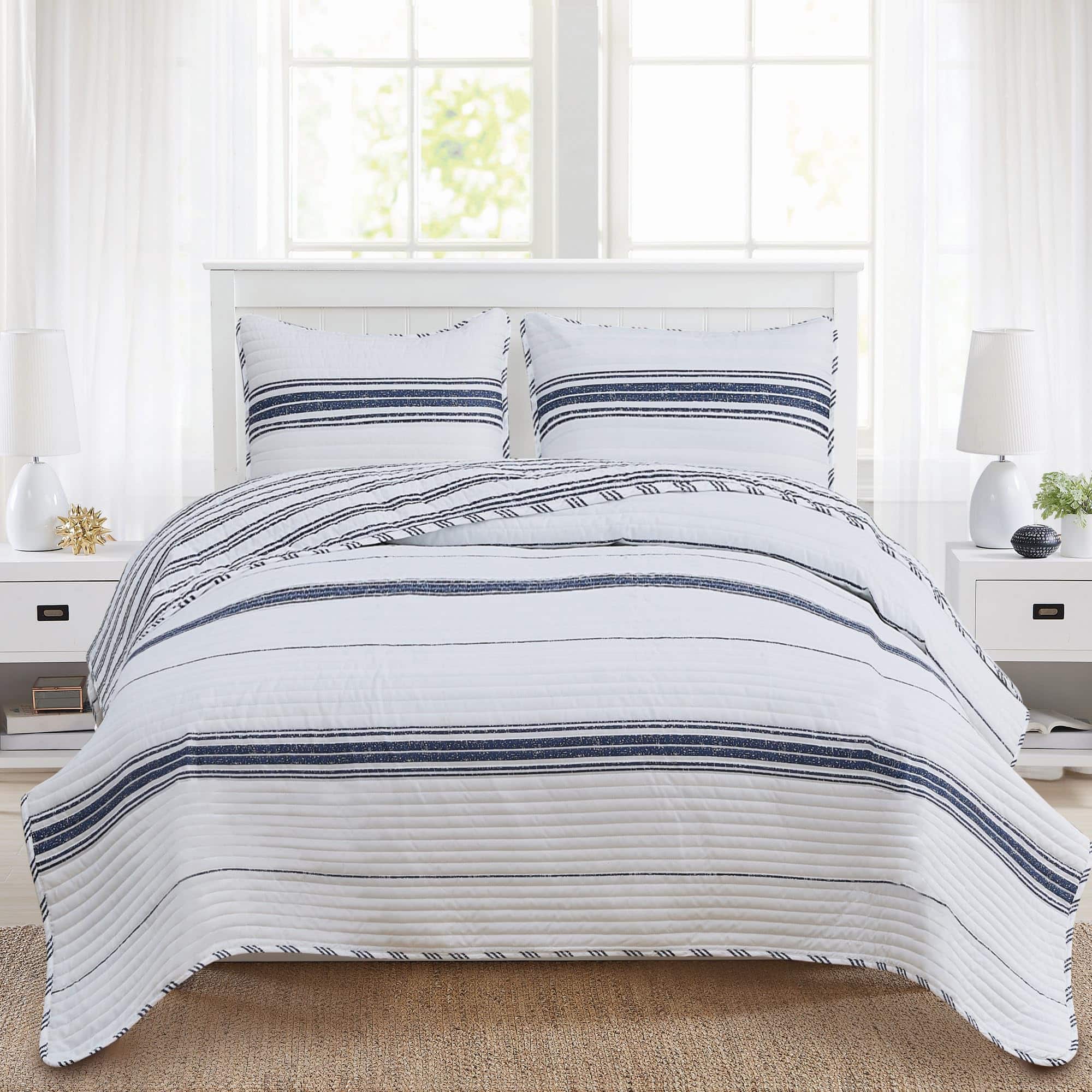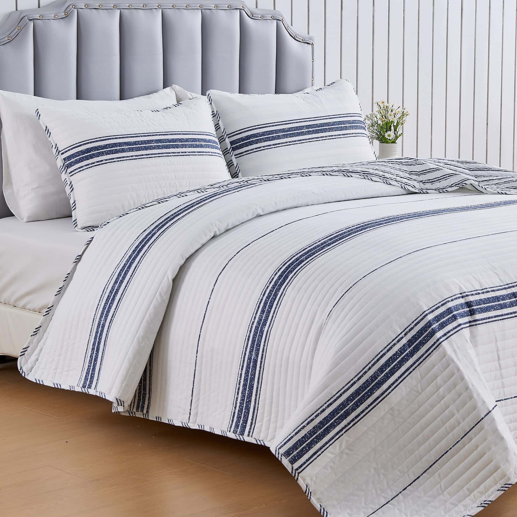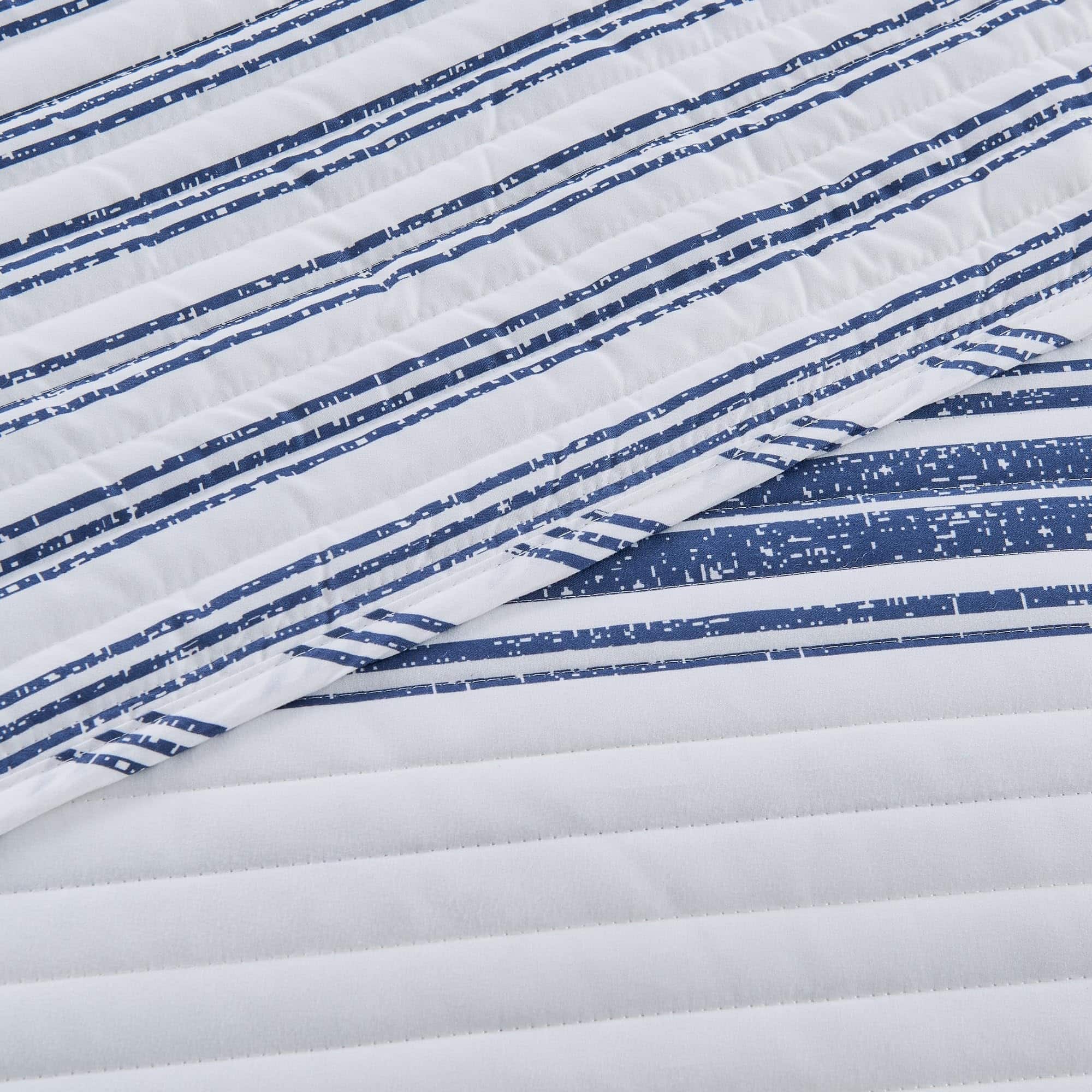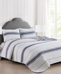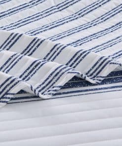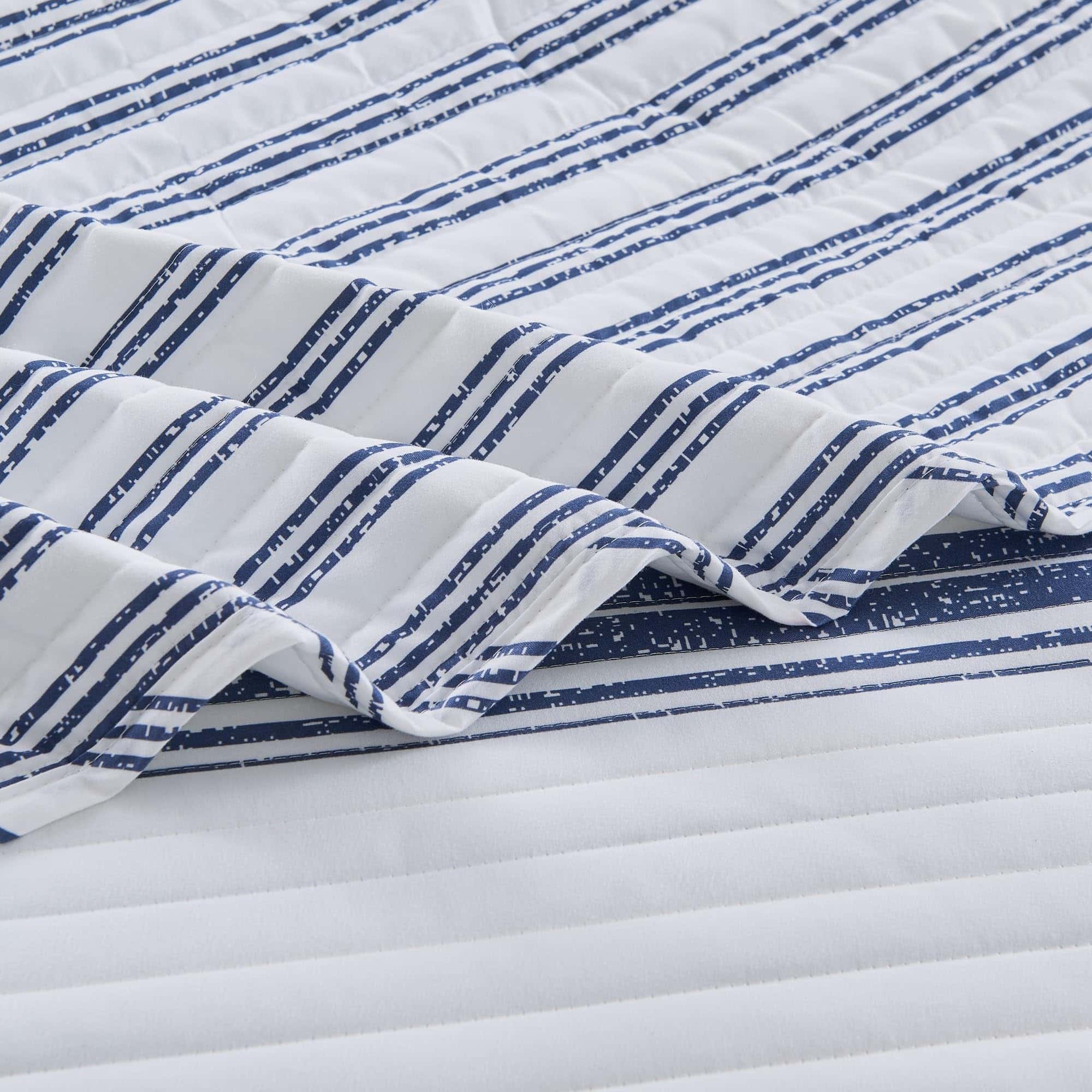 Agrega comodidad casual con un toque moderno a tu hogar con este hermoso juego de edredón a rayas reversible de 2 piezas de la colección Maeve de Market & Place. Confeccionado con un exterior de microfibra suave y transpirable y relleno de poliéster, este juego de edredón te mantiene acogedor y cómodo durante todo el año. Su diseño clásico a rayas azules y blancas con un patrón de rayas simple en el lado reverso es el complemento perfecto para colocar sobre tu cama. Este juego de edredón es lavable a máquina para un cuidado fácil y un uso duradero. Cada juego de edredón viene con un edredón y dos fundas de almohada (una funda para el tamaño individual). Elige entre tres tamaños: Individual: 1 edredón (90″ x 66″), 1 funda estándar (20″ x 26″), Queen: 1 edredón (90″ x 90″), 2 fundas estándar (20″ x 26″), King: 1 edredón (90″ x 108″), 2 fundas King (20″ x 36″)