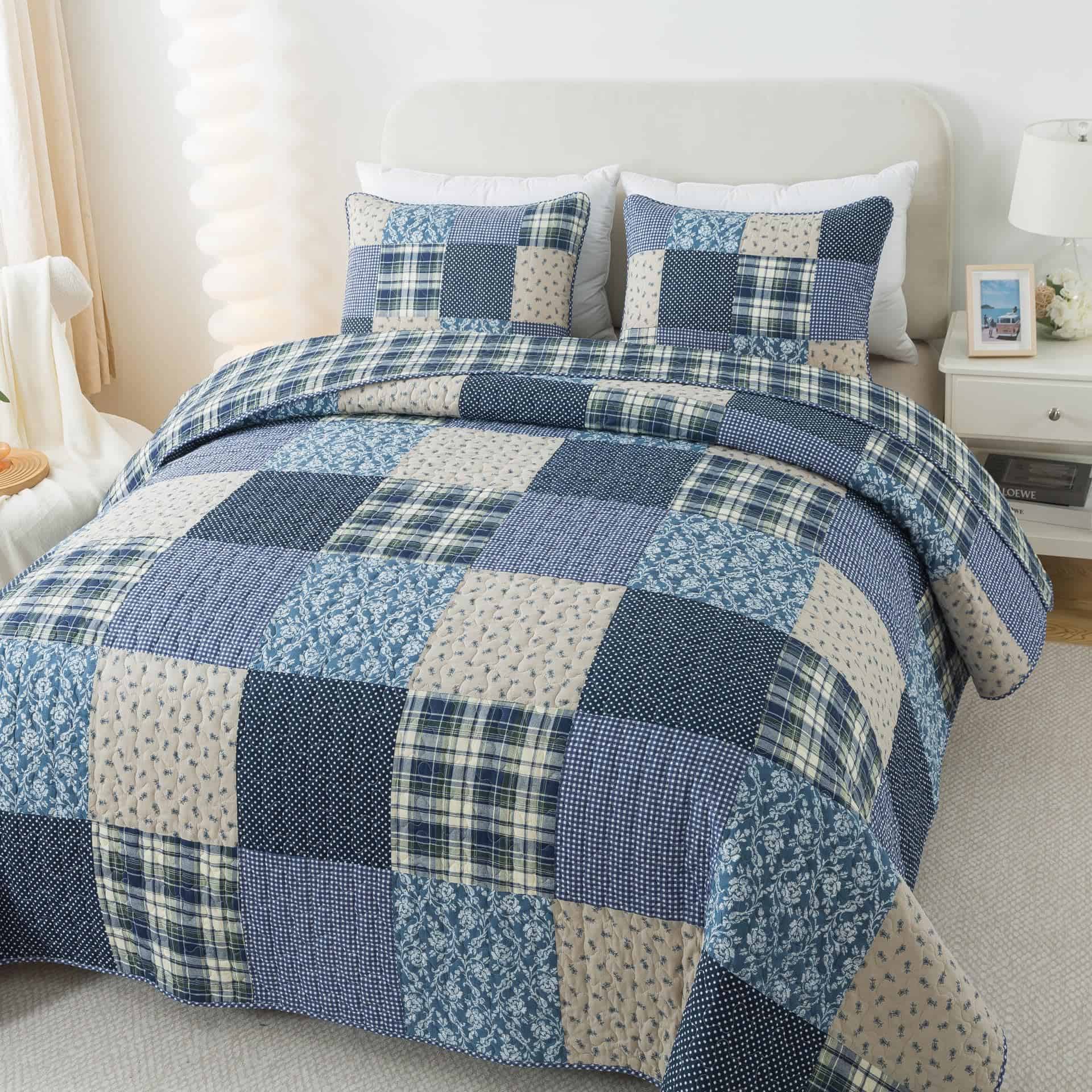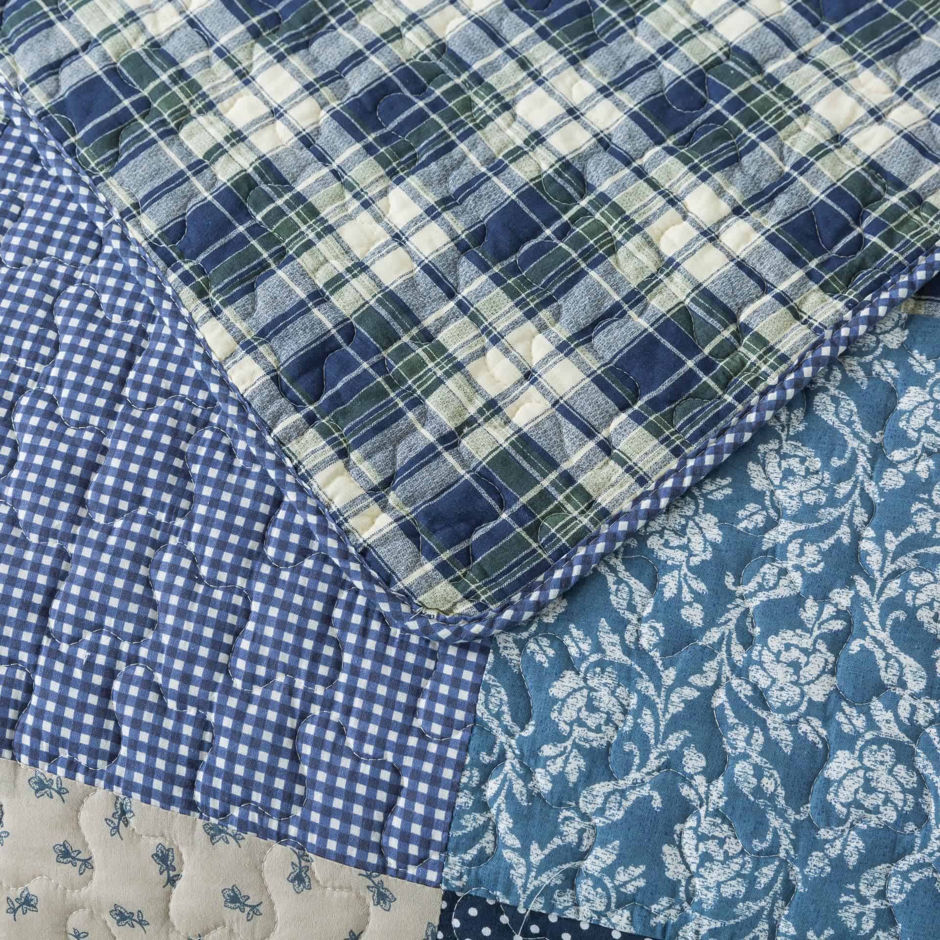 El juego de edredón Azul Symphony combina armoniosamente lunares, flores, cuadros y rayas en un lado, mientras que el otro lado exhibe un apacible cuadro verde y azul, ofreciendo versatilidad y estilo para adaptarse a tu estado de ánimo y decoración. Hecho enteramente de algodón 100%, este juego de edredón proporciona una comodidad suave y transpirable que te invita a abrazarte y relajarte. El relleno de algodón/poliéster (70% algodón y 30% poliéster) garantiza que el edredón sea ligero pero acogedor, haciéndolo ideal para usar durante todo el año. Diseñado para facilitar el cuidado, este juego de edredón se puede lavar y secar a máquina, manteniendo su belleza y suavidad lavado tras lavado. Ya sea que busques añadir un toque de elegancia tradicional de granja a tu dormitorio o busques una capa acogedora para noches frías, el Juego de Edredón Acolchado a Cuadros en Azul Symphony es una adición atemporal a tu colección de ropa de cama.