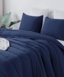 1. Tejido y Relleno – juego de edredón y colcha elaborado a partir de tejido de microfibra de poliéster 100% previamente lavado y cepillado. El tejido es ultra suave y cómodo al tacto. El relleno alternativo de plumón crea un edredón esponjoso y proporciona el calor perfecto para todas las estaciones. 2. Diseño y Decoración – Moderno y Simple. El acolchado en canales por todo crea un patrón geométrico simple, haciendo que el juego de edredón y colcha luzca de moda, moderno y impresionante. El juego de edredón y colcha hará que tu dormitorio sea elegante y con estilo, también es ideal para estudiantes universitarios, adolescentes y niños. 3. Detalles del Juego de Edredón: juego de edredón con un grosor de relleno perfecto, puede ser un edredón en sí mismo o una bonita capa con otras prendas de cama. La funda de la almohada a juego sin relleno y con costuras decorativas para un uso y cuidado fáciles, además de mantener la funda plana para que puedas dormir sobre ella. 4. Dimensiones: Set King: 1 edredón (104″x 90″), 2 fundas de almohada King (20″x 36″). 5. Cuidado Fácil: el juego de edredón y colcha es lavable a máquina en agua fría y tibia, secar a baja temperatura. Sin arrugas, planchar a temperatura más baja si es necesario.