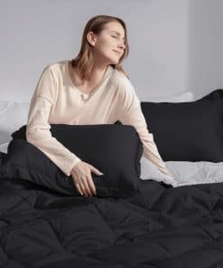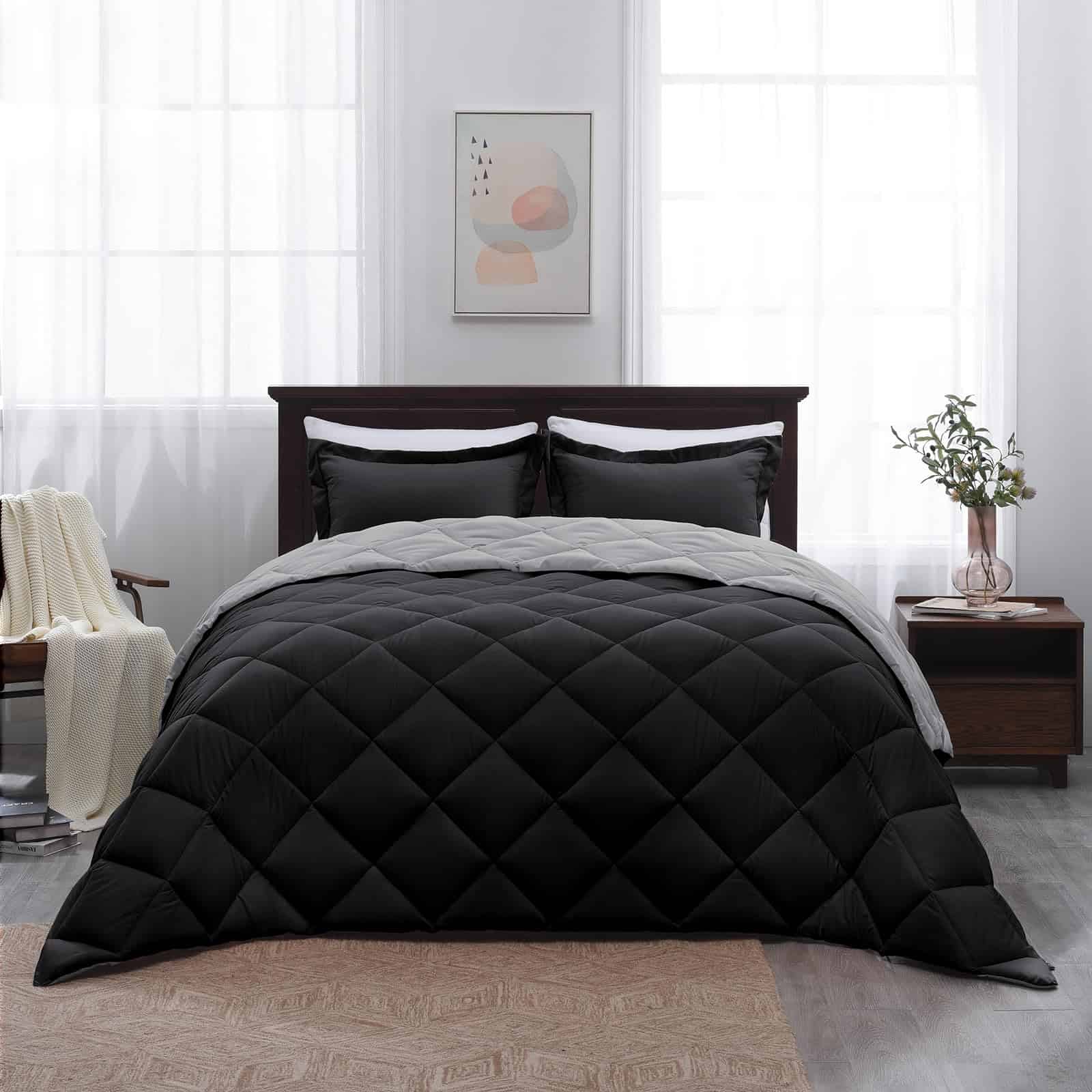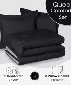 Presentando un diseño simple y elegante, nuestro set incluye 1 edredón ligero 88″x92″, 2 fundas de almohada 20″x26″ con ribete de 2 pulgadas y cierre invisible, perfecto para mejorar tu cama con estilo. Hecho con materiales de alta calidad, este juego de edredón negro queen tiene una textura suave perfecta para la comodidad durante todo el año. El diseño reversible del edredón te permite cambiar de estilo a tu gusto. Con un relleno de alta calidad y duradero, este juego de edredón negro y gris ofrece una suavidad excepcional y durabilidad, manteniendo la esponjosidad y forma del edredón por más tiempo. Lavable a máquina, este juego de edredón tamaño queen es una adición fácil de cuidar para tu hogar. Coordina fácilmente nuestros juegos de edredón con el estilo de tu habitación, añadiendo un toque de elegancia a tu espacio y proporcionando la máxima comodidad y calidez para una noche de sueño reparador.