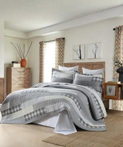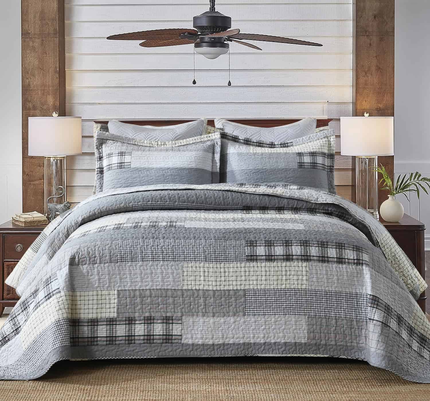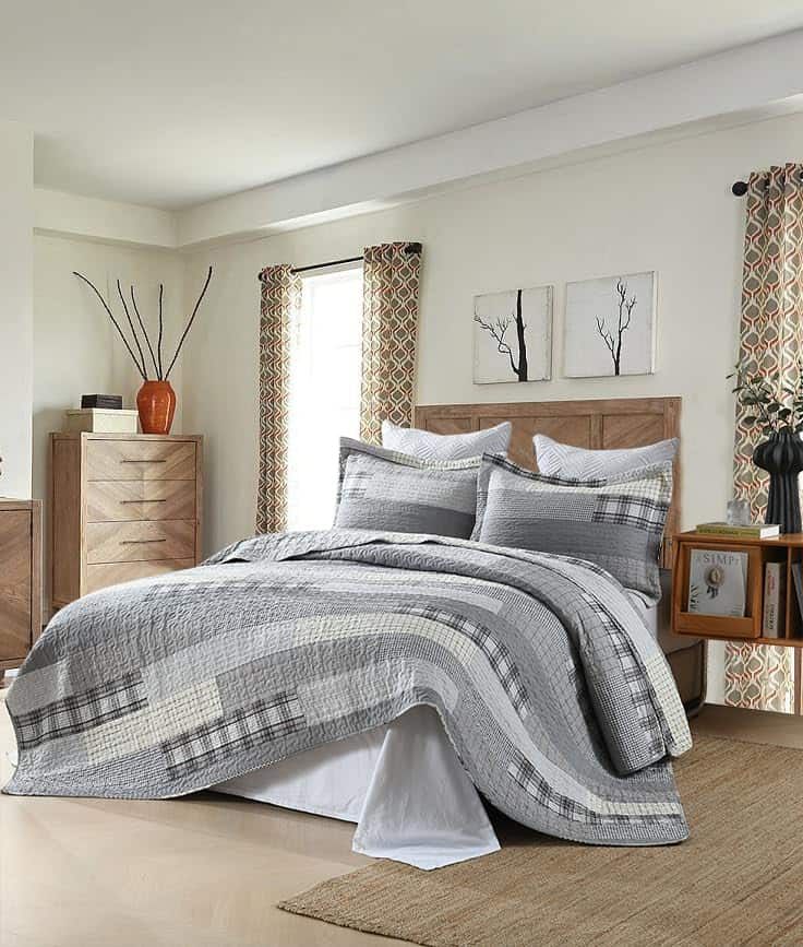 2. Patrón de Cuadros El clásico edredón de patchwork de cuadros es una impresionante combinación de colores gris, marrón, blanco y negro. La artesanía de doble costura hace que este cobertor de cama tamaño queen sea duradero, mantiene tu relleno uniforme y evita que se apelmace y se desplace, incluso después de lavarlo.