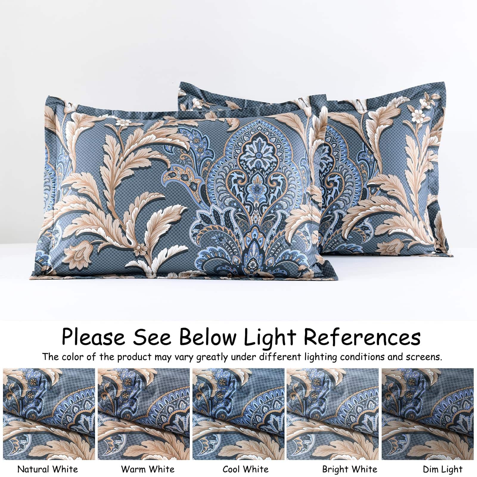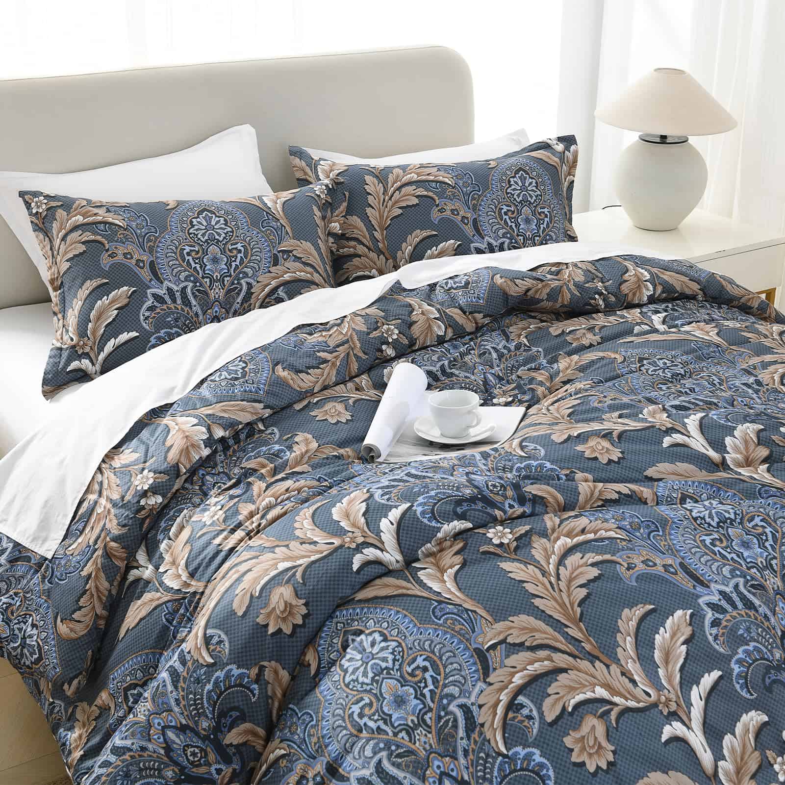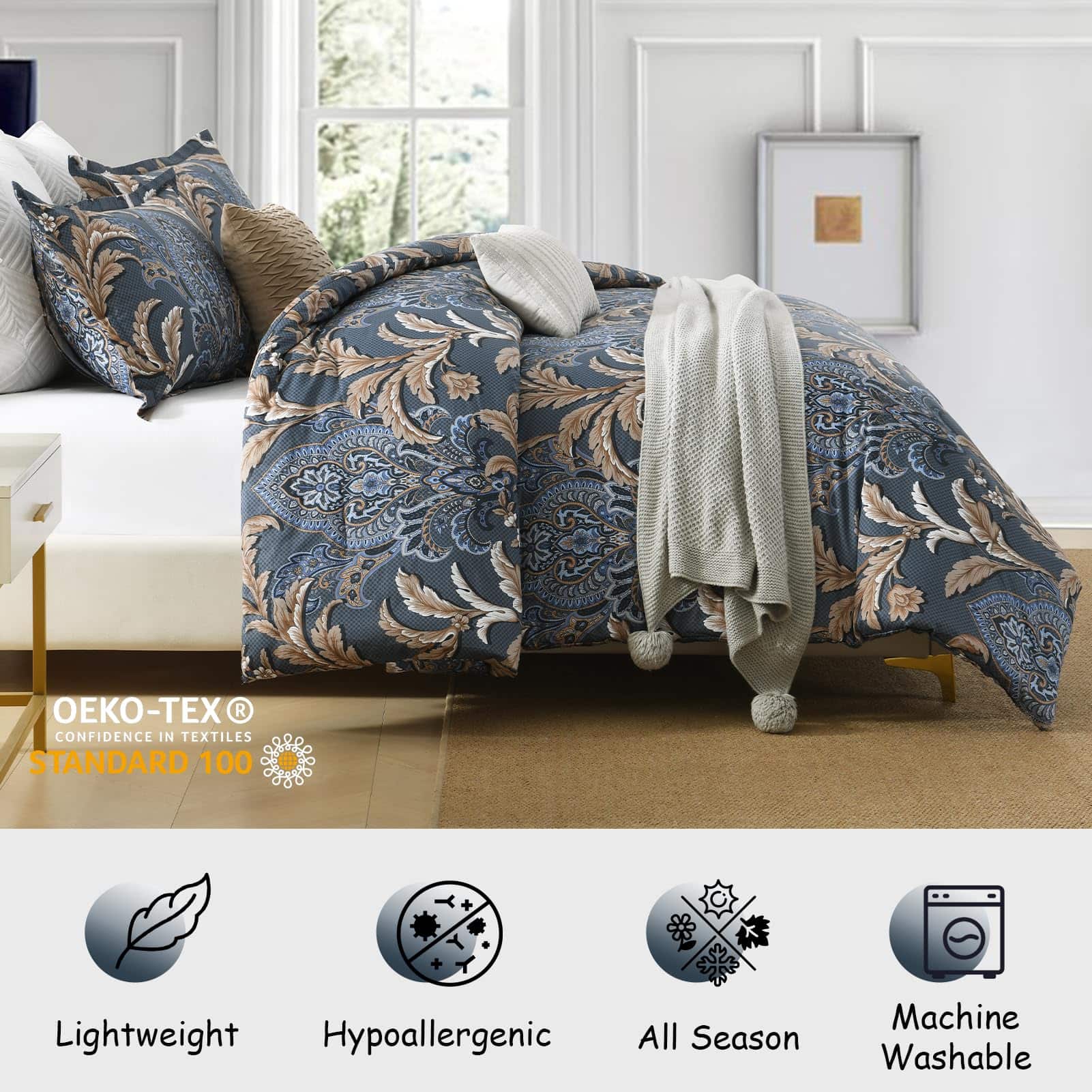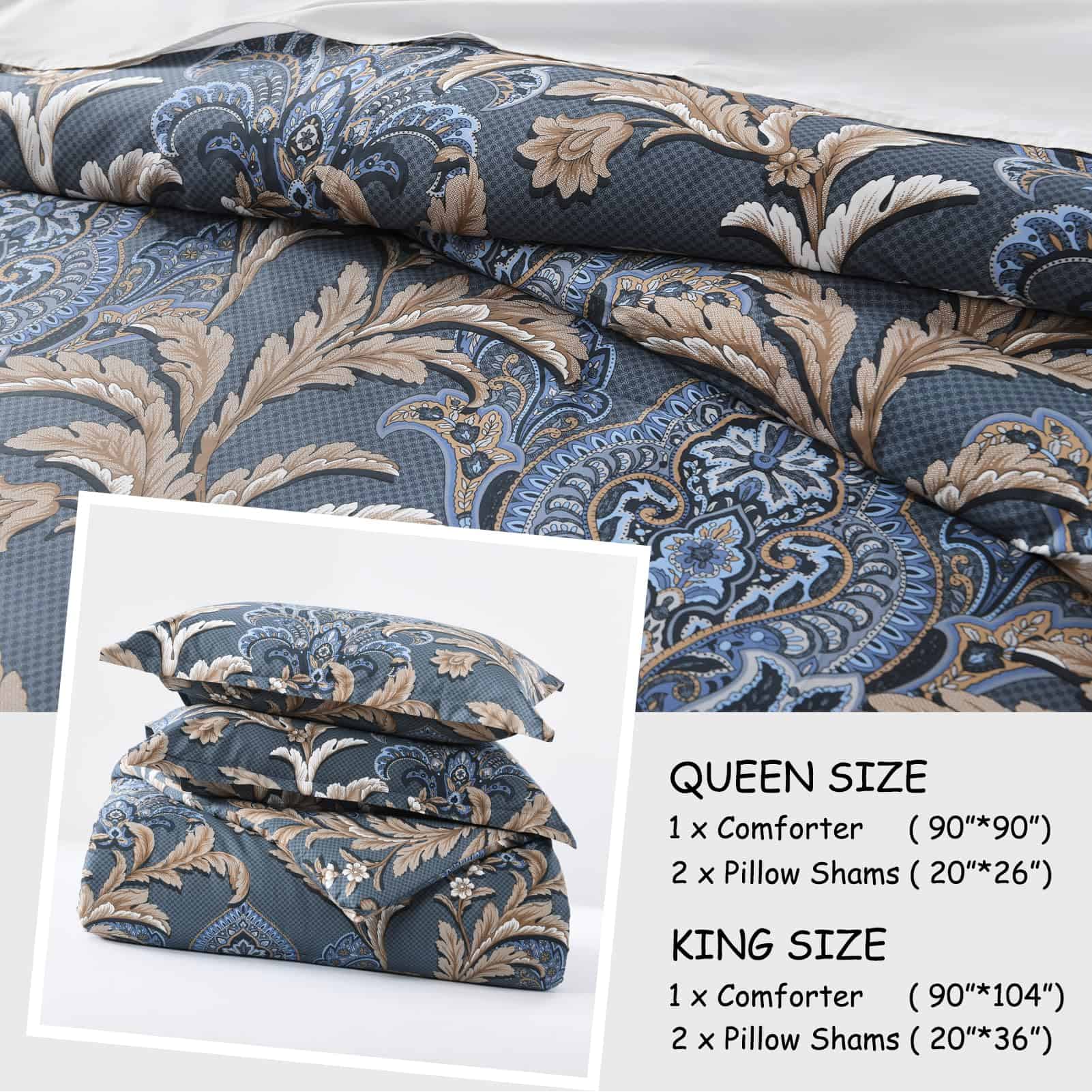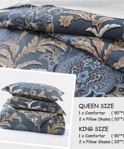 Este suave juego de edredón queen está elaborado con algodón de alta calidad y alto recuento de hilos para una suavidad excepcional y lujo. El patrón de damasco en azul marino y beige emana elegancia vintage, aportando un toque de lujo y sofisticación a tu espacio. Incluye 1 edredón (90″ x 90″) y 2 fundas de almohada (20″ x 26″). Certificado por OEKO-TEX, el tejido ofrece un tacto suave y minimiza las reacciones alérgicas. Lleno de premium de alta calidad alternativo, proporciona alta elasticidad y compresión, ofreciendo una sensación súper esponjosa para una experiencia de sueño tranquila y cómoda.
