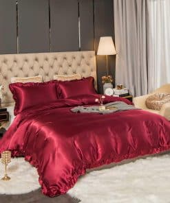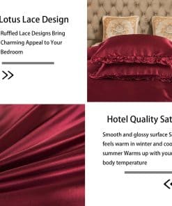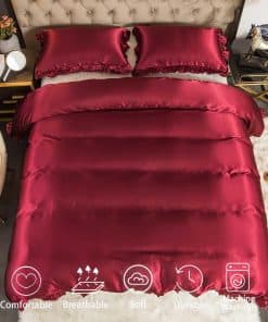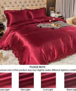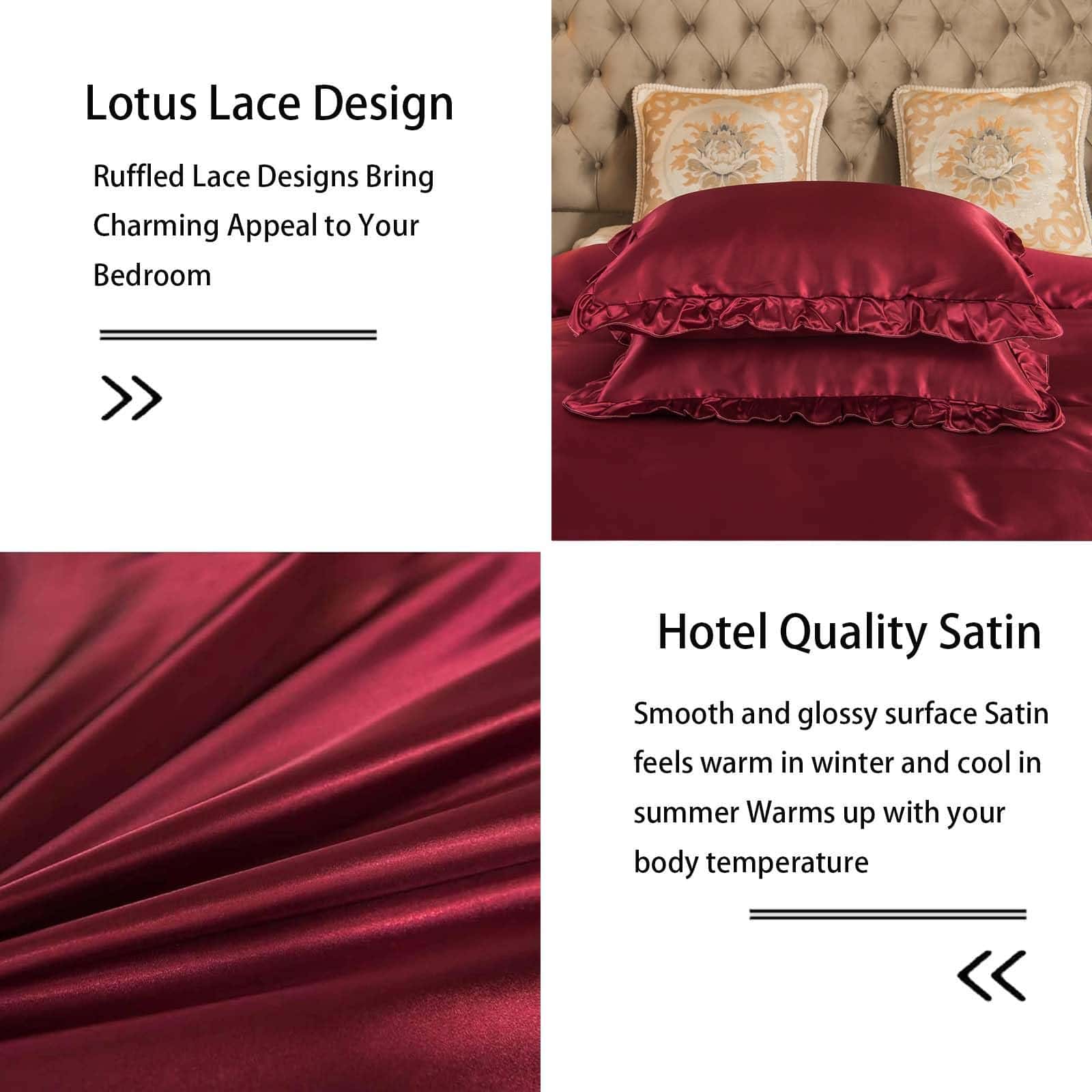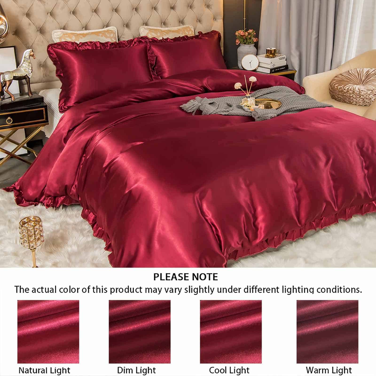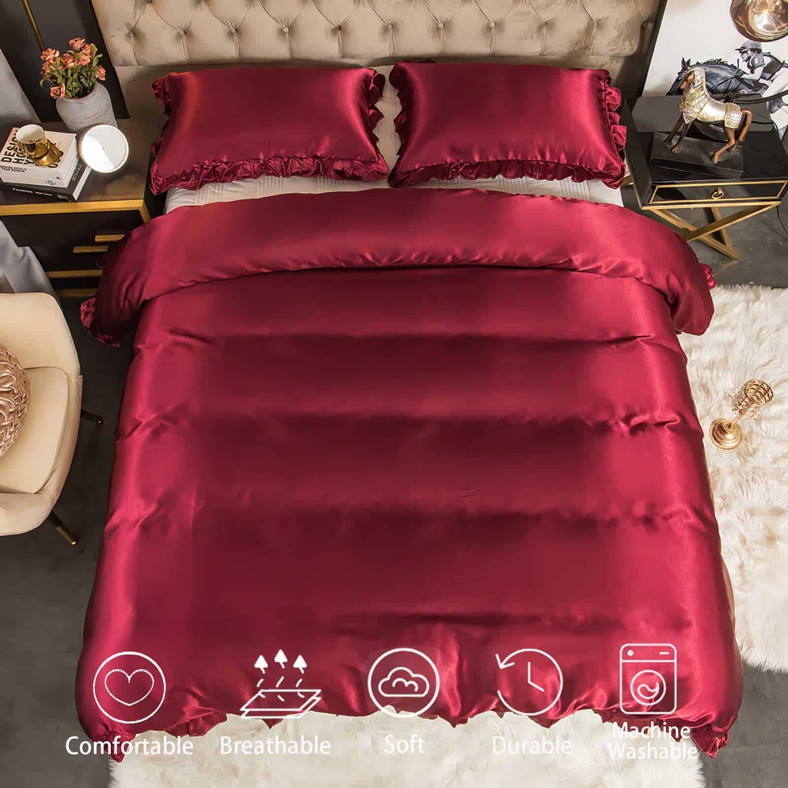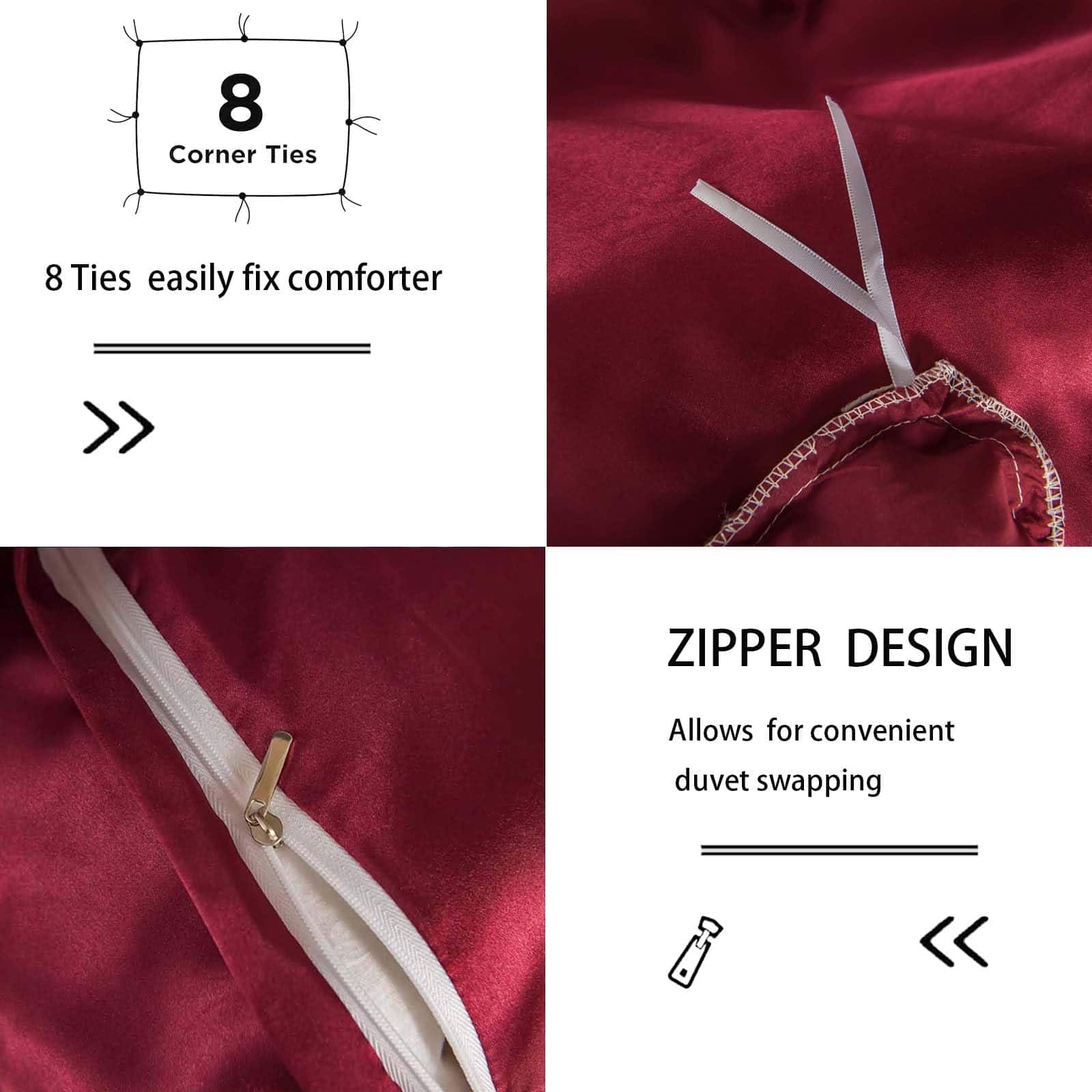 Tamaño de Reina Satén 1 Funda nórdica (90 pulgadas x 90 pulgadas), 2 Fundas de almohada (20 pulgadas x 30 pulgadas). Cierre de cremallera, 4 corbatas en las esquinas y 8 corbatas adicionales en cada borde de la funda nórdica.