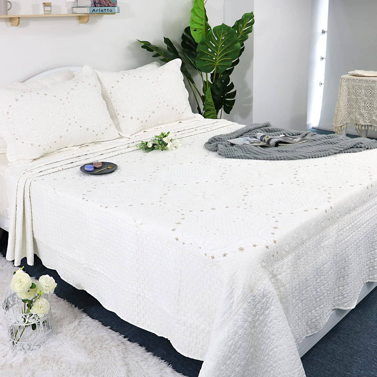3. HERMOSO EN LA CAMA Con colores sólidos y un patrón floral europeo vintage bordado en la colcha, este juego de edredón añade comodidad acogedora y estilo refinado a cualquier dormitorio. Diseño romántico y elegante, ¡simple pero elegante, gran combinación con cualquier decoración del hogar!