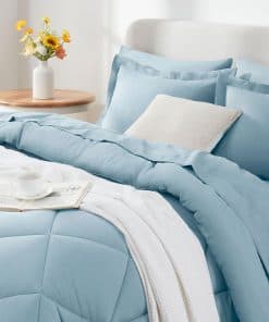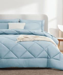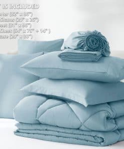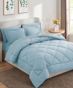 Juego de edredón completo con sábanas de 7 piezas en una bolsa de cama en un tono azul claro. Este juego de ropa de cama para todas las estaciones cuenta con una tela de microfibra premium que es suave y transpirable, absorbiendo el sudor de manera efectiva. El edredón está relleno con microfibra alternativa al plumón extremadamente suave, lo que lo hace amigable para las personas alérgicas. El diseño elaborado incluye una sábana ajustable con bolsillo profundo que se adapta a un colchón de hasta 14″ de profundidad, garantizando un ajuste perfecto sin importar cómo te muevas en la cama. El edredón tiene pespuntes en caja duraderos que ofrecen un aspecto sofisticado junto con simplicidad, y mantiene el relleno interior estable. El juego incluye un edredón de tamaño completo, 2 fundas de almohada, 1 sábana plana, 1 sábana ajustable y 2 fundas de almohada, todo empaquetado en una bolsa al vacío para facilitar el almacenamiento. Este juego de cama es fácil de cuidar, ya que es lavable a máquina, lo que te ahorra tiempo y energía. Para mantener su suavidad y evitar que se agrupe, se recomienda lavarlo en el ciclo suave con agua fría y secarlo al sol o en secadora a baja temperatura según sea necesario. Disfruta de noches de sueño reconfortantes y acogedoras con nuestros juegos de ropa de cama. No dudes en contactarnos si tienes alguna pregunta, nuestro compromiso es brindarte productos de calidad y un servicio excepcional