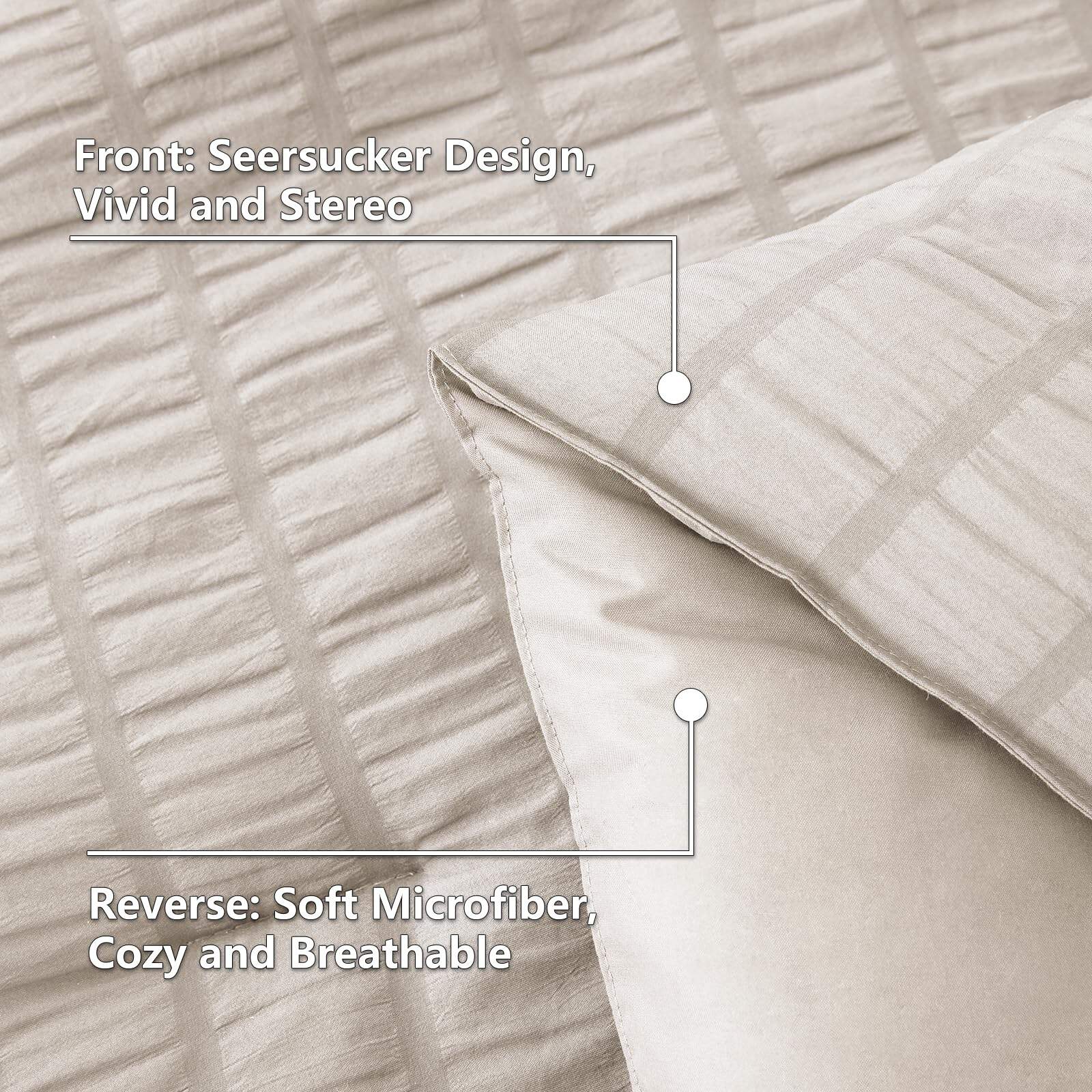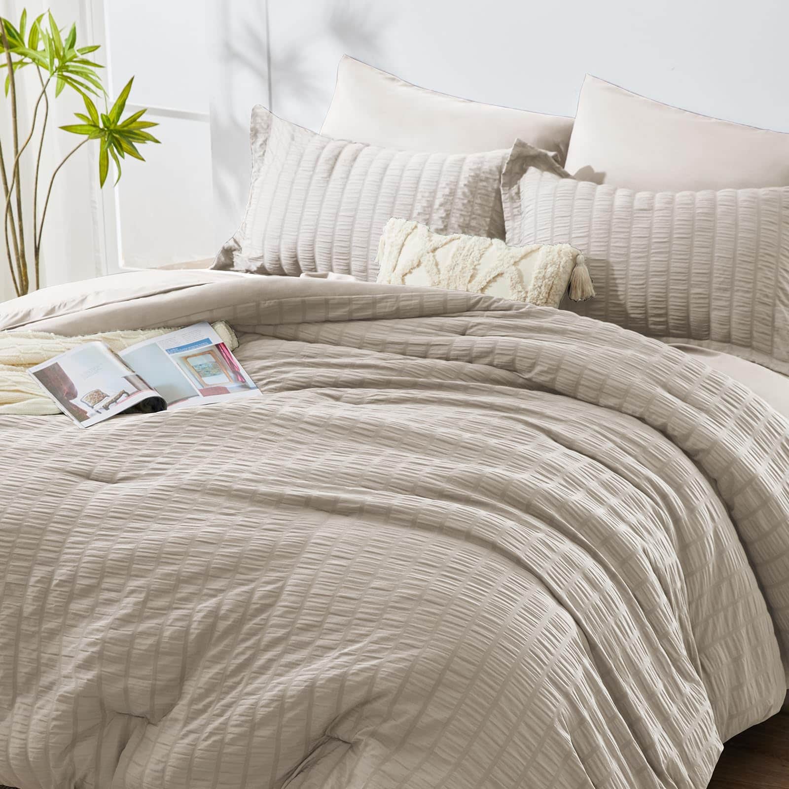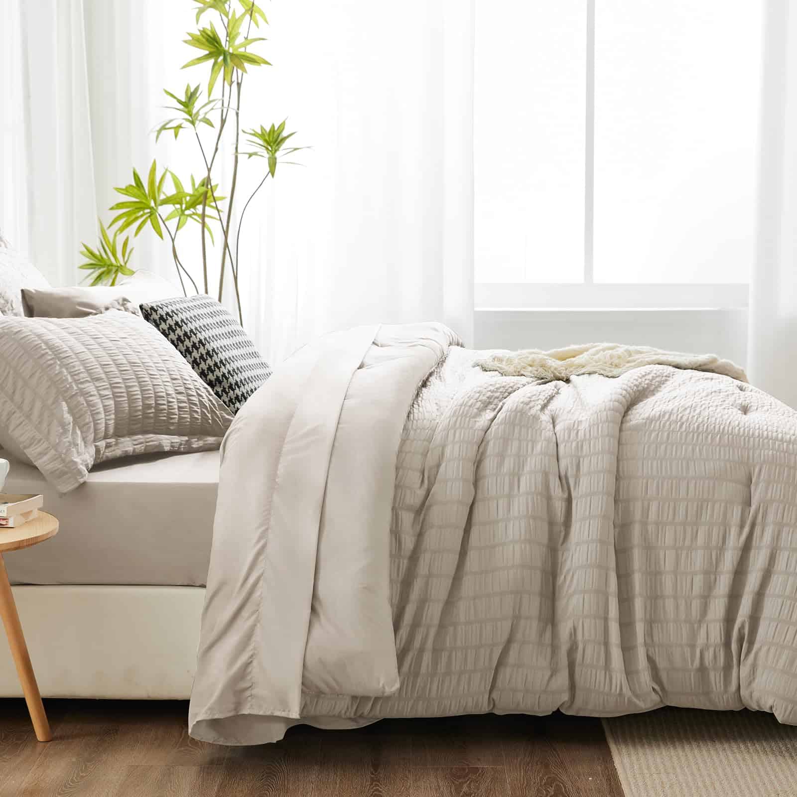 El diseño es elaborado, la sábana ajustable bolsillo profundo elástico se adapta a un colchón de hasta 14″ de profundidad. Eso siempre mantendrá el agarre sin importar cómo te gires en tu cama. Los tonos beige suaves añaden un toque de color a este aspecto elegantemente simplificado. Se incluye en el juego de cama de 7 piezas tamaño completo de seersucker 1 Edredón 82″x86″, 2 Fundas de Almohada 20″x26″, 1 Sábana Plana 81″x96″, 1 Sábana Ajustable 54″x75″+14″ y 2 Fundas de Almohada 20″x30″. Nuestro juego de cama en una bolsa está empaquetado en una bolsa de vacío, por lo que puede secarlo a baja temperatura o golpear suavemente el edredón mientras lo hornea al sol para que vuelva a estar esponjoso. El juego de ropa de cama es lavable a máquina, lo que puede ahorrarle más tiempo y energía. Para suavidad durante todo el año y evitar que se agrupe, se recomienda lavarlo en el ciclo suave con agua fría, secarlo al sol o secarlo a máquina a baja temperatura según sea necesario. Permítanos que nuestros juegos de edredón sigan brindándole a usted y a su familia un sueño acogedor. El color del producto puede verse muy diferente bajo diferentes condiciones de iluminación. Como su satisfacción es de suma importancia para nosotros, Cozylux se compromete a ofrecerle productos premium y un servicio atento. No dude en contactarnos si tiene alguna pregunta sobre nuestros productos. Intentaríamos resolver los problemas lo antes posible.