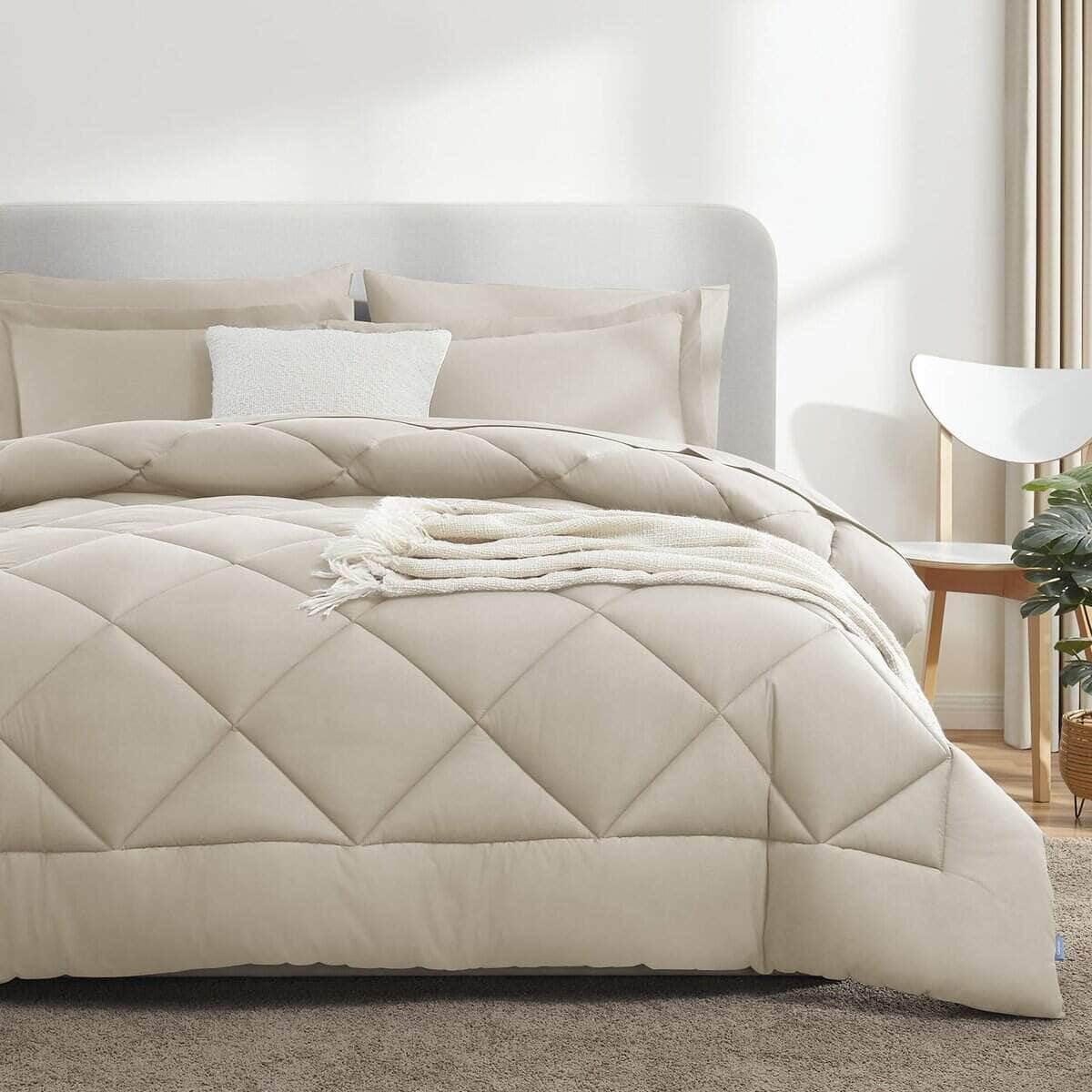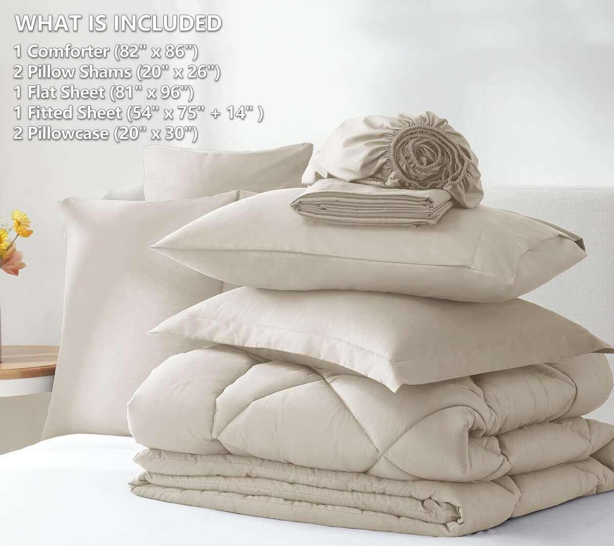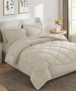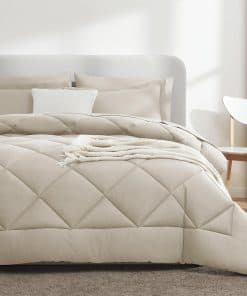 El juego incluye un edredón de tamaño completo, dos fundas de almohada, una sábana plana, una sábana ajustable y dos fundas de almohada, todo en un elegante color avena que combina fácilmente con la decoración de tu habitación. El edredón presenta un acolchado de caja duradero que no solo ofrece un aspecto sofisticado, sino que también mantiene el relleno estable en su interior.