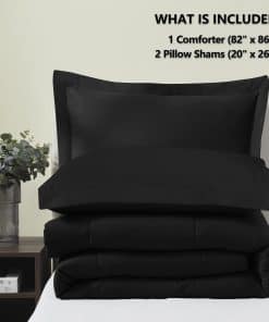 El edredón está hecho de una sola pieza de poliéster, lo que lo hace más duradero que la mayoría de los edredones similares en el mercado. Con tecnología de puntadas en caja, los rellenos de este juego de edredón se mantienen en su lugar sin preocupaciones de fugas de relleno o hilos sueltos. El juego de edredón completo incluye 1 edredón de 82×86 pulgadas y 2 fundas de almohada de 20×26 pulgadas, lo que lo convierte en el complemento perfecto para tu cama.
